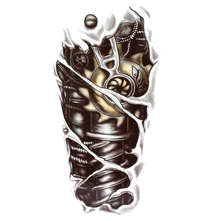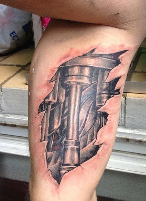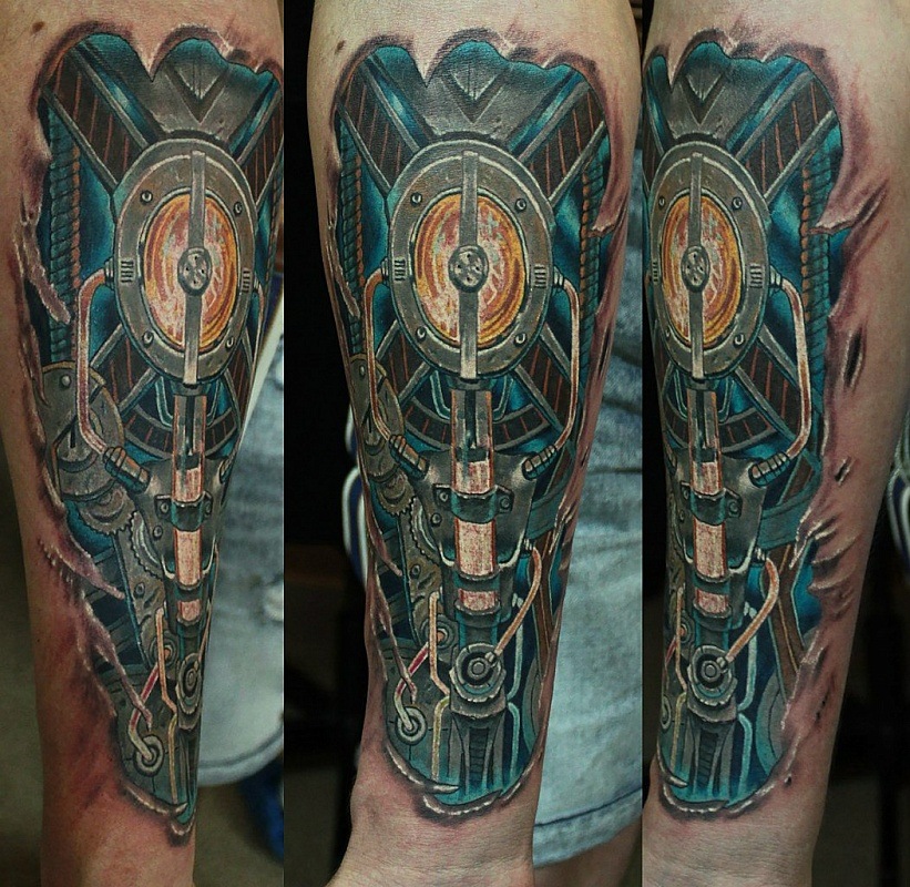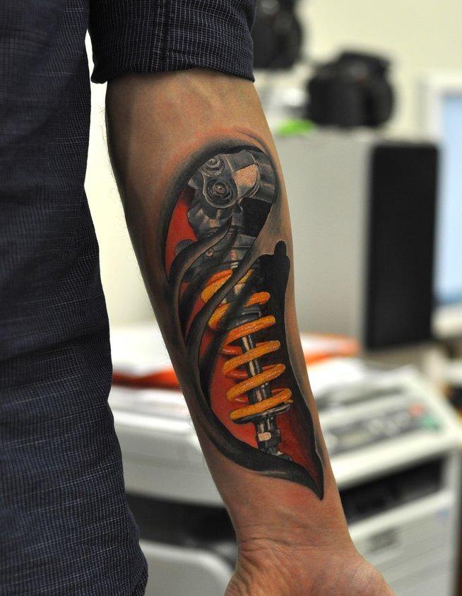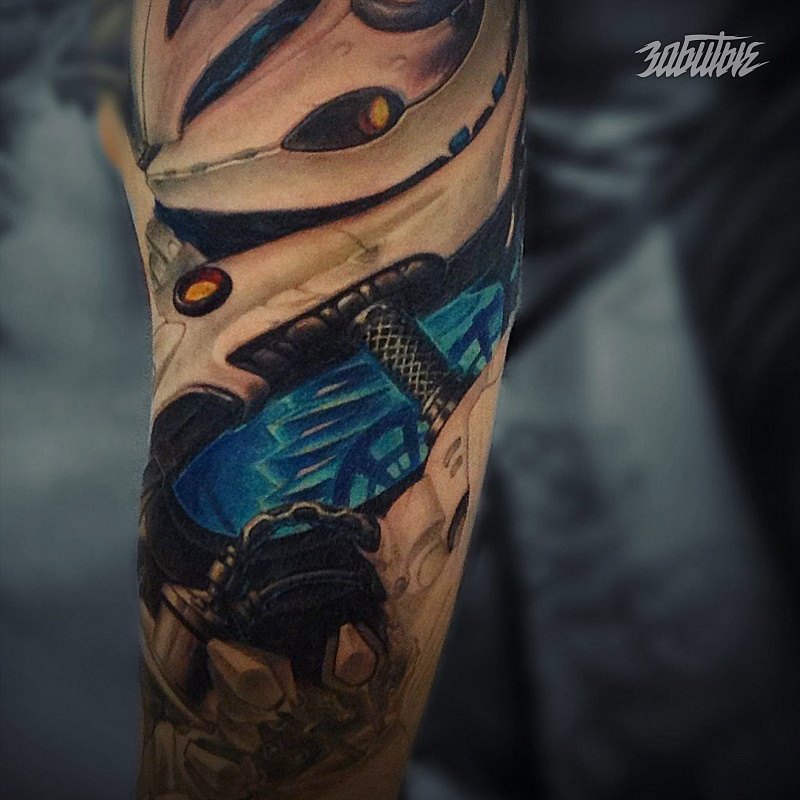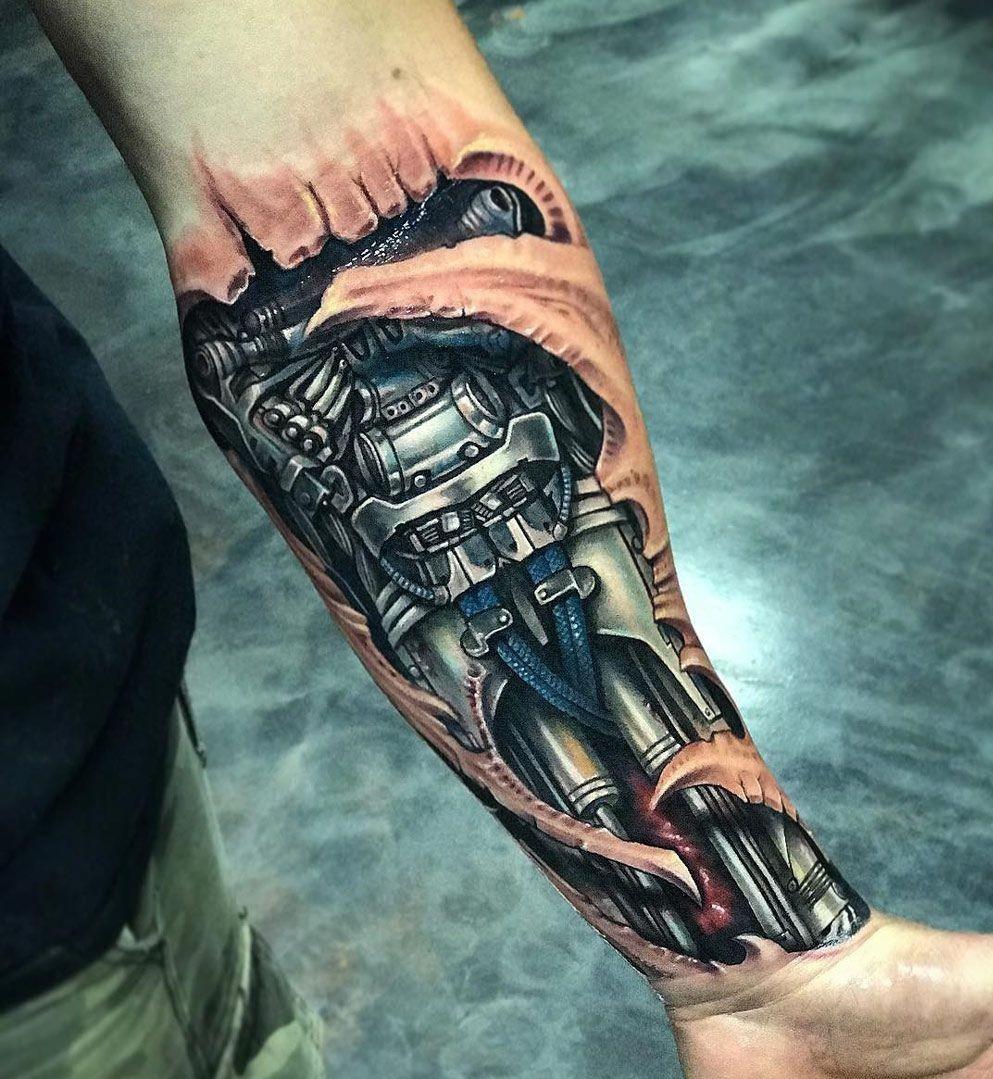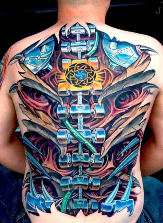 La biomécanique est un style relativement jeune dans l'art du tatouage. Ce format de tatouage original est devenu populaire à la fin du XXe siècle. Biomécanique du tatouage - l'image sur le corps de divers mécanismes, comme si elle déchirait la peau. Des engrenages en acier sophistiqués, des engrenages, des pistons et divers engrenages sont la base d'un tatouage biomécanique. La mode pour un tel tatouage a grandi avec le développement du progrès technologique. Les thèmes de l'intelligence artificielle, des robots et des livres de science-fiction ont suscité l'intérêt du public pour les tatouages dans le style de la biomécanique, ce qui rapproche les gens des cyborgs et des robots.