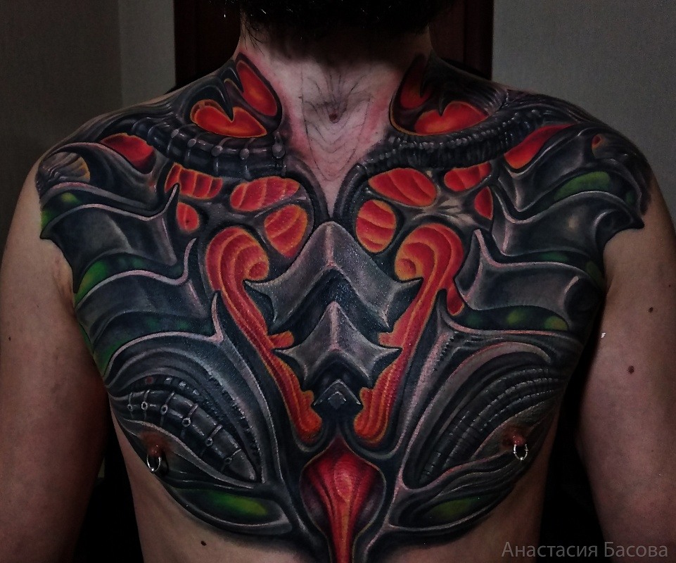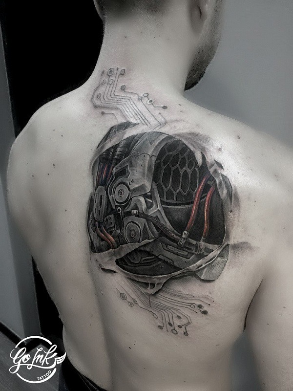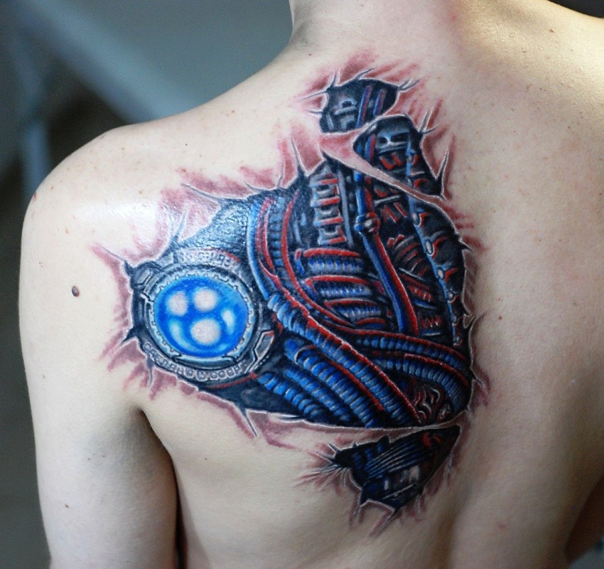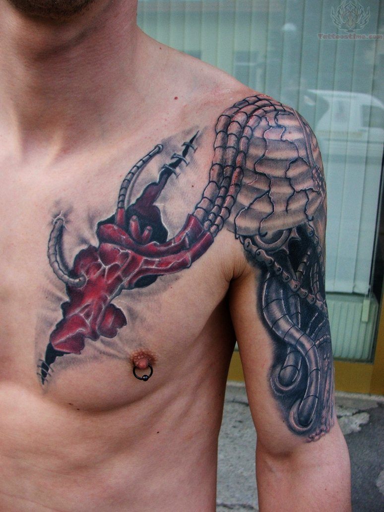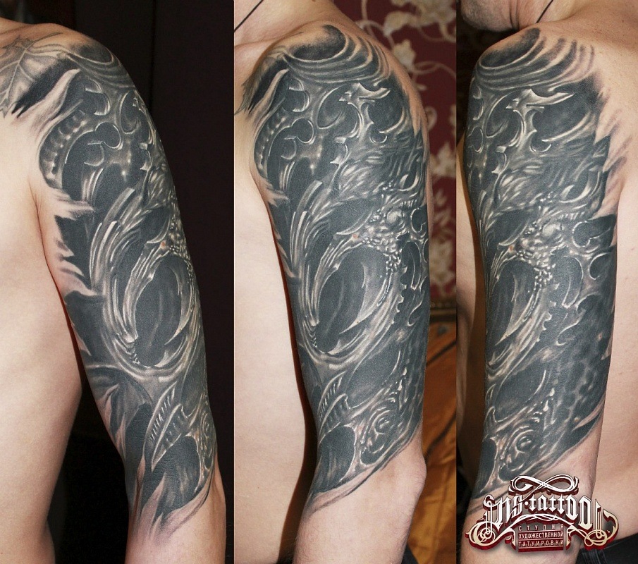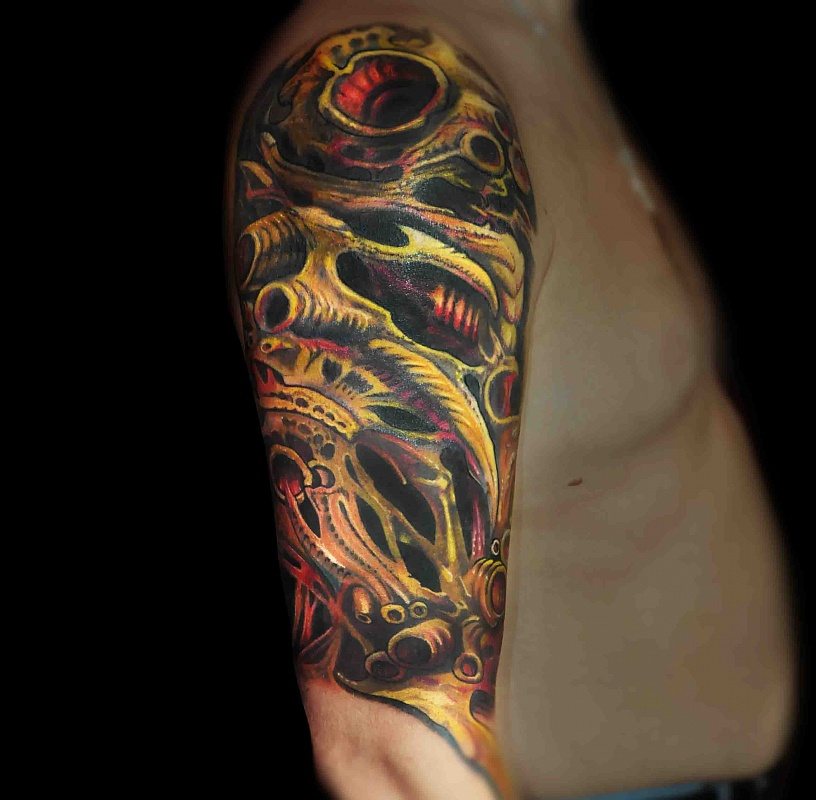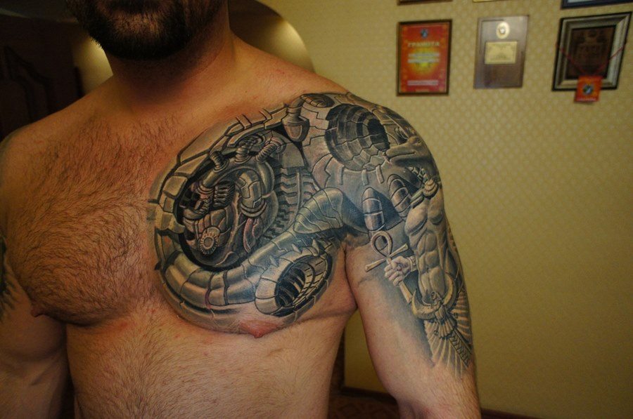 La biomécanique du tatouage, réalisée sur l'épaule, est très élégante et impressionnante. Cet effet envoûtant est créé par le fait que les muscles de l’articulation de l’épaule complètent le tatouage et lui donnent du volume. Le dessin de style biomécanique est tridimensionnel et réaliste.