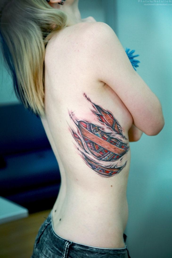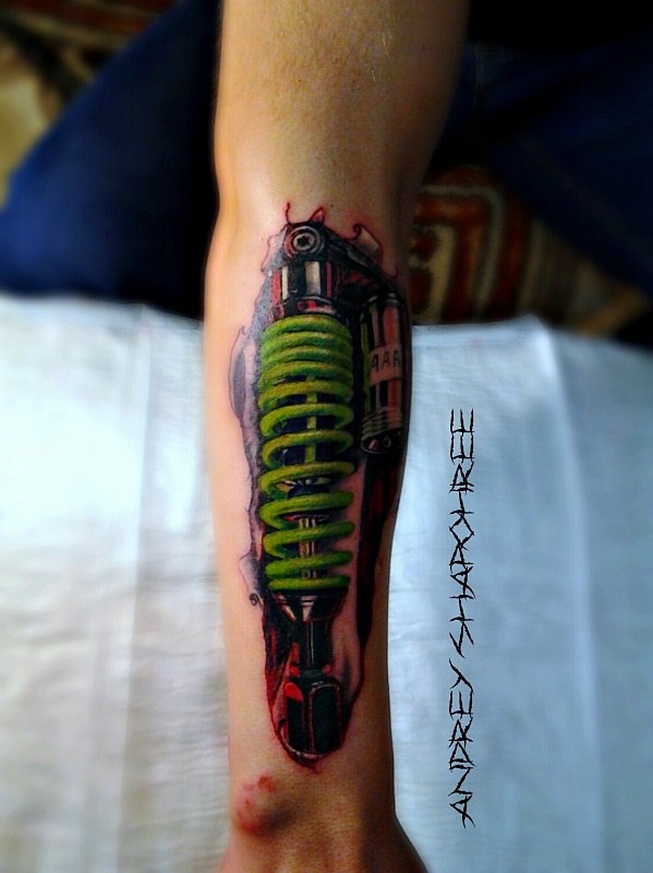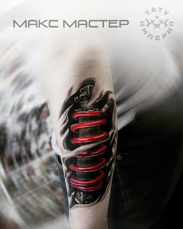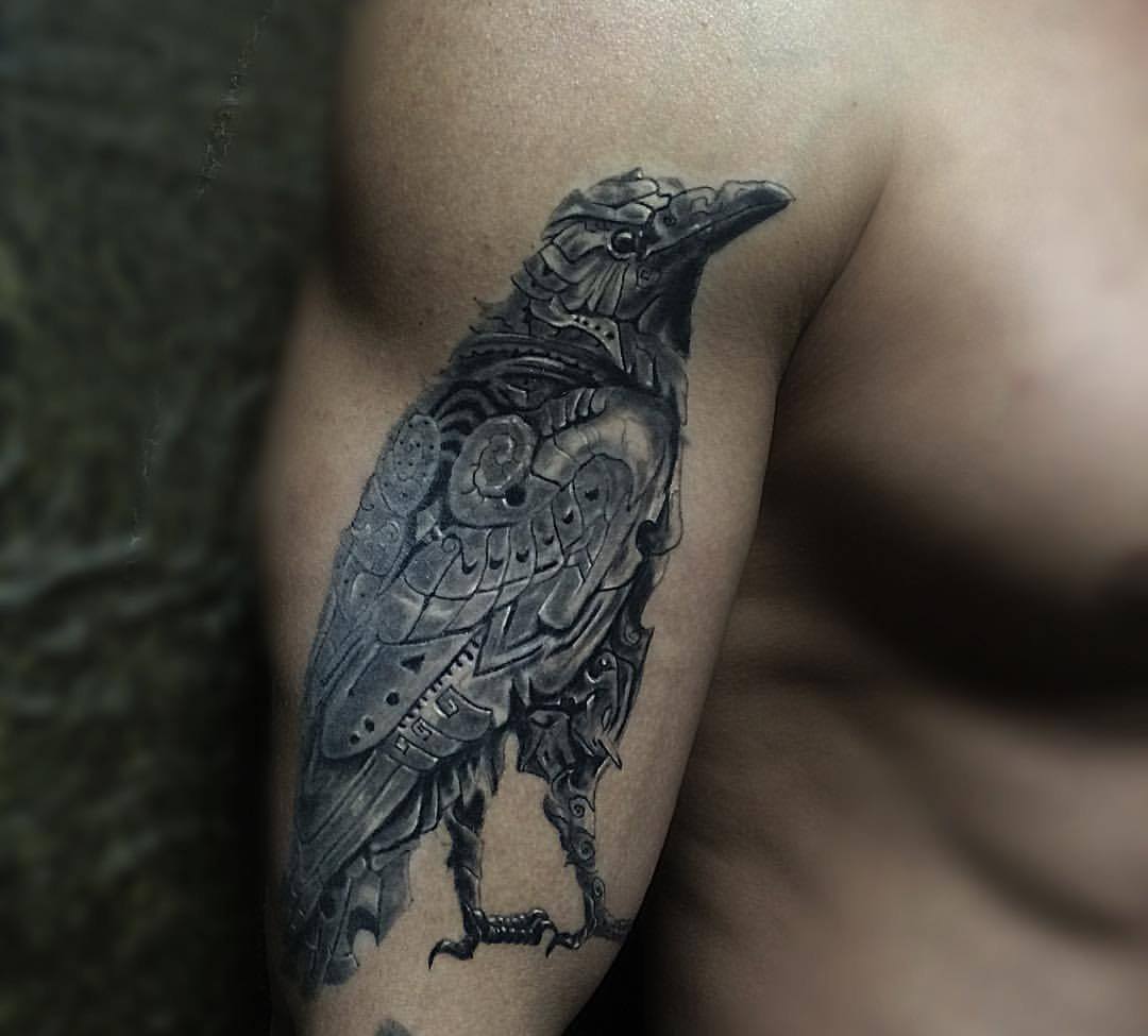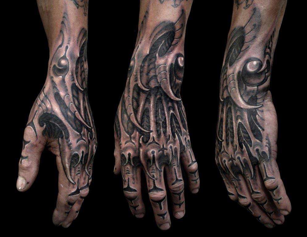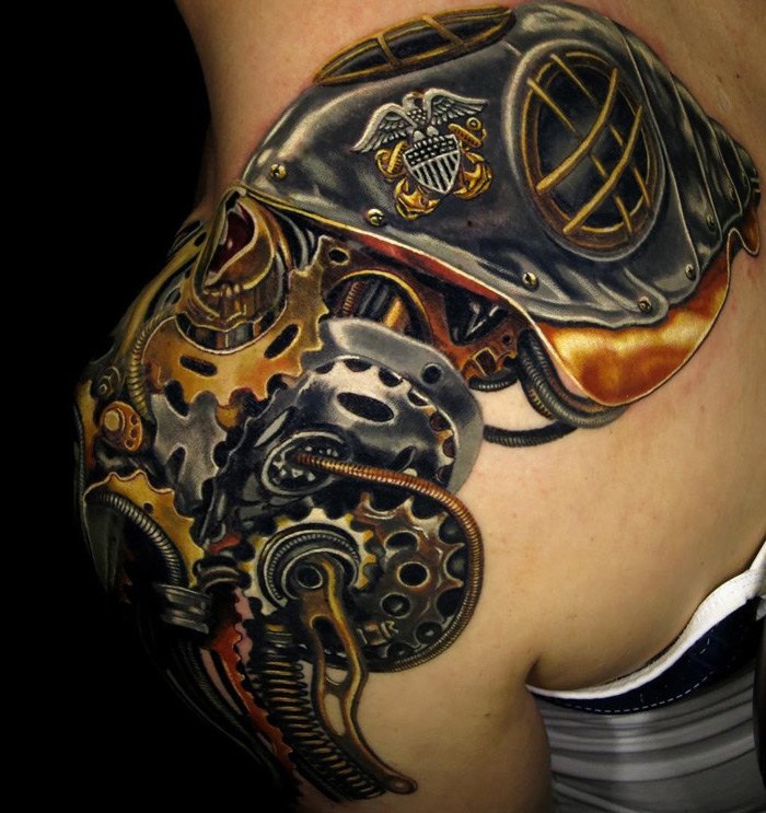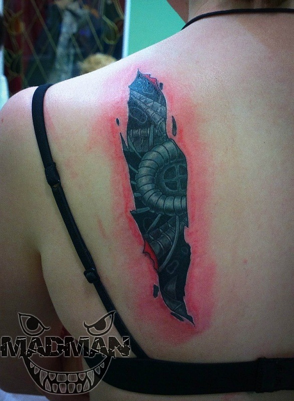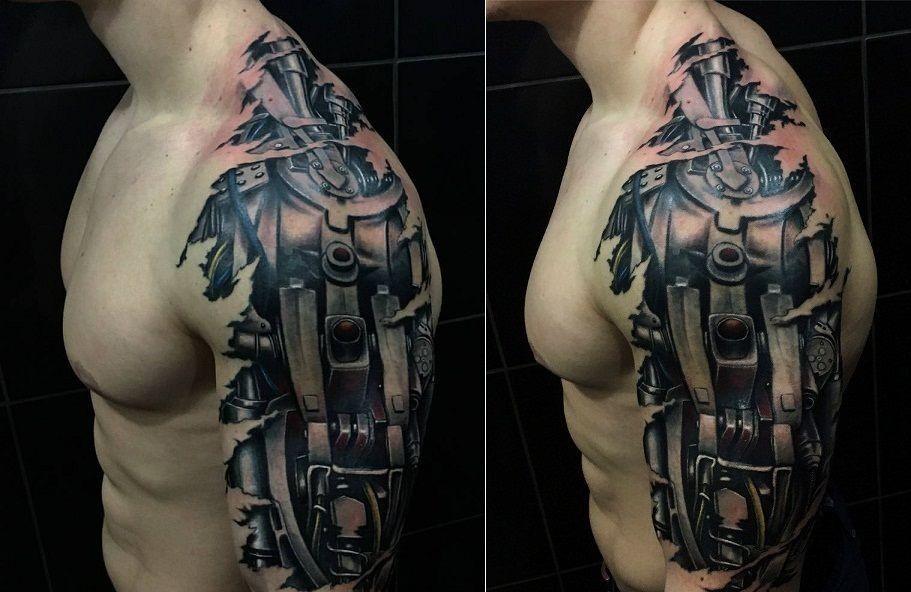 La biomécanique du tatouage, réalisée sur l'épaule, est très élégante et impressionnante. Cet effet envoûtant est créé par le fait que les muscles de l’articulation de l’épaule complètent le tatouage et lui donnent du volume. Le dessin de style biomécanique est tridimensionnel et réaliste.