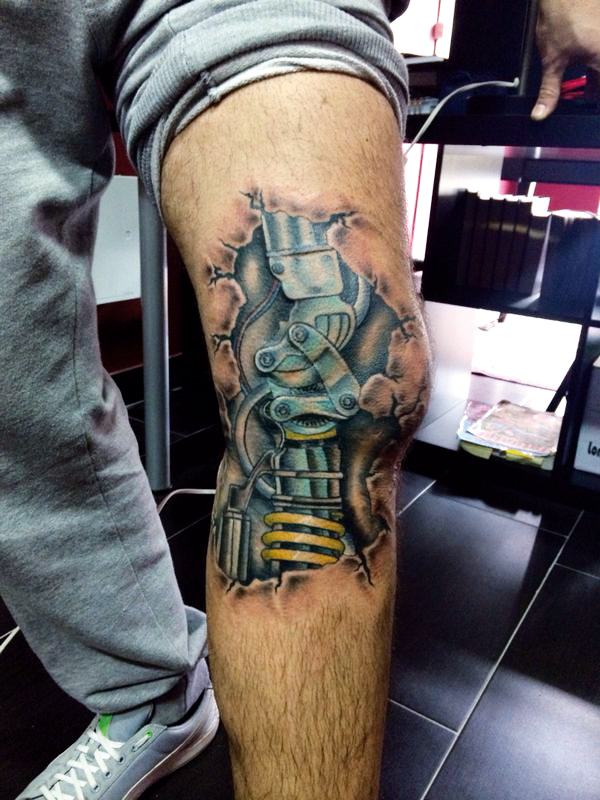 La biomécanique du tatouage, réalisée sur la jambe, semble très rentable et attrayante. L'image de nombreux engrenages, pistons et fils est idéale pour les tatouages sur la jambe. Ici, vous pouvez représenter un tatouage d'une taille plus grande que sur le bras ou l'épaule, ce qui signifie que le nombre de détails du «mécanisme» peut être beaucoup plus grand. Le motif volumineux et allongé aura fière allure sur la jambe, en commençant par la hanche et se terminant par le bas de la jambe.