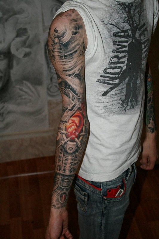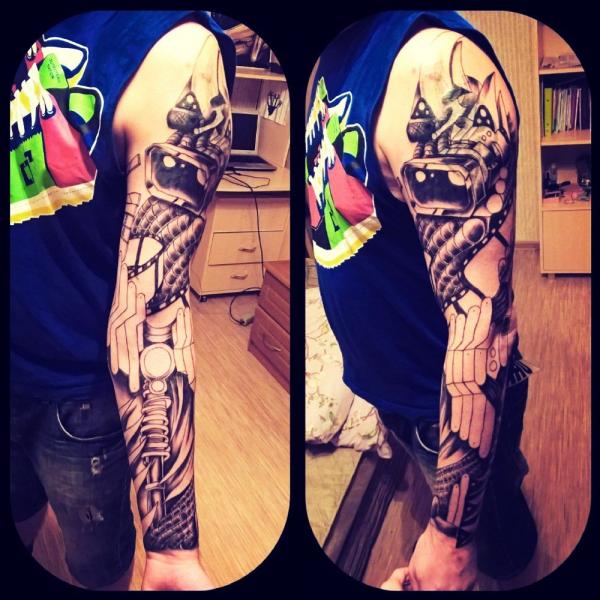 Tatouage "manche", fabriqué dans le style de la biomécanique - travail minutieux, long et beau. Si vous avez choisi un tel tatouage pour vous-même, vous devez vous préparer à plusieurs sessions. Une «pochette» dans le style de la biomécanique est une image en trois dimensions représentant de nombreuses pièces mécaniques. Le tatouage "manche" a l'air impressionnant et original. Le temps passé et l'endurance en valent la peine.