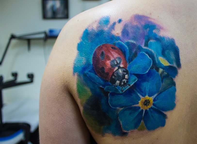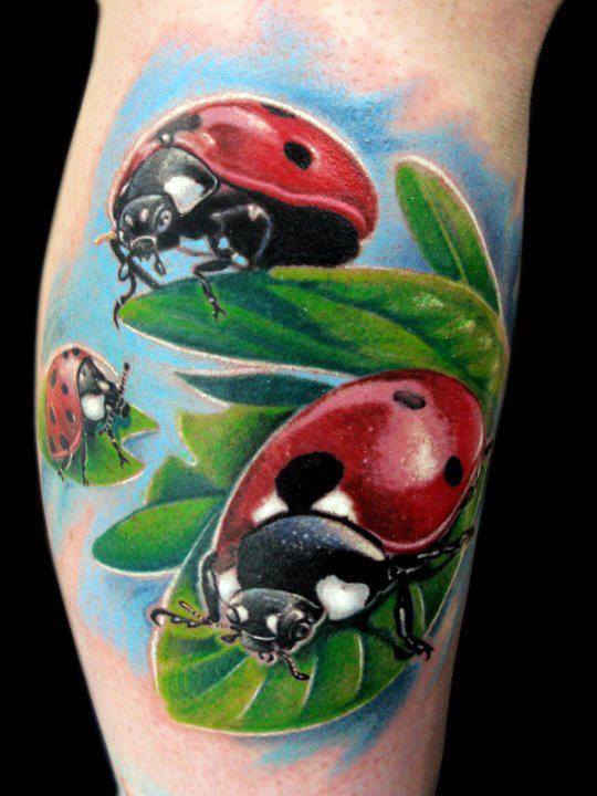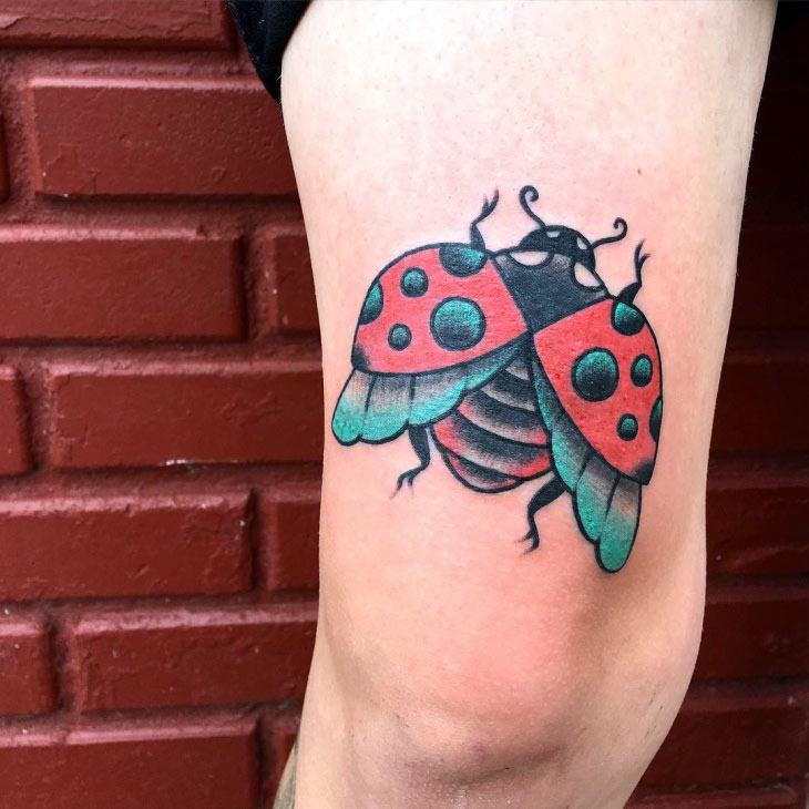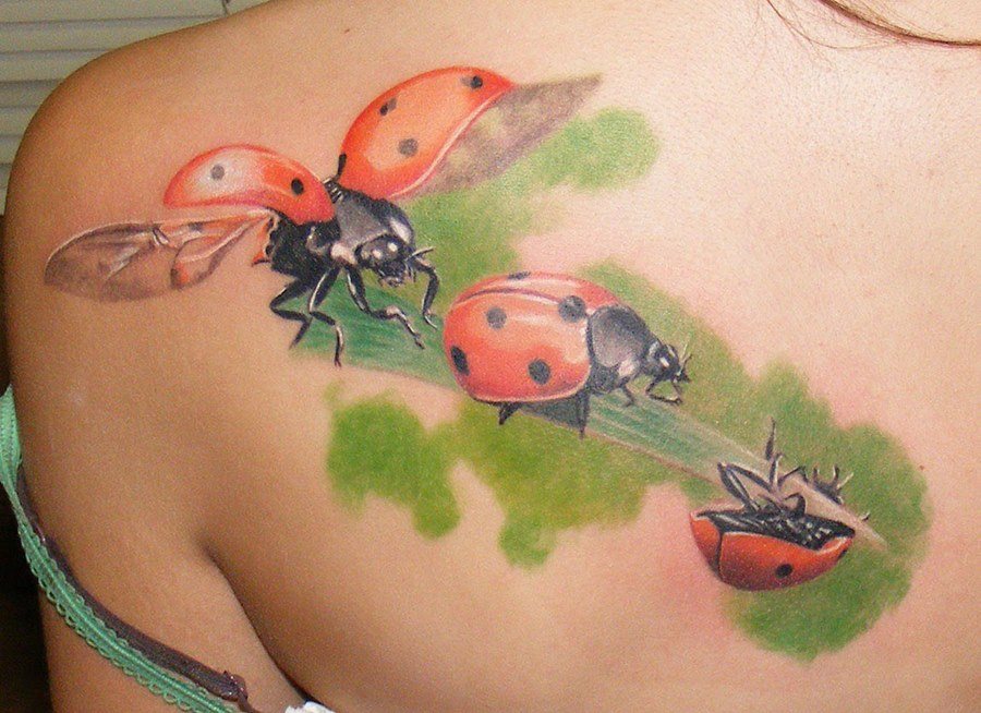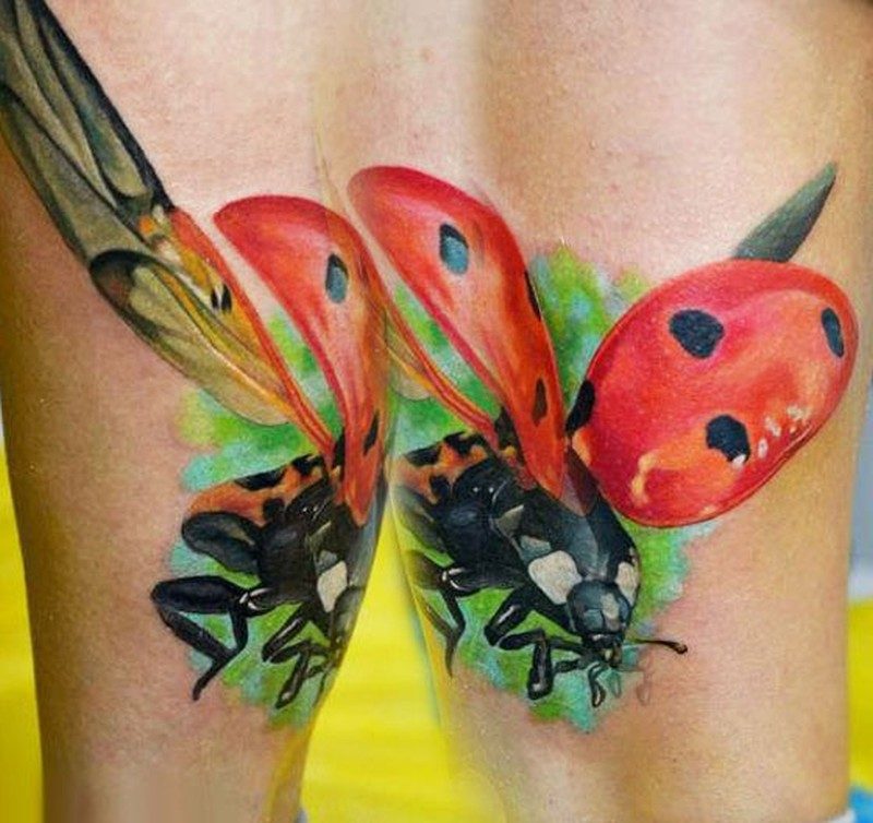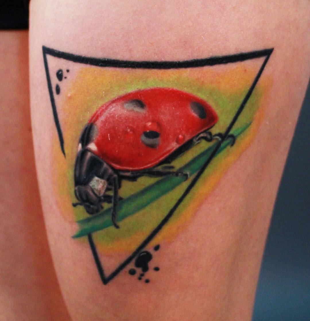 Beaucoup de tatoueurs pensent qu'un tatouage en couleurs donnera à l'image un dernier point fort. D'accord, car la coccinelle de couleur aura l'air plus joyeuse et lumineuse. Un tatouage avec un tel insecte peut être fait dans différents styles. Par exemple, style aquarelle, vieille école, école de presse, traditionnel et réalisme. Si vous ne pouvez pas décider de la technique de l'image, il est préférable de contacter un maître expérimenté, il vous aidera et vous conseillera.