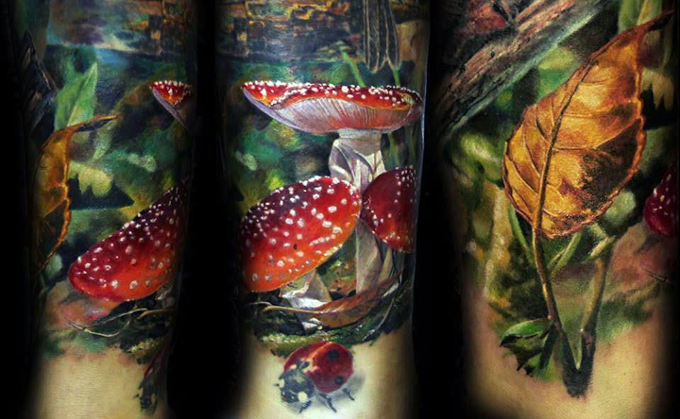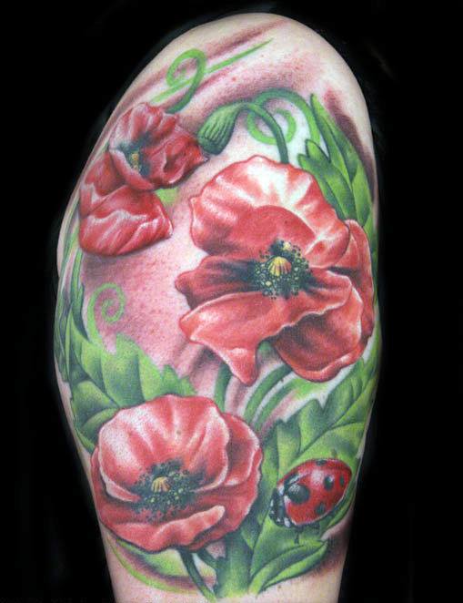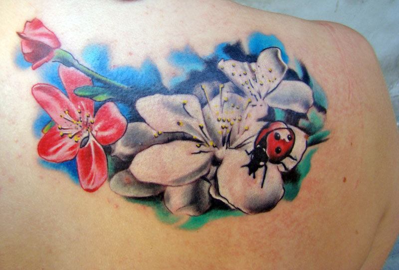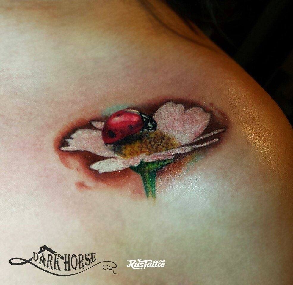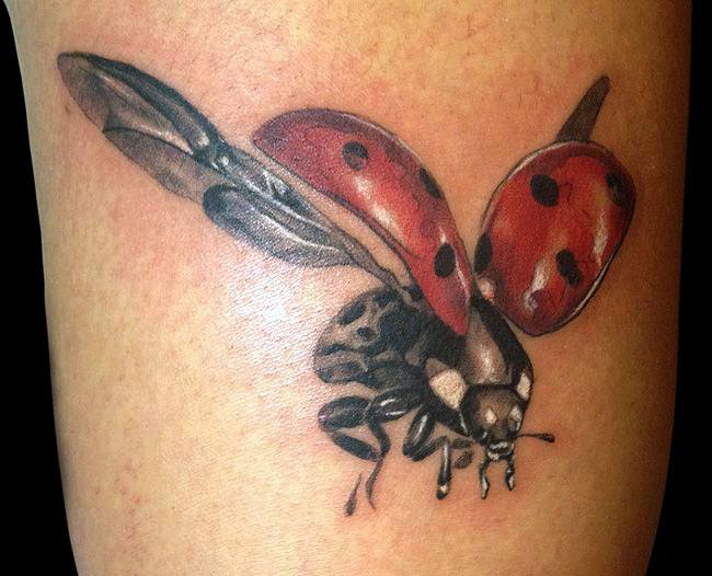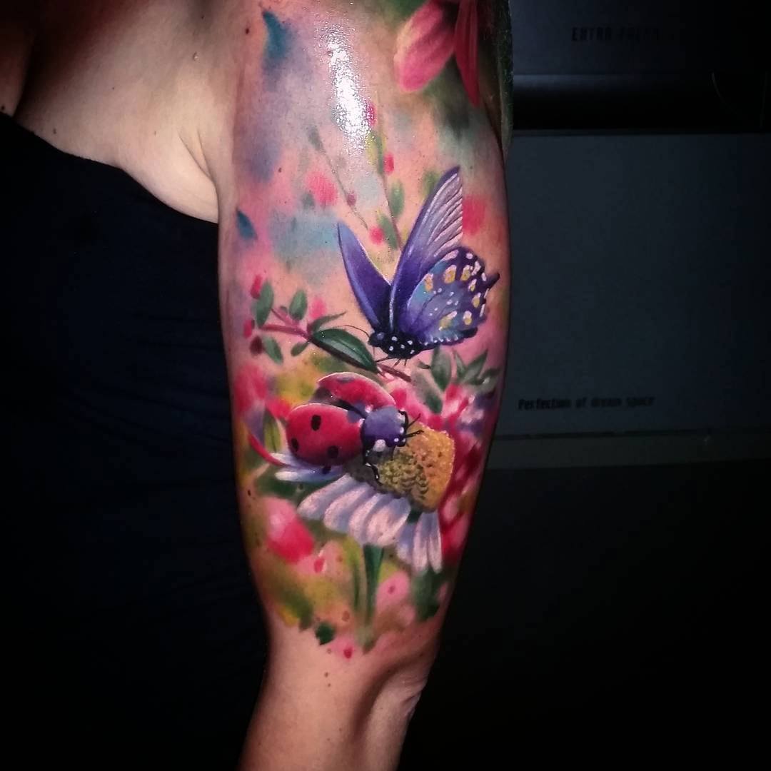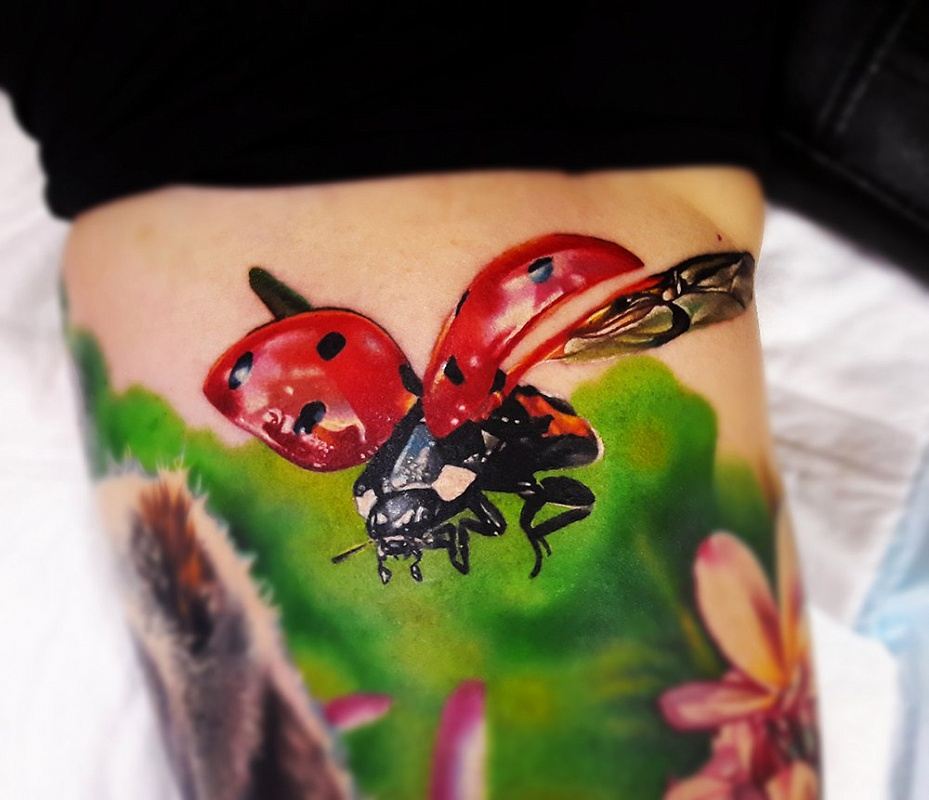 Beaucoup de tatoueurs pensent qu'un tatouage en couleurs donnera à l'image un dernier point fort. D'accord, car la coccinelle de couleur aura l'air plus joyeuse et lumineuse. Un tatouage avec un tel insecte peut être fait dans différents styles. Par exemple, style aquarelle, vieille école, école de presse, traditionnel et réalisme. Si vous ne pouvez pas décider de la technique de l'image, il est préférable de contacter un maître expérimenté, il vous aidera et vous conseillera.