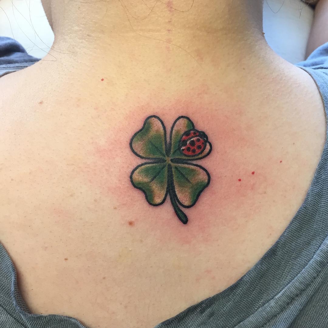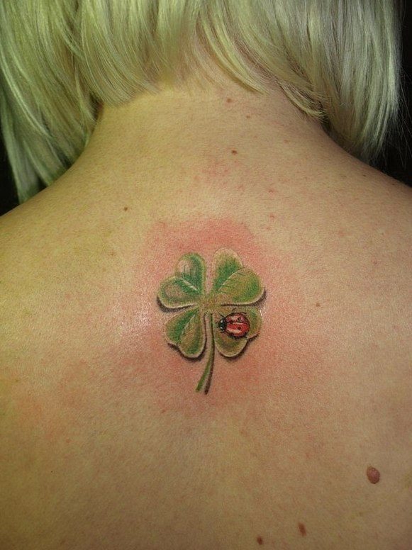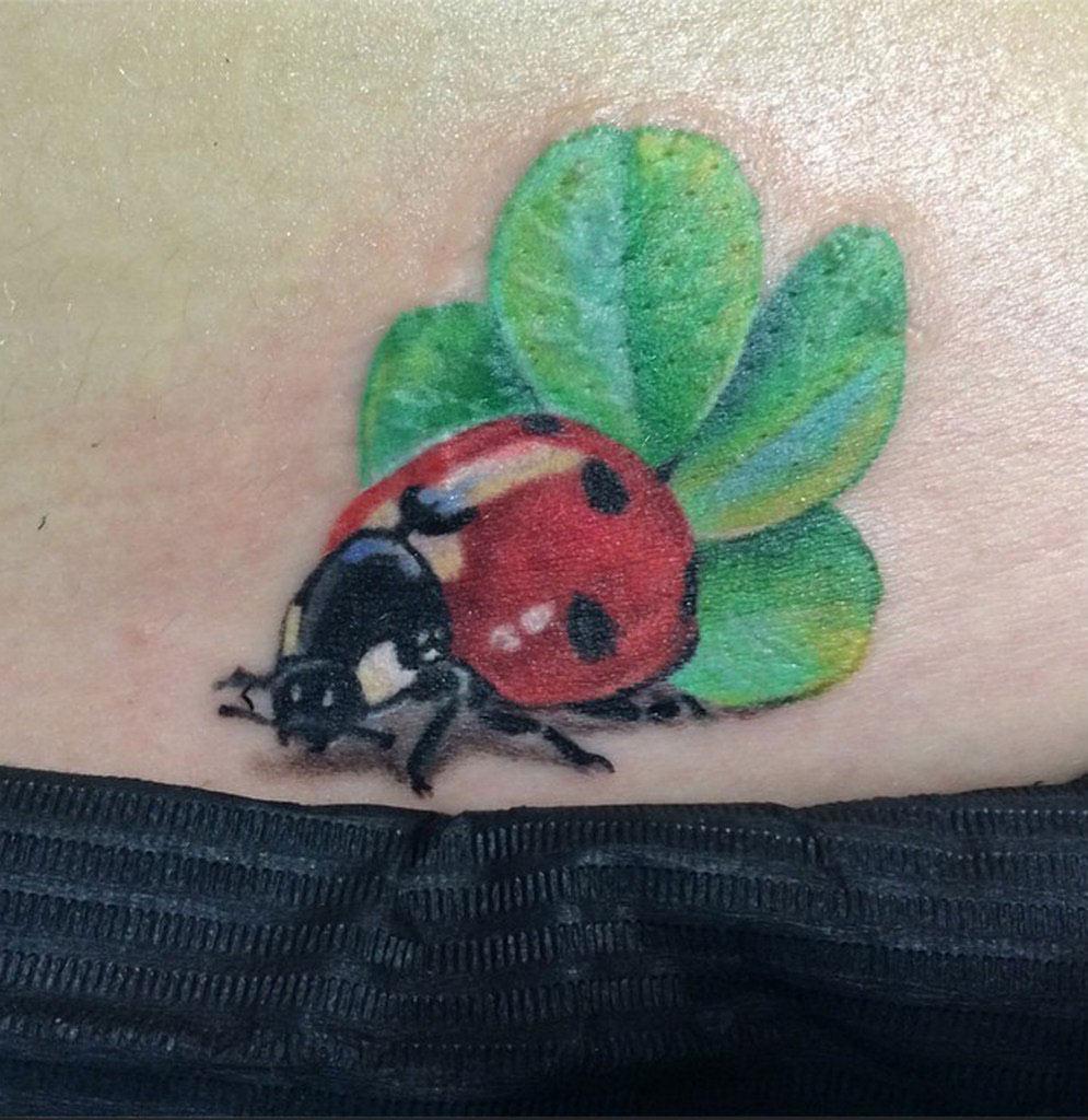 Il n'y a pas beaucoup de variations d'un tatouage de coccinelle. L'un d'eux est un tatouage associé à un trèfle à quatre feuilles. Le plus souvent, le tatouage est situé de sorte que la coccinelle repose sur un trèfle. Le trèfle lui-même symbolise la chance, le bonheur et le succès. Grâce à cela, il attire la chance de son propriétaire. La plupart des ésotéristes affirment que de telles images combinées portent une charge triple positive au propriétaire, se renforçant énergiquement. Il convient de noter le tatouage d'une coccinelle avec un fer à cheval, de l'herbe et du soleil, qui indique également des propriétés magiques améliorées.