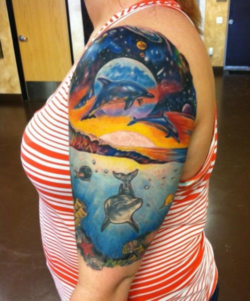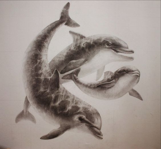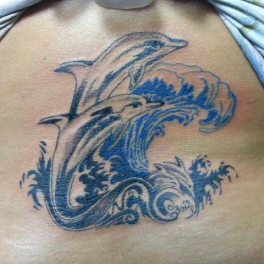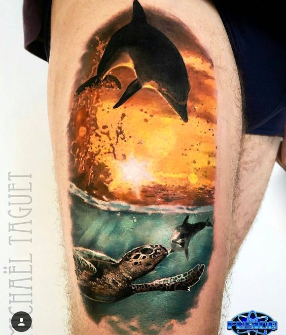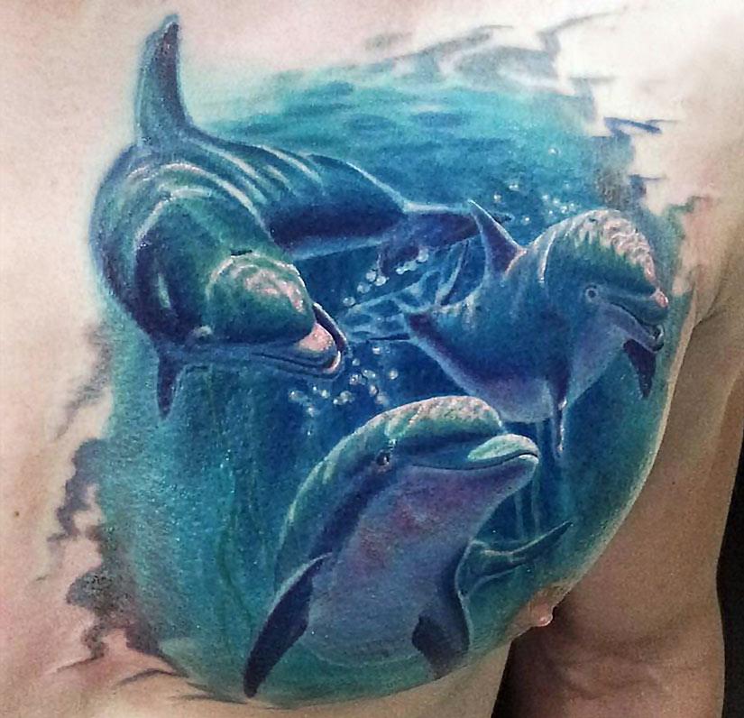 Les tatouages de ce style ne sont pas simplement des images, mais de véritables chefs-d'œuvre. Le plus souvent, les dauphins sont représentés en couleurs noire et grise. Sur le fond du dessin, son habitat, la lune ou le soleil, est réalisé.