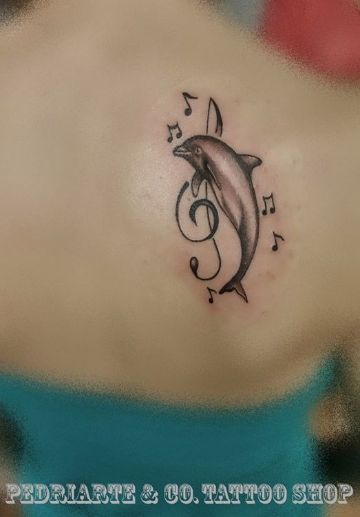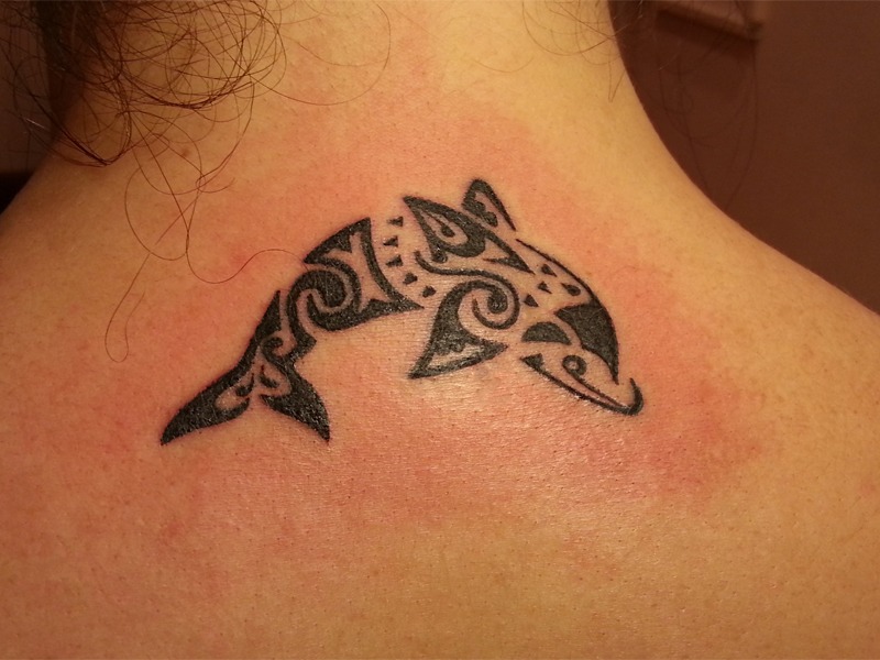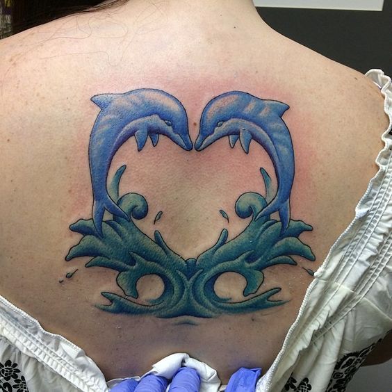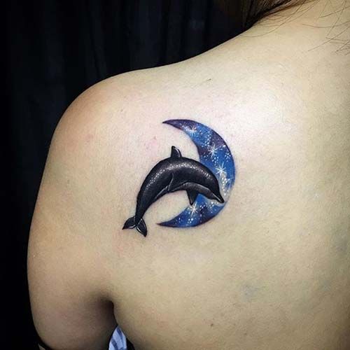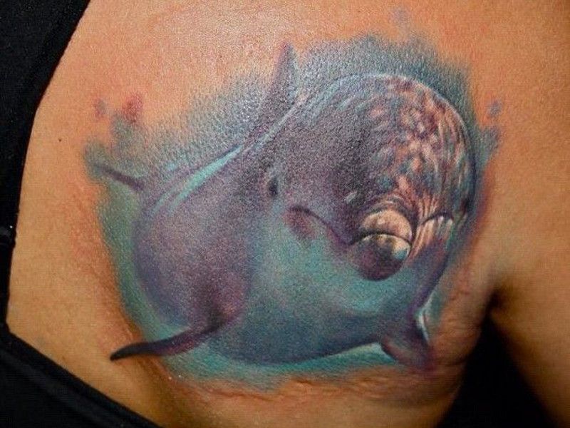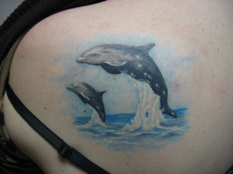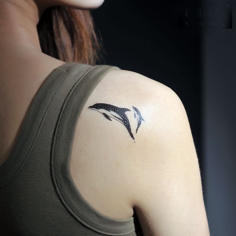 En choisissant un tatouage de dauphin sur l'omoplate, la jeune fille veut montrer son désir de liberté, d'intelligence, de jeu et de caractère. Les propriétaires de ces tatouages sont des gens ordinaires, sympathiques et souriants.