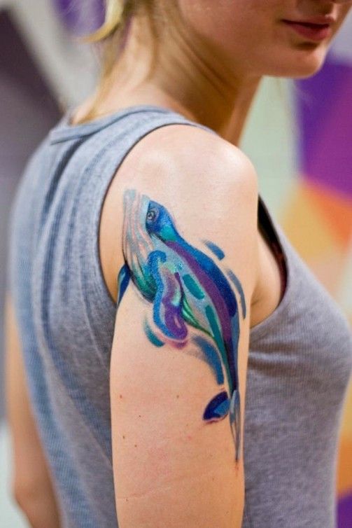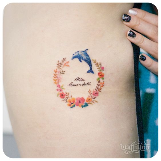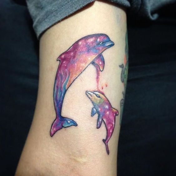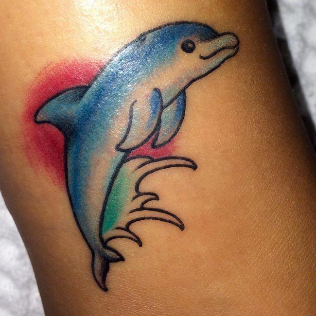 Les filles font un tatouage à l'aquarelle avec un dauphin en talisman. Ainsi, ils montrent non seulement leur affection et leur amour pour cet animal, mais également leur foi en la gentillesse. Les encres aquarelles brillantes sont spectaculaires. Et comme protection contre les malheurs, un tatouage coloré de dauphin est un talisman puissant et efficace, qui protège du mauvais œil, de l’envie et de la colère.