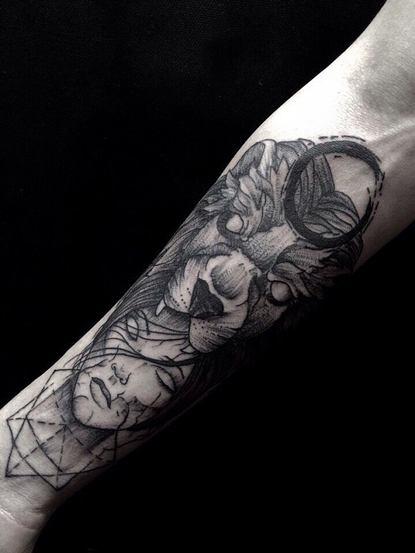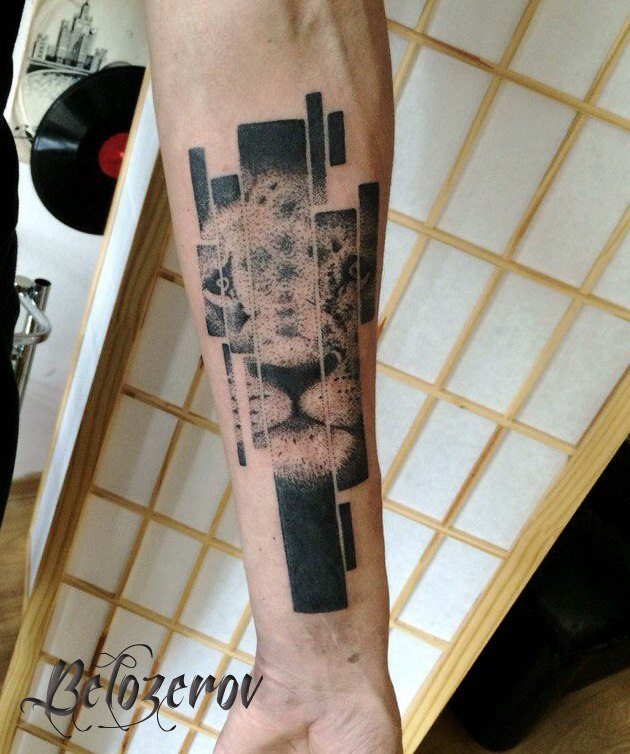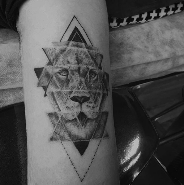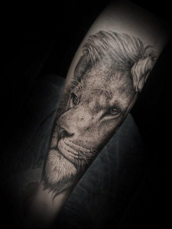 Superbe photo examen d'un tatouage de lion
