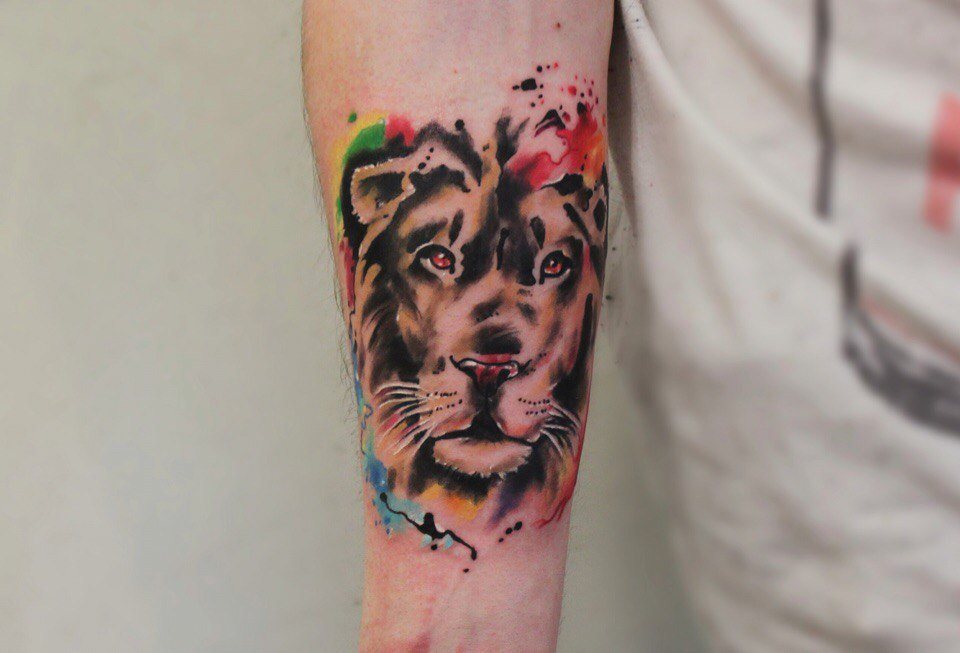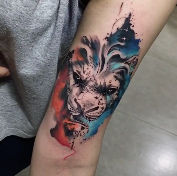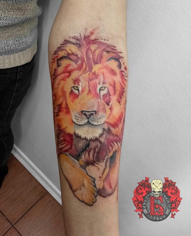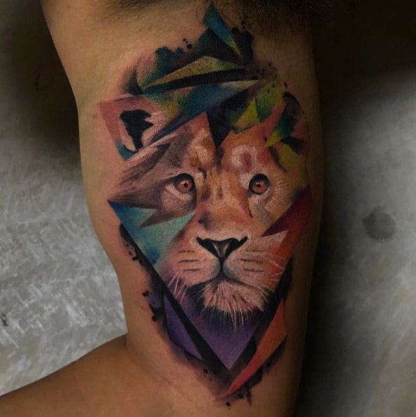 Très souvent, les gens modernes peuvent voir un tatouage coloré avec un lion, réalisé à l'aquarelle. Ce style est préféré par les personnalités purement individuelles et dynamiques. Mais le tatouage de couleur avec le roi du monde animal, réalisé dans un format de bande dessinée, semble particulièrement extravagant. Il est de coutume de remplir les tatouages géométriques avec de l'encre noire, mais un lion coloré de plusieurs lignes a l'air beaucoup plus spectaculaire.