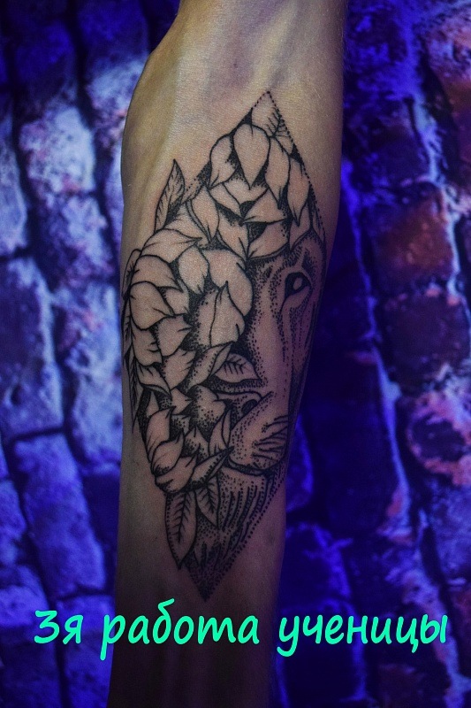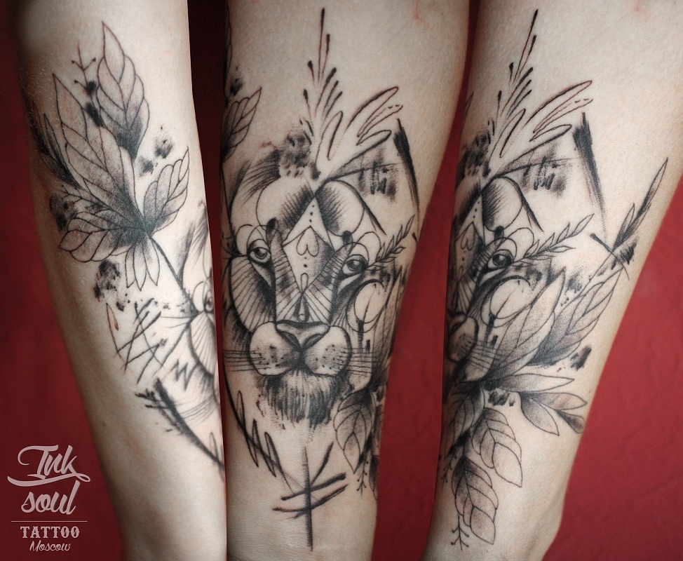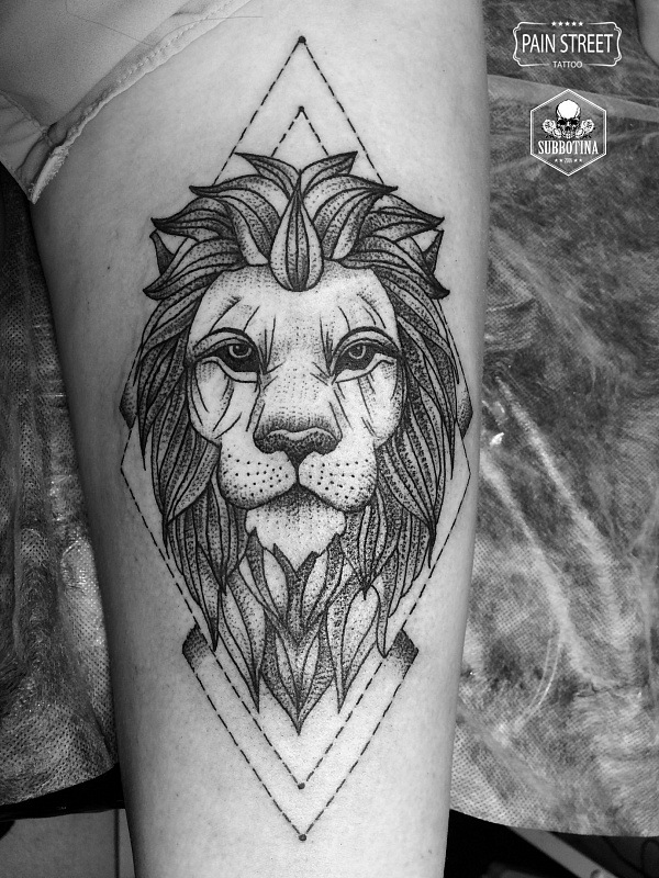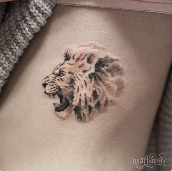 Plus récemment, il est devenu à la mode parmi la belle moitié de l’humanité de remplir des tatouages sous la forme d’un lion. Au fond, cet animal est dessiné calme et reposant. Cet ornement est un signe de prendre soin de vos proches. Les filles très motivées utilisent un tatouage de lion fait sur l'index. Soulignant ainsi son originalité et sa vanité. Mais la plupart des beautés utilisent ce modèle pour décorer leurs seins, le bas du dos, les jambes et les bras. Par exemple, le tatouage de lion sur la hanche est un ornement spectaculaire qui met en valeur les caractéristiques du propriétaire. Un tel motif est parfois réalisé avec des éléments supplémentaires (fleurs, couronnes, bijoux précieux).