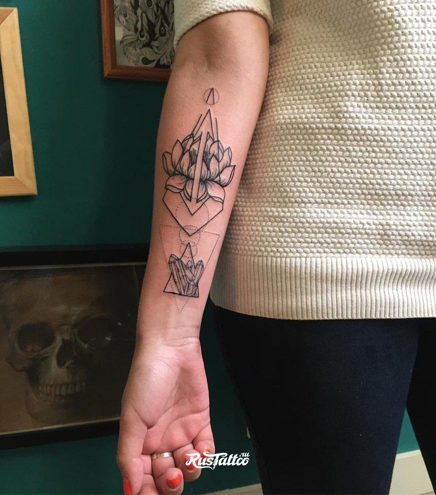 Les tatouages géométriques "lotus indien" connaissent un succès considérable. Une image noire est appliquée dans une image monochrome. Un tel tatouage a l’air le plus vif et le plus beau, et il est impressionnant sur la peau de toutes les races. Vous pouvez même choisir un simple croquis d'un tatouage de lotus. Il est beaucoup plus difficile de dépeindre un tatouage de complot, mais ça vaut le coup. À en juger par les croquis, ils peuvent être de tailles différentes: petits ou occuper une grande surface sur votre corps. Des histoires très populaires sont, par exemple, un éléphant perdu dans les fleurs de lotus ou un Bouddha avec une fleur. Un lotus au milieu du lac et enchanteur dans un triangle aura également fière allure.