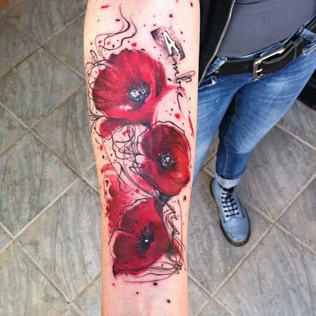 Le plus populaire des styles, idéal pour les coquelicots rouges, est le réalisme, car il sera en mesure de transmettre au maximum tous les éléments de la photo. Ils utilisent également le style thrash-polka, surtout si vous voulez transmettre l'obscurité et la négativité. Les filles aiment remplir les tatouages dans le style de l'aquarelle. Cette solution semble assez brillante et inhabituelle, ajoute précision et élégance. Une caractéristique de ce style est l'absence de contour noir. Cela rend le tatouage plus expressif et ressemble à une image. Très rarement, les coquelicots sont représentés dans le style du bienfaiteur, du minimalisme ou des graphiques.