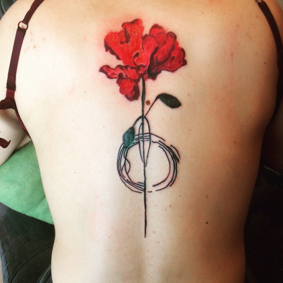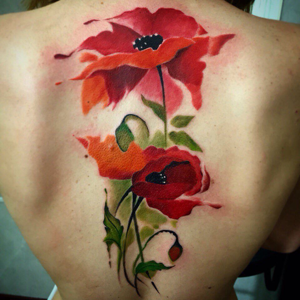 Bien sûr, pour le coquelicot, la couleur caractéristique est le rouge (moins souvent le blanc et le jaune), mais vous pouvez également trouver des fleurs noires et blanches. Les coquelicots d'aquarelle sur le corps sont incroyables. Pour compléter la photo, vous pouvez ajouter des feuilles et des tiges vertes. Il est très rare de trouver des tatouages avec des coquelicots dans d'autres couleurs. Le symbolisme du tatouage peut varier légèrement en fonction de sa nuance. Les coquelicots rouges brillants transportent l'amour et la romance.