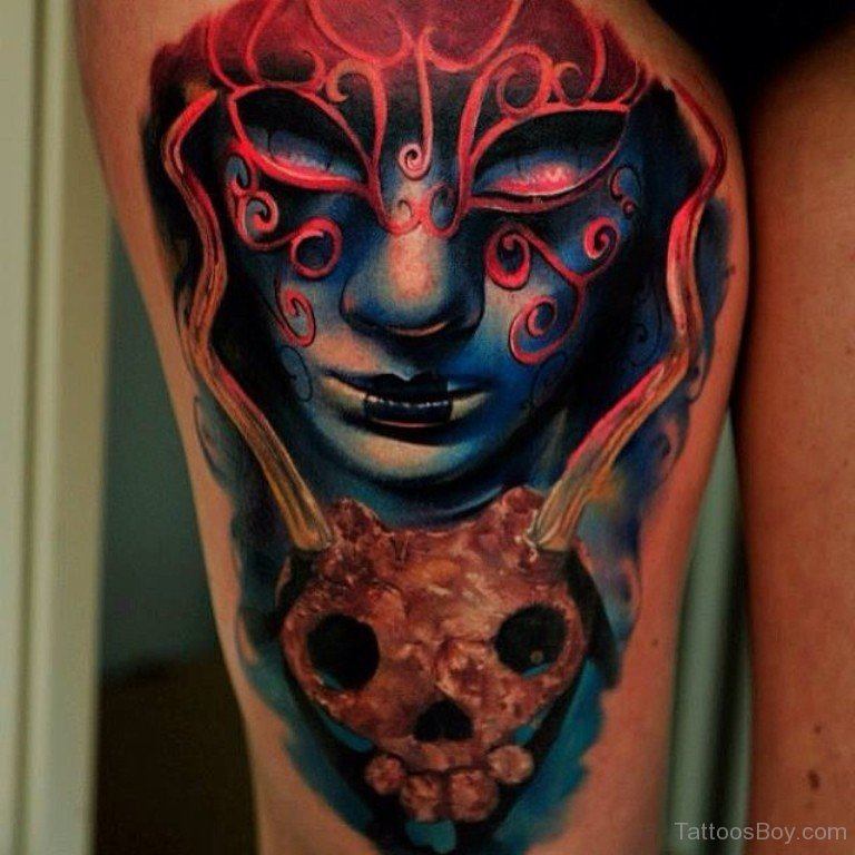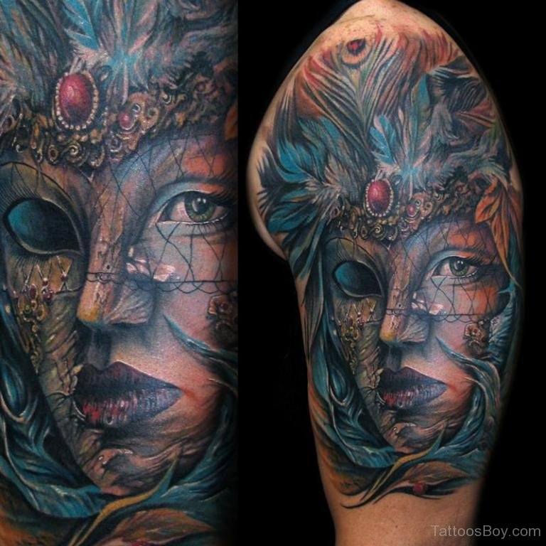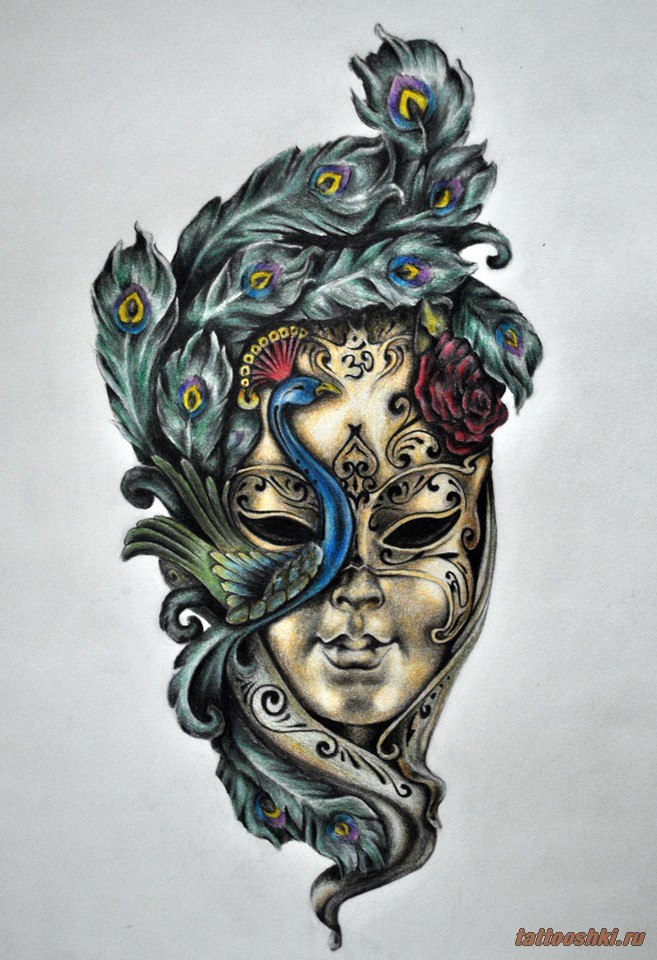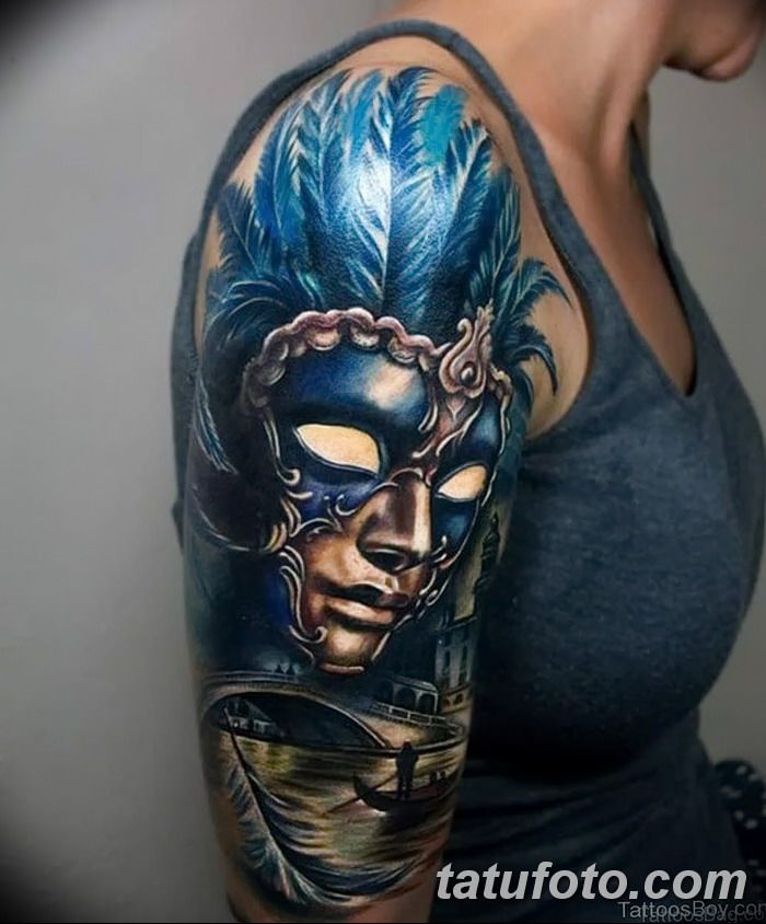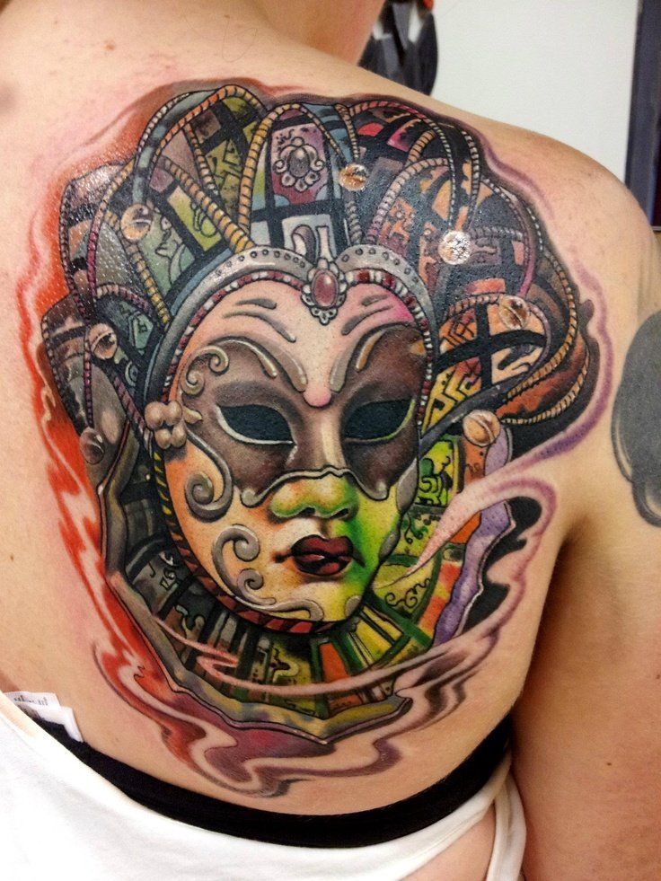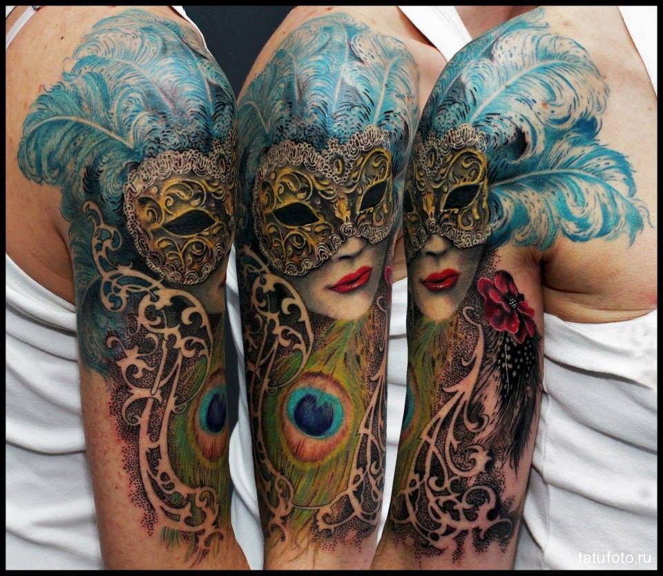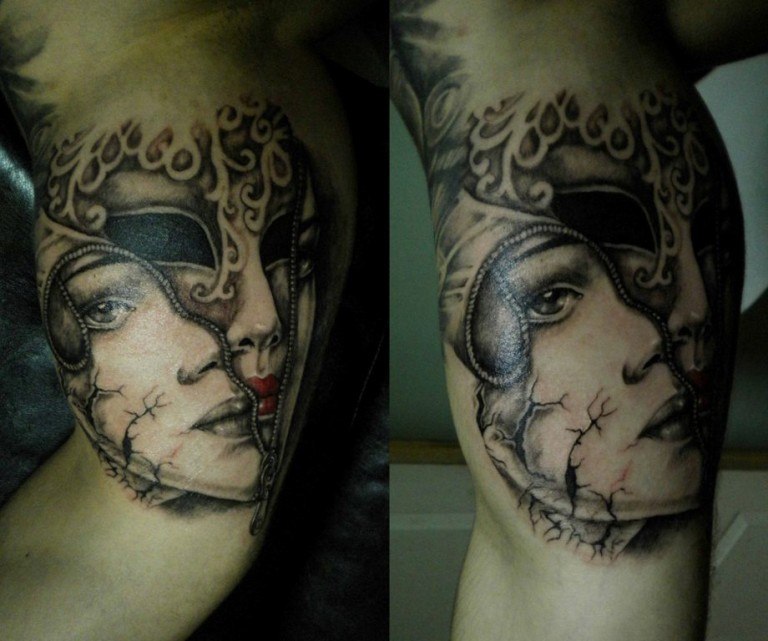 L'image de la jeune fille au masque, représentée sur le corps, a un symbole de double nature, un décalage de l'état interne avec ce que les autres voient. Un beau tatouage lumineux peut facilement décorer le corps masculin et féminin. Un tel tatouage semble très attrayant. La combinaison de la beauté féminine et de la luminosité du masque crée une image charmante.