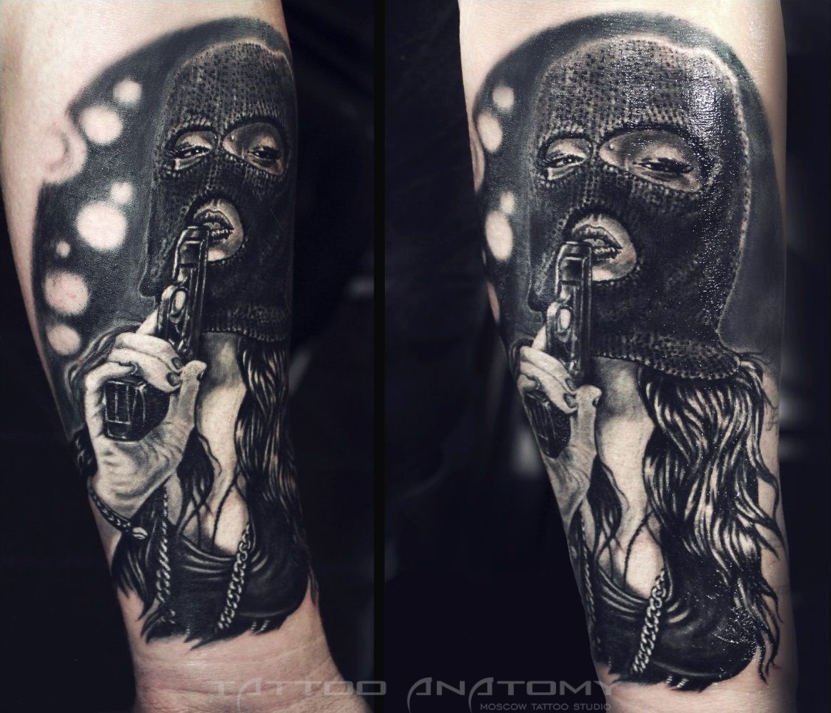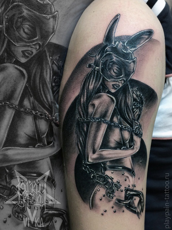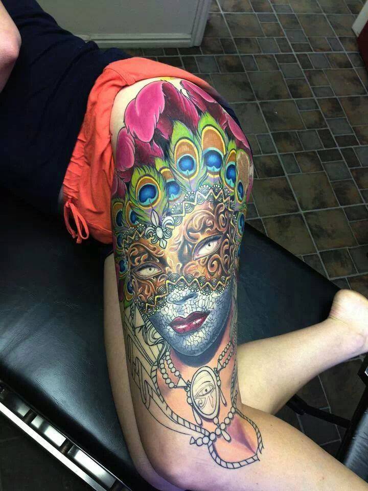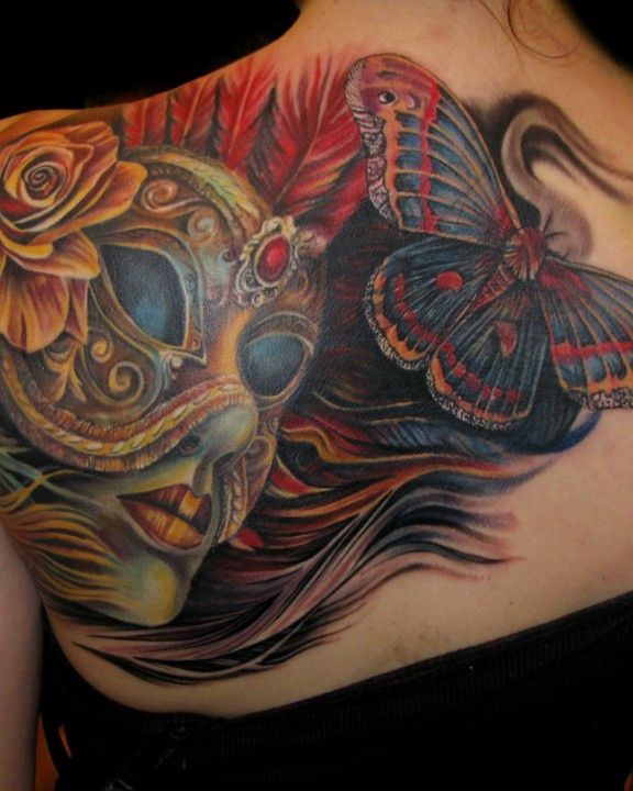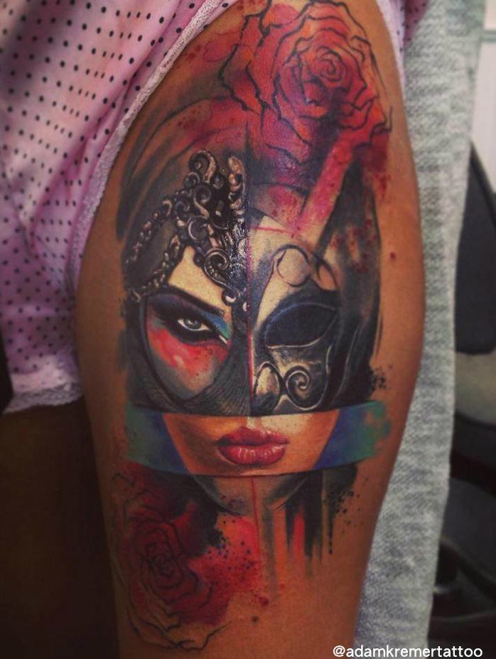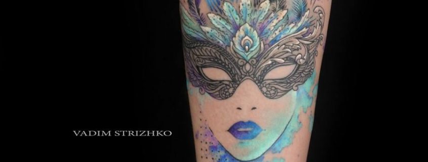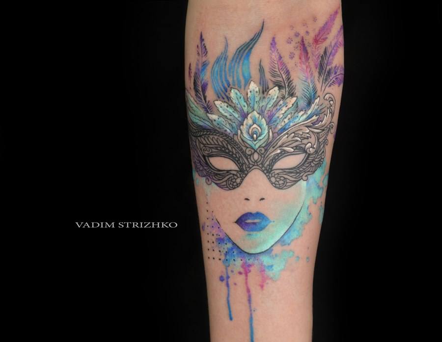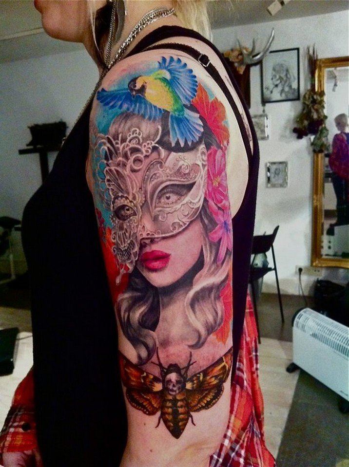 L'image de la jeune fille au masque, représentée sur le corps, a un symbole de double nature, un décalage de l'état interne avec ce que les autres voient. Un beau tatouage lumineux peut facilement décorer le corps masculin et féminin. Un tel tatouage semble très attrayant. La combinaison de la beauté féminine et de la luminosité du masque crée une image charmante.