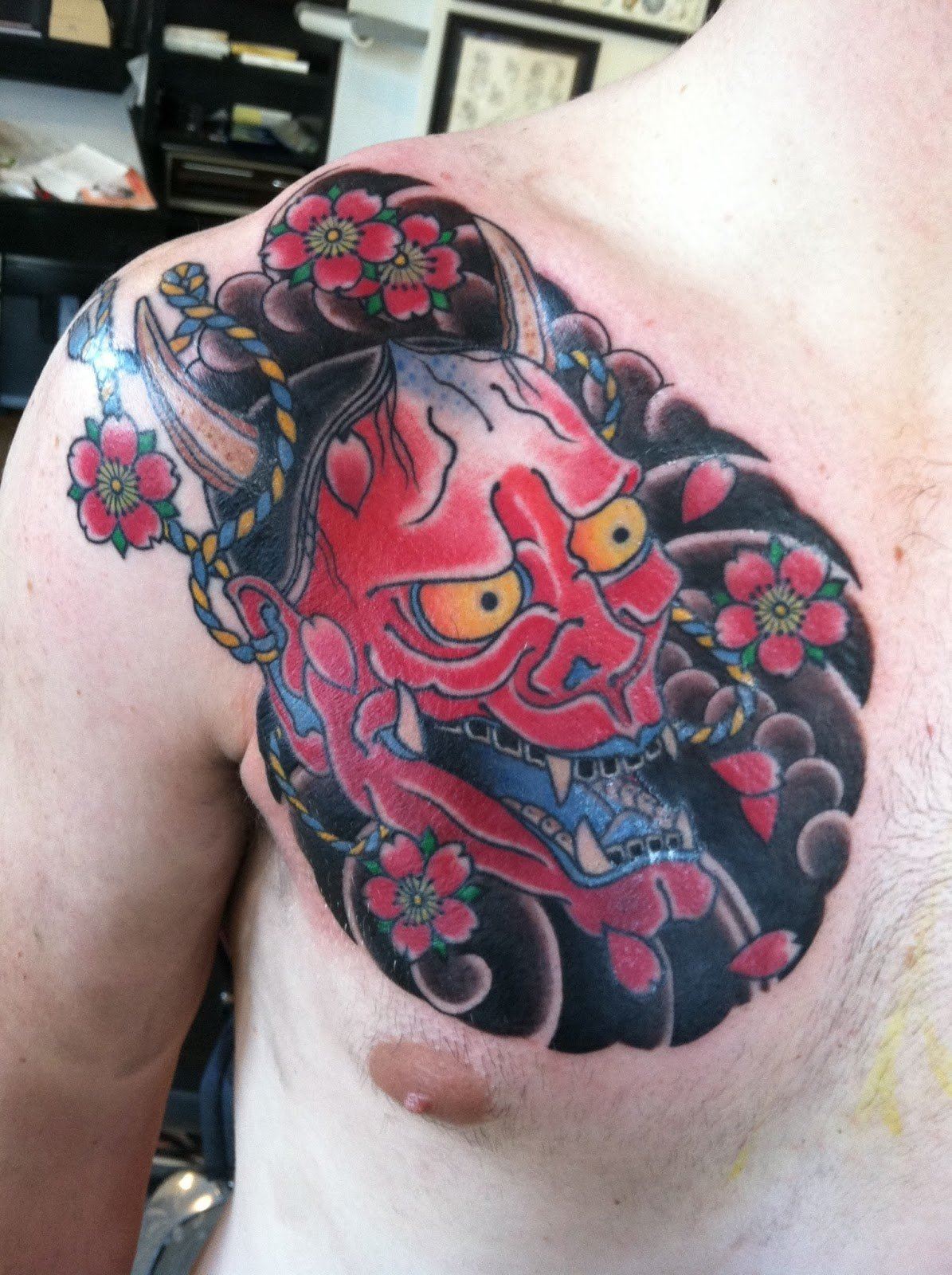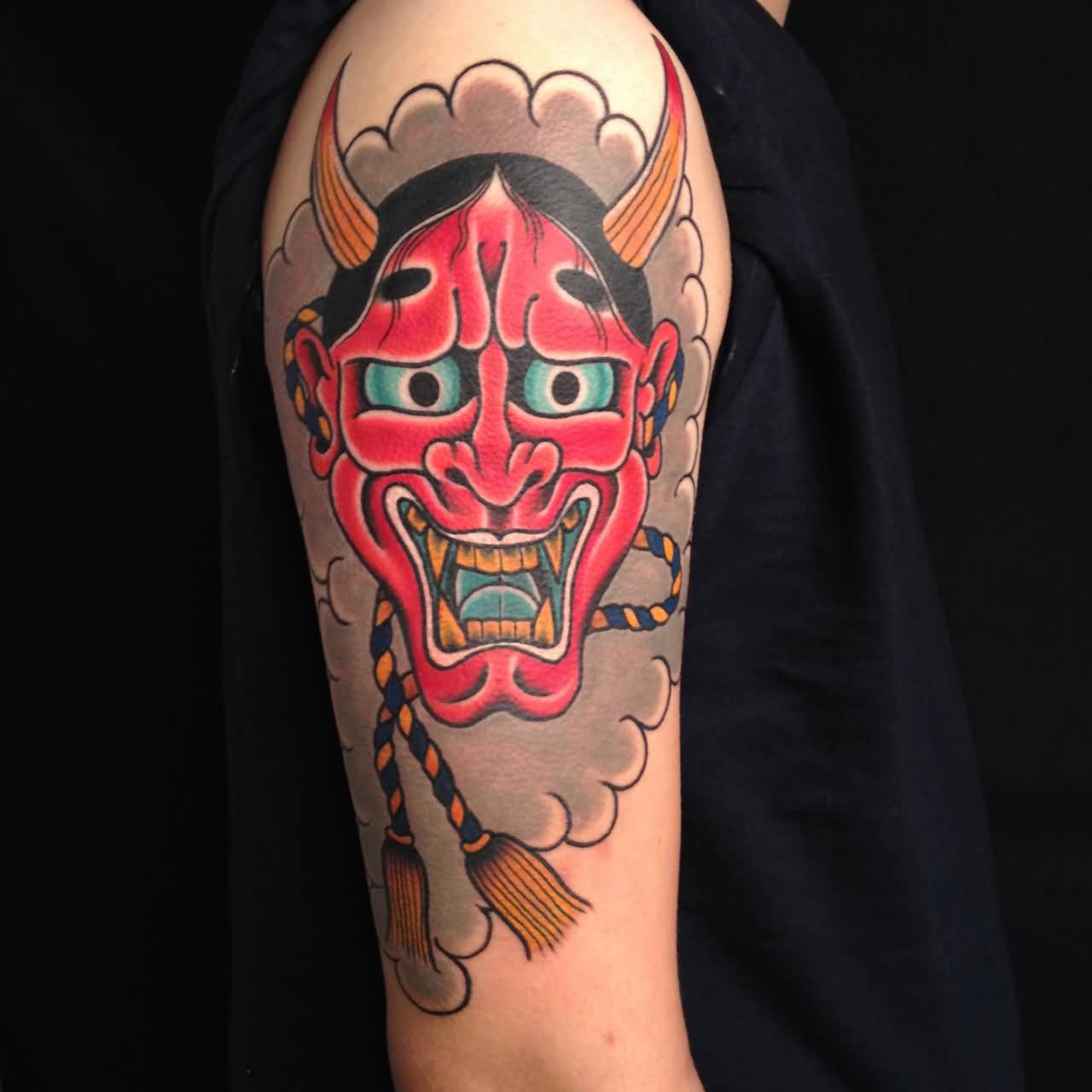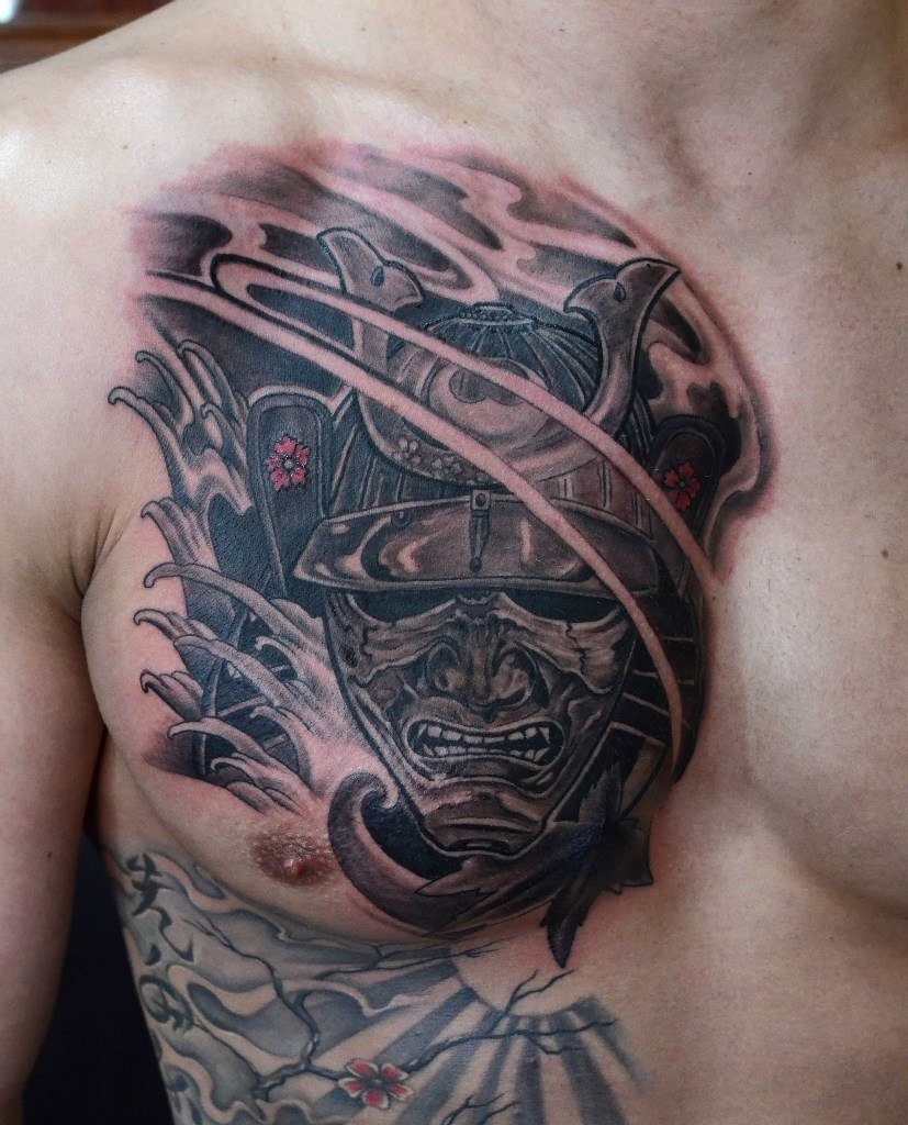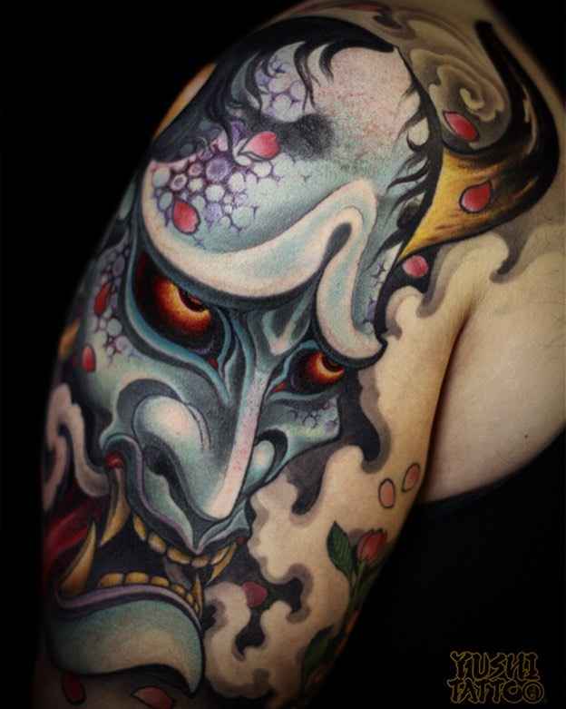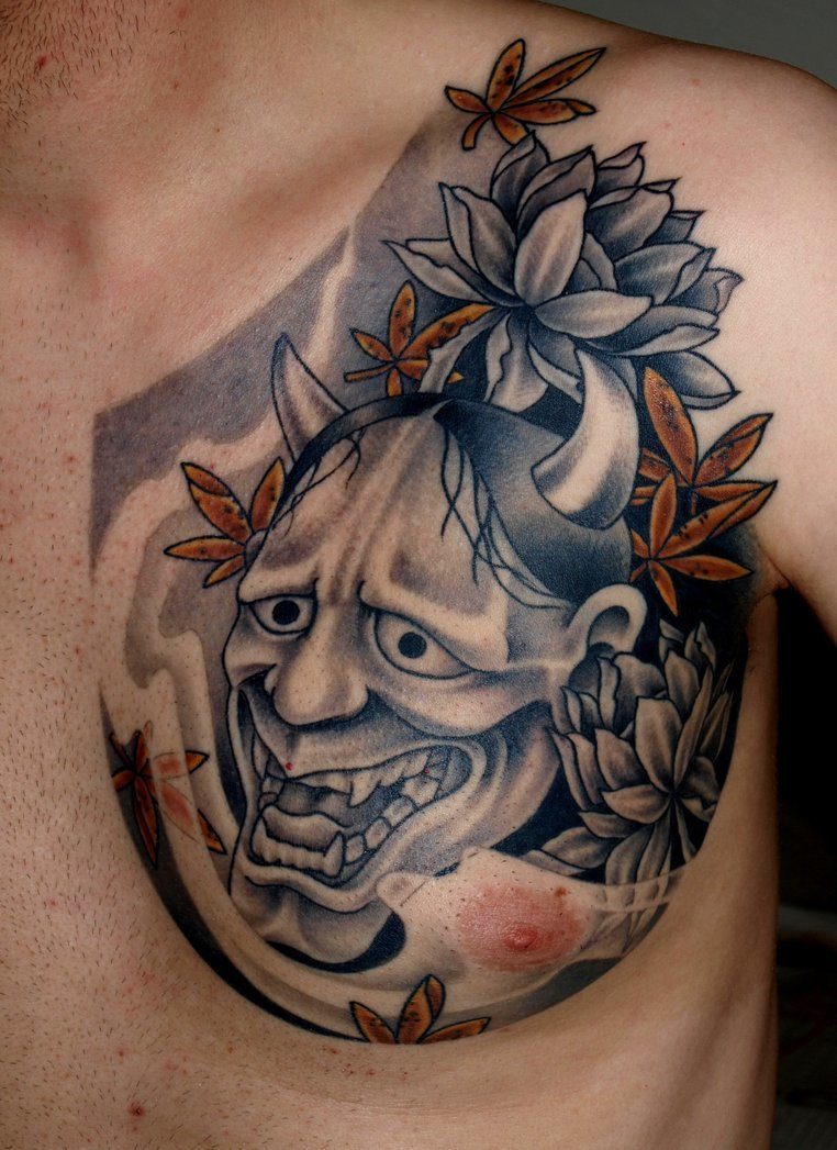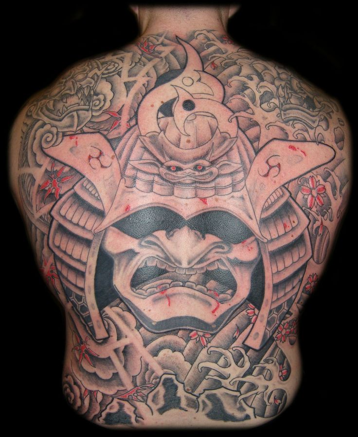 Le tatouage le plus commun dans le style japonais est le masque de samouraï. Une personne qui a choisi un tel tatouage, déclare ouvertement une attitude positive à l’égard de la philosophie japonaise, de sa culture et de ses traditions. Un tatouage avec une image d'un masque de samouraï est utilisé moins souvent qu'une image d'un samouraï. Le masque a l'air très intimidant. Auparavant, ces masques étaient utilisés par les samouraïs pour inspirer la peur à leurs adversaires. Sur cette base, une personne qui applique un masque de samouraï sur son corps en essayant d'inspirer la peur aux autres est très secrète et toujours prête à se battre. Souvent, un tel tatouage est placé dans le dos. De même, pour l’image de tatouages à grande échelle, l’estomac ou la cuisse convient. Si vous décidez de mettre une petite image, l'épaule lui convient parfaitement. Lors de l'application d'un tatouage avec un masque de samouraï, une petite condition doit être rappelée: le tatouage japonais n'est pas visible par tout le monde, car les samouraïs ont caché leur véritable humeur sous le masque.