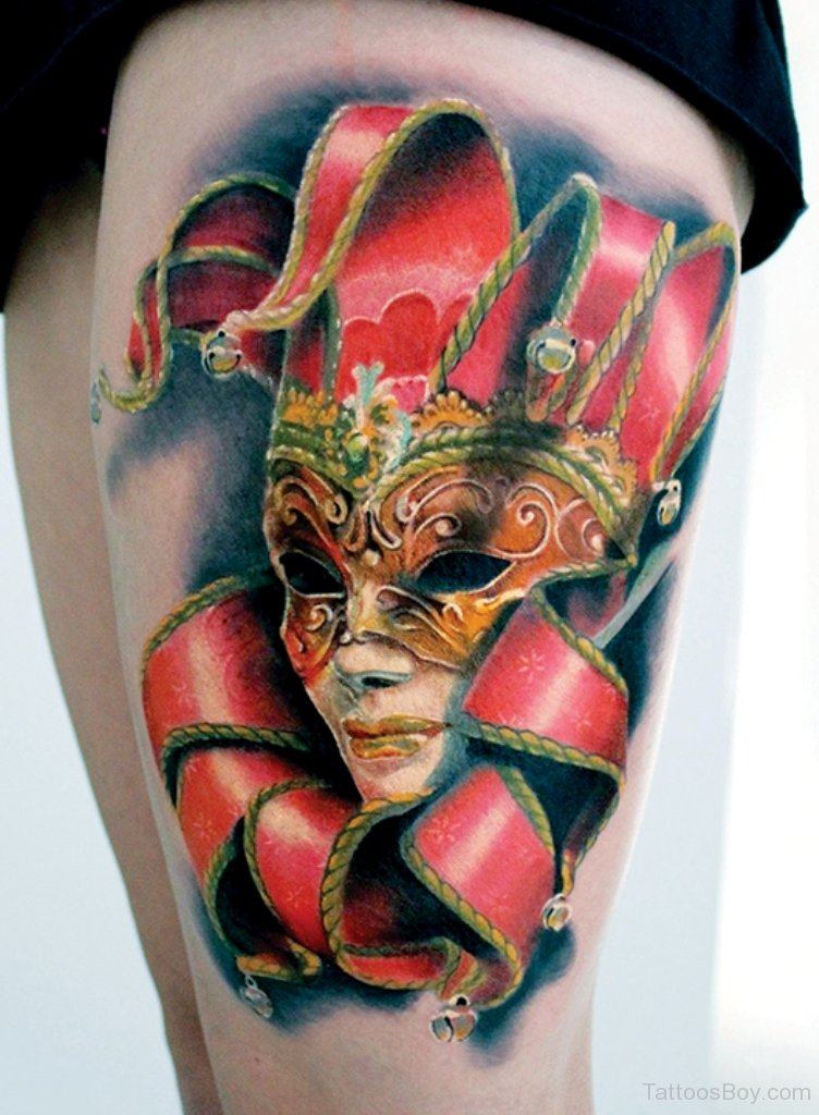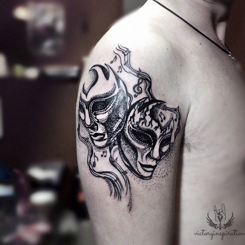 Les masques de théâtre sont apparus à l'époque des anciens Romains. Ils étaient utilisés pour des productions théâtrales. Il y avait deux types de masques - drôle (comique) et triste (tragique). En dépeignant de tels masques sur son corps, son propriétaire exprime son attitude envers la vie ou, au contraire, cache son véritable état. Un tatouage à l’image des masques de carnaval qui ne cache que les yeux a fière allure sur n’importe quelle partie du corps. Les hommes préfèrent appliquer un masque de tatouage sur l'épaule ou la poitrine. Mais les filles préfèrent appliquer un tel tatouage sur la cuisse, l'abdomen ou le poignet.