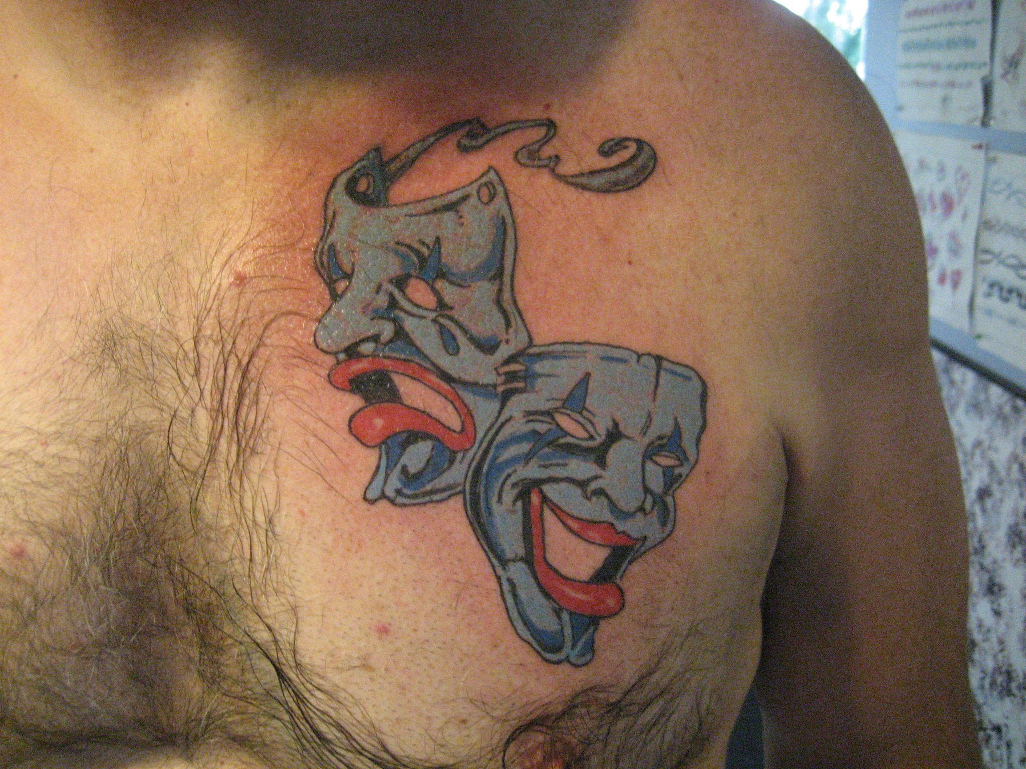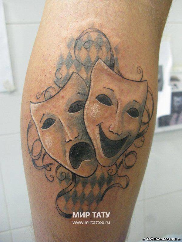 Un tatouage avec l'image d'un masque triste ou en pleurs est appliqué par des personnes qui veulent montrer qu'elles ne sont pas comme les autres les voient. Ces tatouages peuvent être choisis par les hommes et les femmes. Mais le plus souvent, le tatouage d’un masque triste est associé à un masque joyeux, mais en même temps, il ne perd pas sa signification.