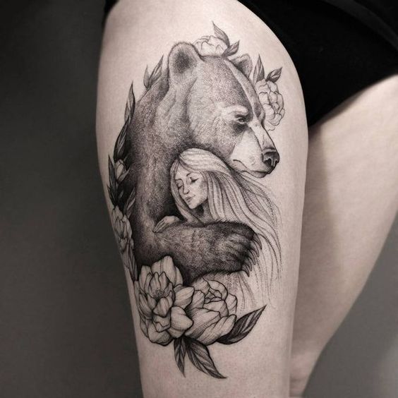 Aujourd'hui, le tatouage d'ours est populaire non seulement chez les hommes, mais les filles utilisent souvent l'image d'un ours pour décorer leur corps. Les filles qui ont décidé de montrer aux autres la capacité de prendre des décisions, désobéissant à leur volonté, aux circonstances et ayant une idée claire de la justesse des situations de la vie infligent un sourire spectaculaire aux ours. Le tatouage d'ours le plus populaire chez les femmes est l'image d'un ours avec ses petits. Un tel tatouage est synonyme d'amour, de dévouement envers la famille et de soin de la progéniture. Les filles d'aujourd'hui choisissent aujourd'hui un tatouage avec l'image d'un ours en peluche, qui a l'air mignon, mais suggère que la fille est douce et gentille, mais elle est toujours prête à se débrouiller toute seule.