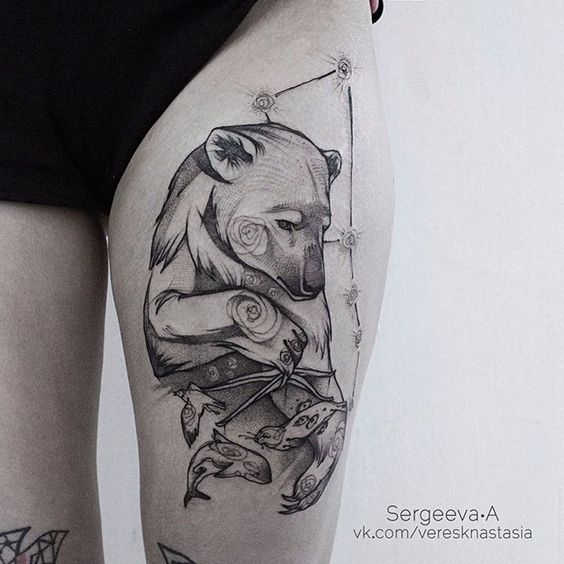 L'ours est un animal unique, formidable et controversé. Tout d'abord, il s'agit d'une bête féroce et dangereuse pour les humains, et deuxièmement, cet animal merveilleux est reconnu pour ses qualités merveilleuses telles que la noblesse, la gentillesse, l'intrépidité et même la tendresse. Les tatouages d'un ours sont principalement choisis par les représentants de la moitié masculine de l'humanité, mais aujourd'hui, on peut souvent trouver un bon tatouage d'ours sur le corps des filles.