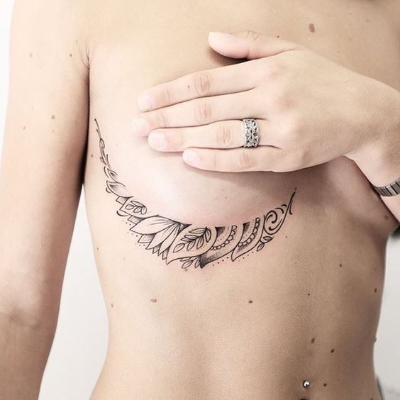 Le choix d'un tatouage sous la poitrine est souvent basé sur le désir de cacher la cicatrice, par exemple après un implant. Une bonne solution serait de choisir un croquis sous forme de brindilles ou de fleurs qui mettent en valeur la beauté de la poitrine. Il y a de magnifiques dessins de tatouage sous les deux seins. Dans ce cas, le tatouage commence généralement par le centre et se propage dans les deux sens.