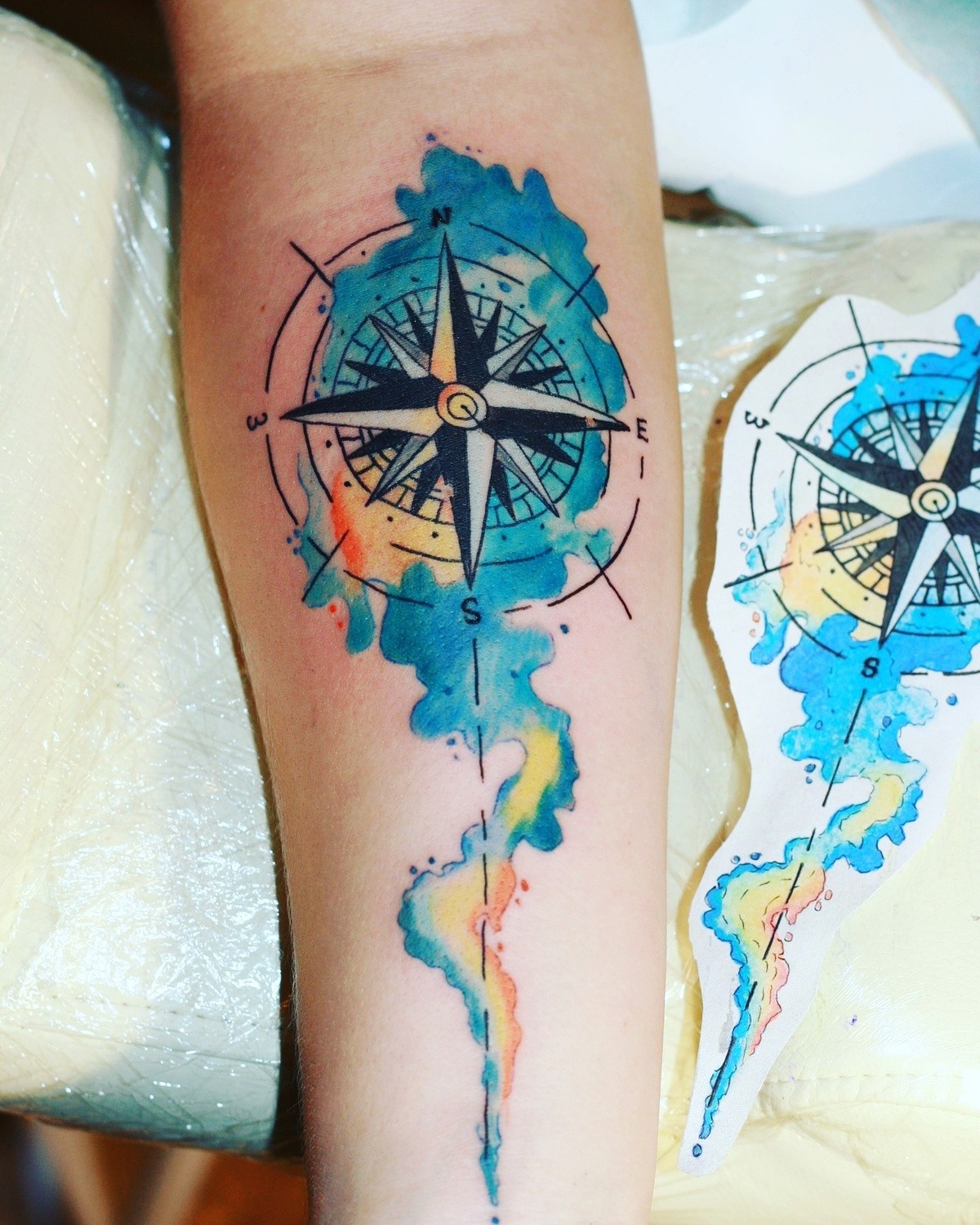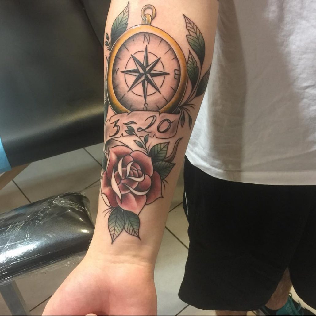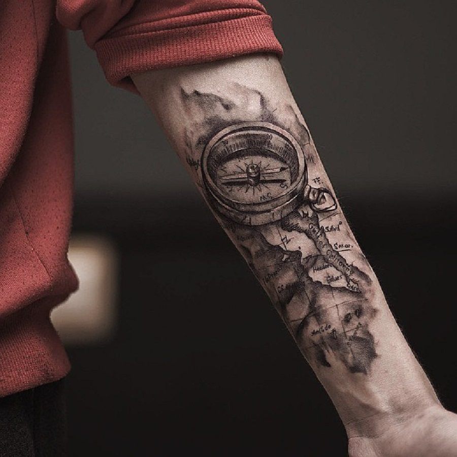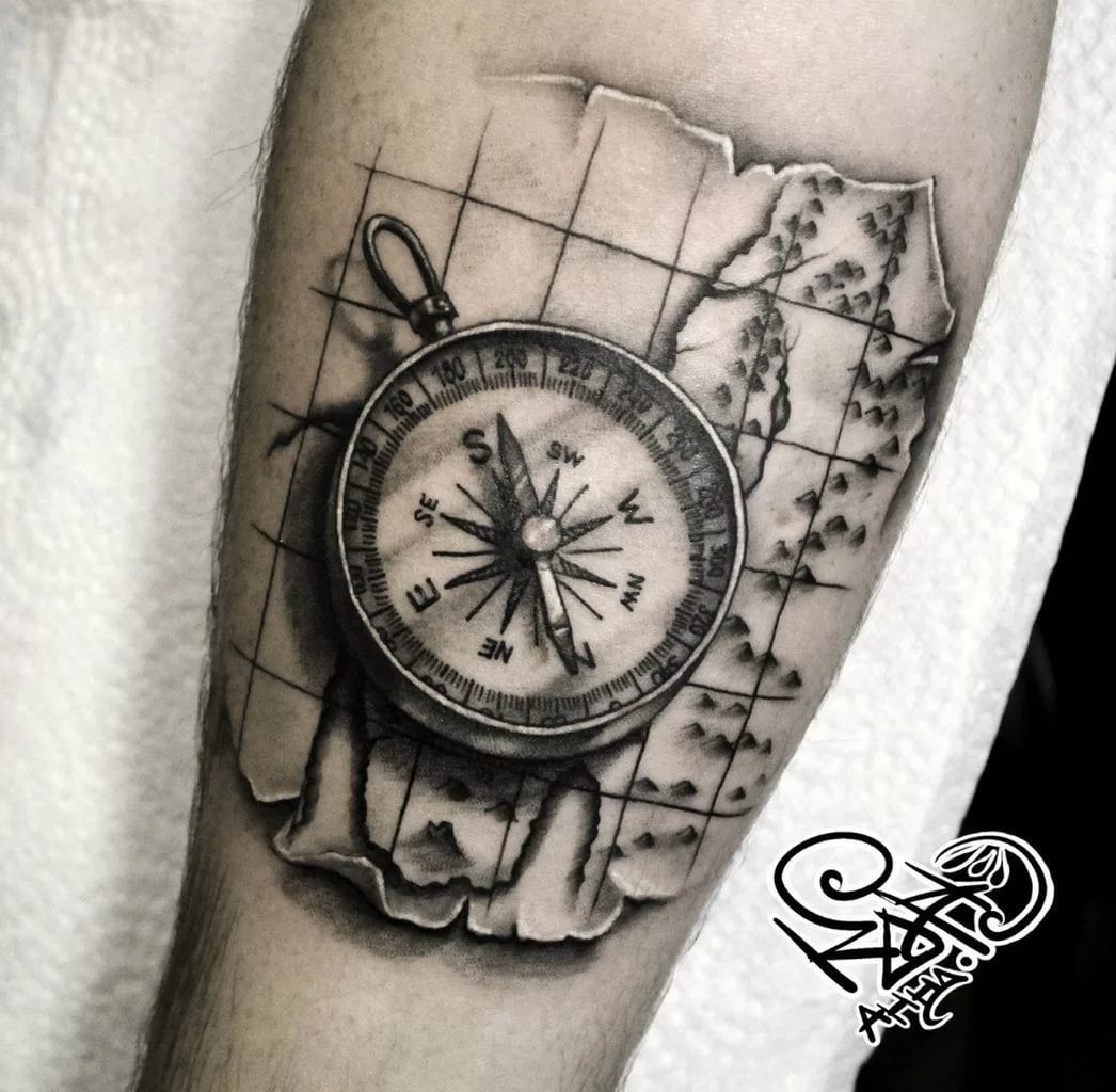 Beaucoup moins souvent, vous pouvez voir sur l'avant-bras l'image d'une boussole, qui peut avoir une signification profonde. On croit que la boussole contribue à trouver le bon chemin dans la vie. En outre, un tel tatouage peut signifier l'équilibre, la fidélité et la constance de la personne sur l'avant-bras de laquelle il est appliqué.
