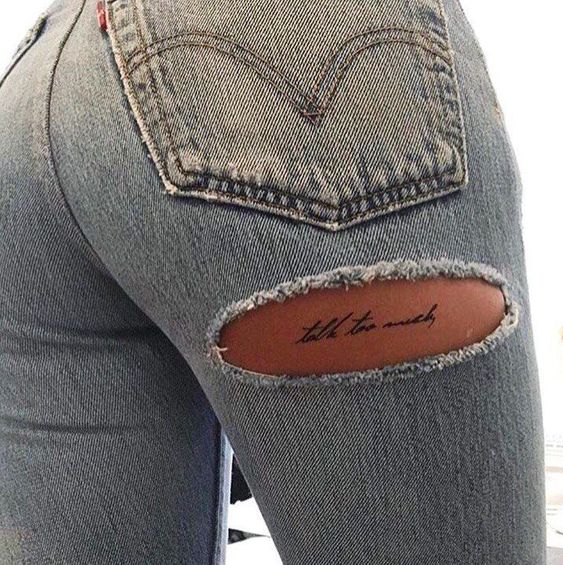 Les tatouages sous la forme d'une inscription sur les jambes sont plutôt beaux. L'inscription sur la cheville, la cheville ou le pied est attrayante. Les représentants du sexe faible choisissent très souvent cette option. Mais lors du choix de ces endroits, vous devez vous rappeler que la peau y est très délicate et que vous devez faire preuve de patience pour supporter la procédure douloureuse. La cuisse est l’un des endroits les plus populaires pour le tatouage des filles. Un grand champ pour la fuite des pensées et la mise en œuvre des idées créatives du pair. Vous pouvez décorer la cuisse féminine avec une petite phrase ou un poème entier. À propos, le tatouage de l'inscription sur la hanche présente un énorme avantage: il souligne magnifiquement la flexion du corps.