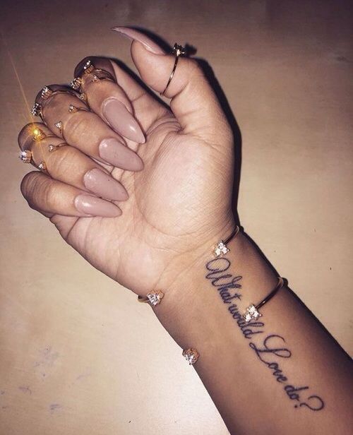 Notez qu'il est très important, lors de l'application d'un tatouage sous la forme d'inscriptions, de choisir une zone d'application. Tout d'abord, il est nécessaire de décider si le tatouage ne sera visible que par vous et vos proches, ou si vous souhaitez partager son interprétation et sa signification avec d'autres. La main est une zone ouverte aux yeux des autres. L'option la plus courante pour les femmes et les hommes est d'inscrire sur le secteur de la main. L'option convient à l'expression de soi, car vous pouvez représenter à la fois une petite phrase et un texte volumineux. Il est important de le positionner correctement. Par exemple, si vous mettez une inscription sur vos mains ou vos doigts, il s’agit d’un maximum de deux mots dans un format lisible. Mais sur l'avant-bras, vous pouvez mettre une plus grande inscription d'une certaine police et d'une certaine taille. Une petite inscription est appliquée sur le poignet, qui peut éventuellement être cachée sous une montre ou un bijou.