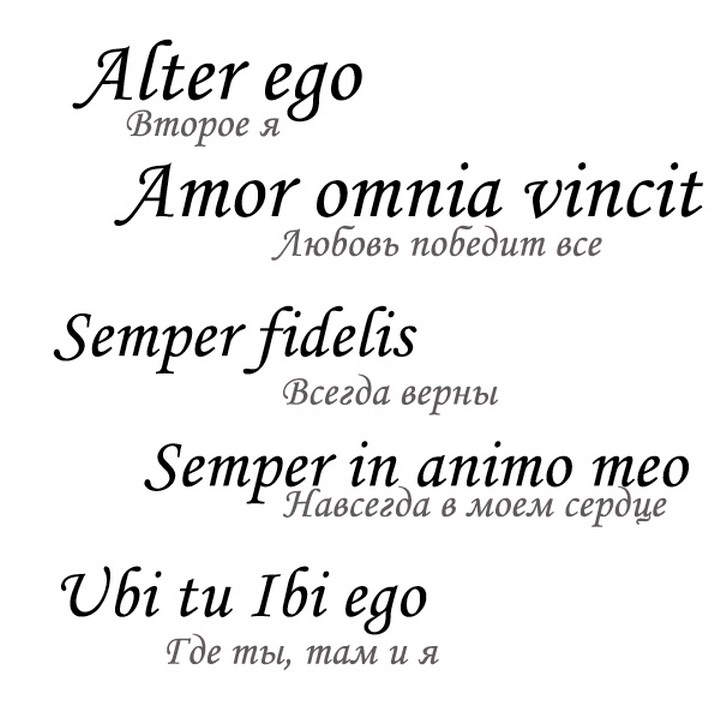 Les inscriptions en langues étrangères sont très populaires, où le choix de la police et du style est le vol du fantasme du propriétaire du tatouage et de l’habileté du maître. Dans la forme et le style, il n'y a pas de grande différence entre un tatouage masculin et féminin sous la forme d'une inscription. Le tatouage d’un homme peut être plus agressif et brutal, mais celui d’une femme a l’air plus tendre et féminin, bien que cela dépende beaucoup du caractère et de la position de la vie. Très souvent, le français est utilisé dans les inscriptions de tatouage. Dans cette langue, les dessins de sous-vêtements romantiques et amoureux sont excellents. Les paroles des grands philosophes français prendront la place qui leur revient sur votre corps. Les maximes de Voltaire, René Descartes ou Albert Camus sont populaires. L’italien convient aux phrases de motivation, mais vous devez faire très attention lorsque vous traduisez à partir de cette langue. L’italien, comme le russe, est l’une des langues les plus difficiles.