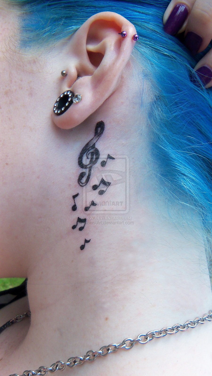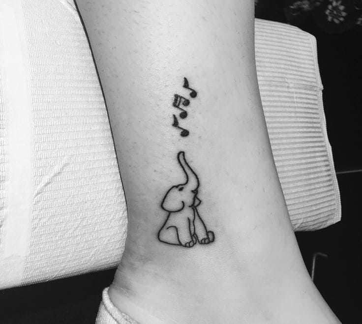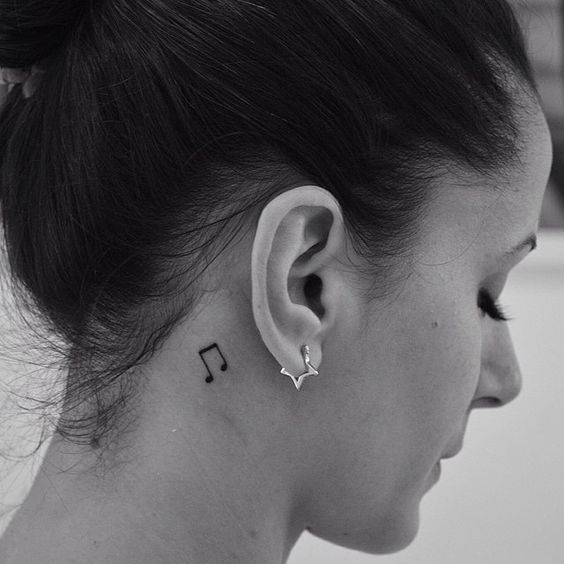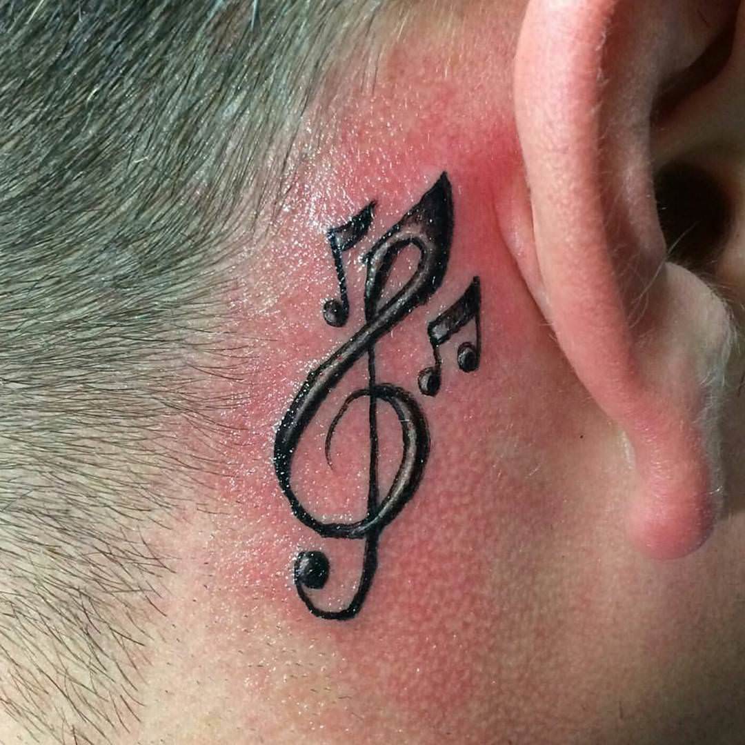 Le tatouage réalisé derrière l'oreille n'a pas d'importance particulière. Un tel motif pectoral est plus décoratif. Les filles choisissent des notes de tutu derrière l'oreille pour souligner la féminité, la tendresse et leur sexualité. Beaucoup de filles, tatouées avec l’image de plusieurs notes miniatures derrière l’oreille, cherchent à mettre l’accent sur la courbure et la beauté du cou. Un tatouage masculin avec l'image de notes derrière l'oreille dira aux autres l'appartenance de cette personne au monde de la musique.