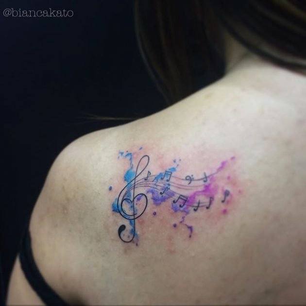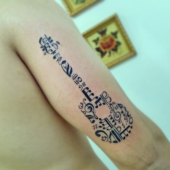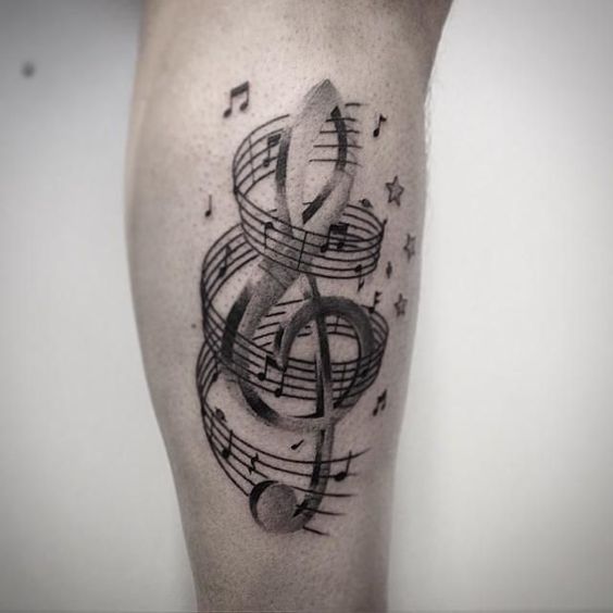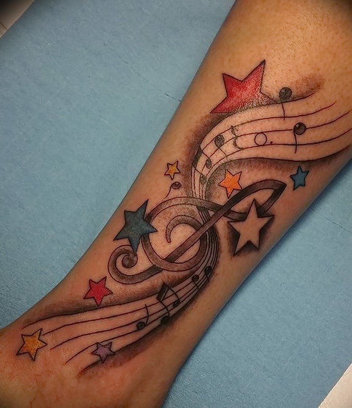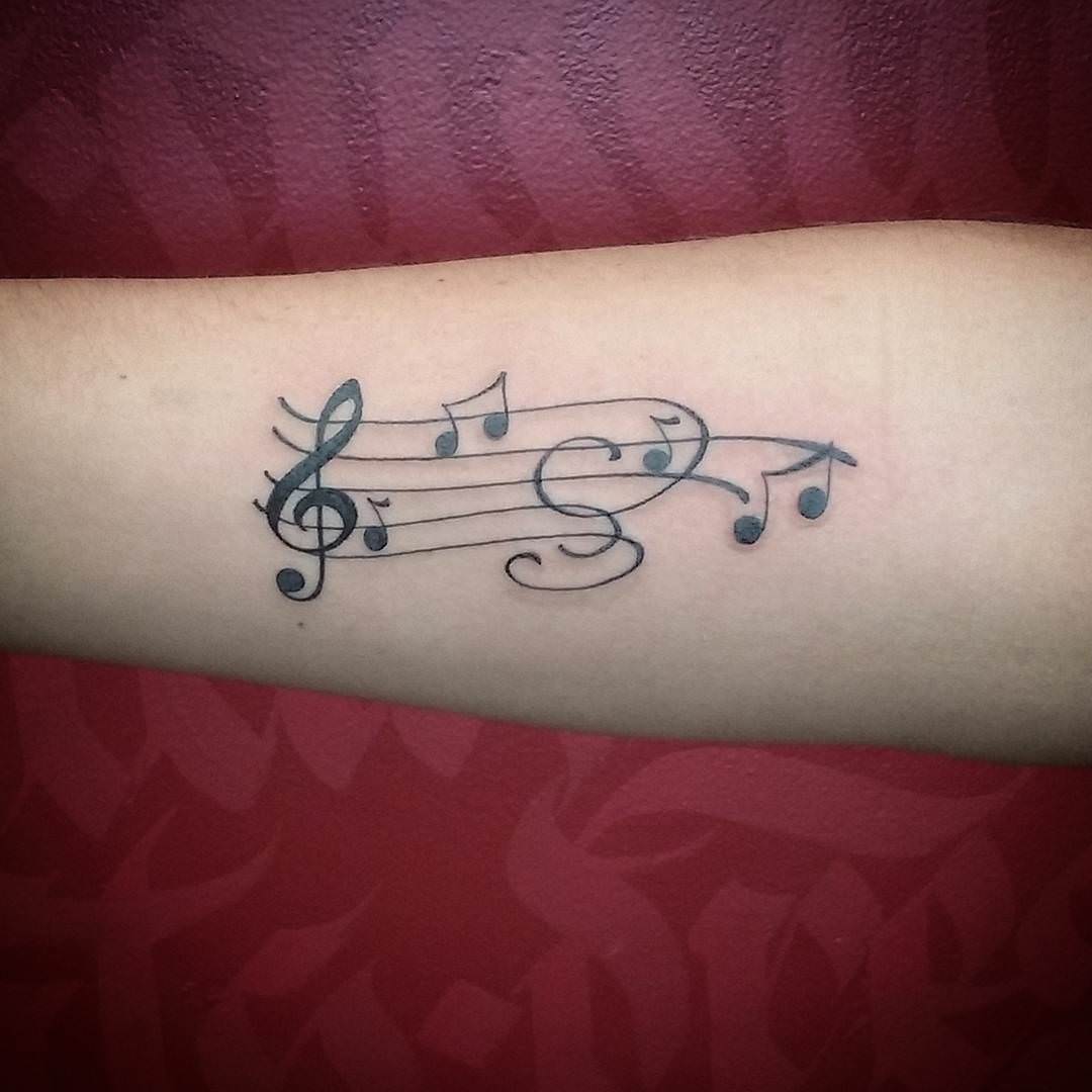 On pense qu’un tatouage avec l’image de notes ou un bâton musical signifie un amour ou un rapport direct avec la musique, ainsi qu’une nature subtile et créative. Très souvent, un tel tatouage est appliqué par des personnes possédant un instrument de musique ou des personnes ayant une âme créative.