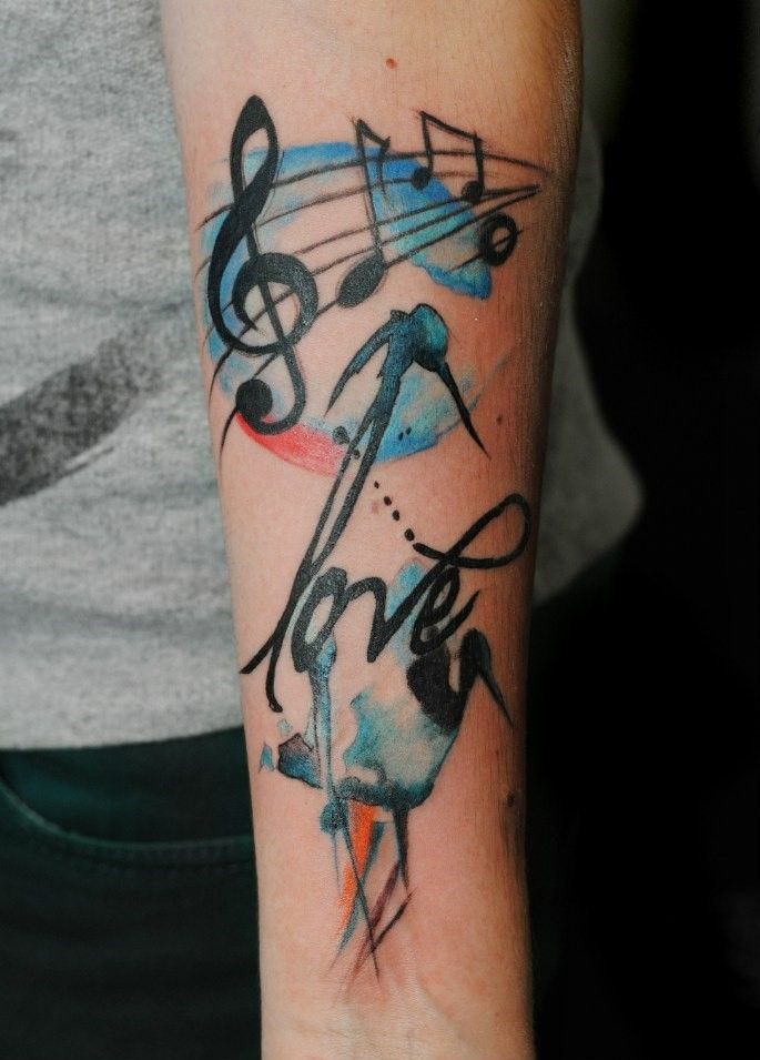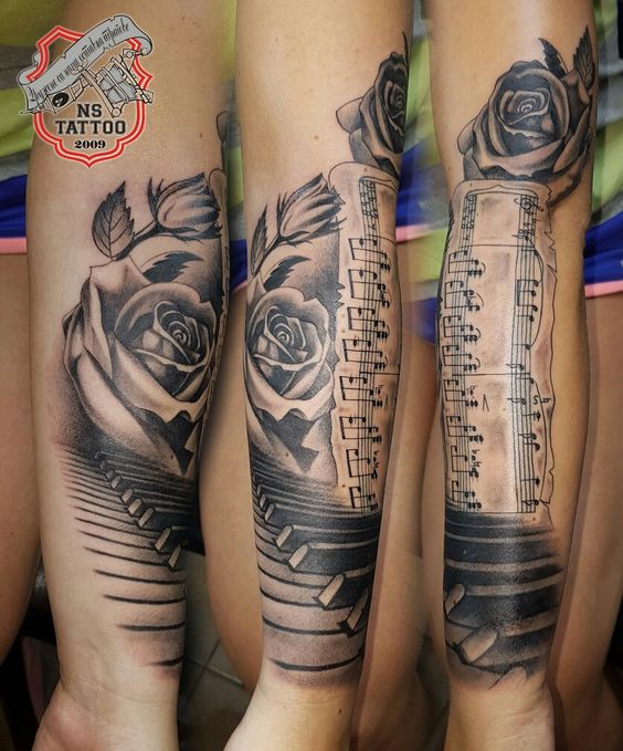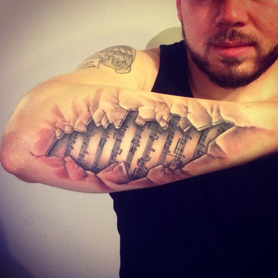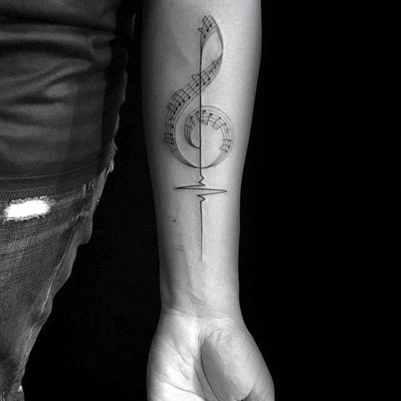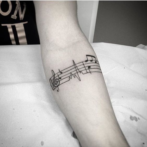 Un tatouage de notes sur le bras est très harmonieux.Cela peut être un petit tatouage sous la forme de plusieurs notes au poignet, faites comme un bracelet ou verticalement. Superbe tatouage avec une portée sur l'avant-bras. Les tatouages avec des notes sur la main sont utilisés par les personnes qui veulent montrer aux autres leur implication dans la musique ou dans des événements en rapport avec des activités créatives.