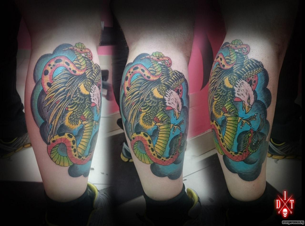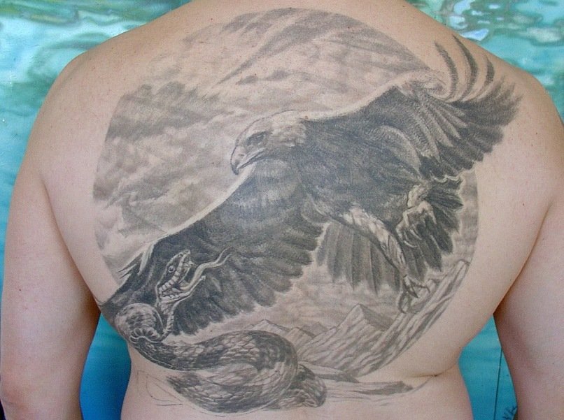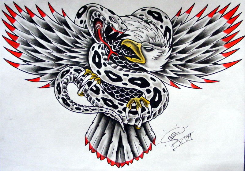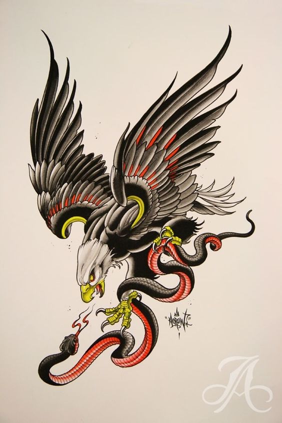 Eagle - libre et fier, torturant impitoyablement la victime, est sans aucun doute le roi parmi les oiseaux. L'image d'un aigle qui réprime un serpent signifie la victoire sur les circonstances et le mal. Une aquarelle représentant un aigle avec un serpent aura l’air audacieux et original. Un mélange de nuances et de tons donne à l'illustration sérénité, légèreté. L'encre brillante procure une sensation de liberté et d'aisance. Les thèmes de l'image d'un oiseau qui cherche à se nourrir sont spectaculaires. Certains détails du tatouage d'un aigle avec un serpent indiquent certains traits du personnage du propriétaire.Par exemple, l'image d'un oiseau en vol avec des griffes écartées indique une agressivité.
