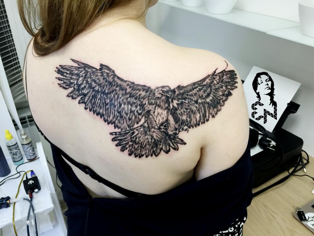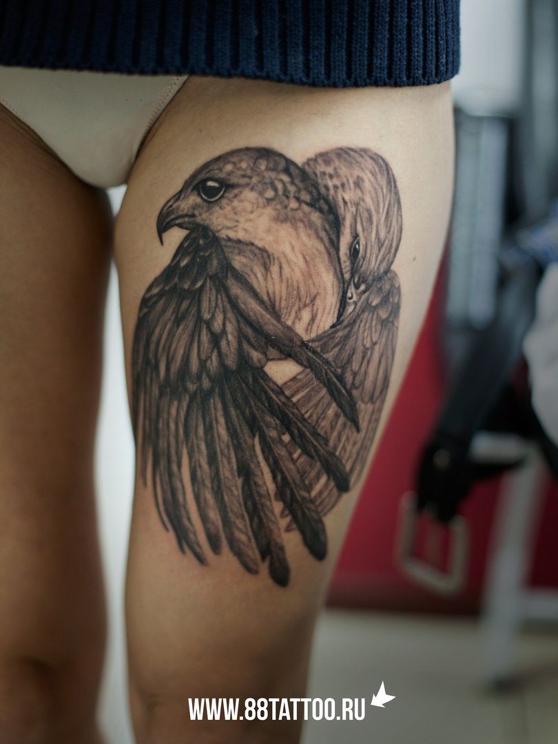En étudiant l’histoire du développement de l’humanité, des cultures et des époques, il est établi que le tatouage est inextricablement lié à une personne qui aspire toujours à s’exprimer, en particulier à notre époque, alors que le tatouage est devenu une véritable tendance. Les garçons et les filles essaient de décorer leur corps avec des tatouages à la mode, ne comprenant pas toujours leur signification, ou vice versa, ils choisissent consciemment, comme pour laisser les autres savoir quel genre de personne vous êtes et quel est votre personnage. Le choix de beaucoup réside avec le tatouage sous la forme d'une image d'un oiseau d'aigle fier - un symbole de feu et d'immortalité, de force et de puissance, d'esprit de jeunesse.