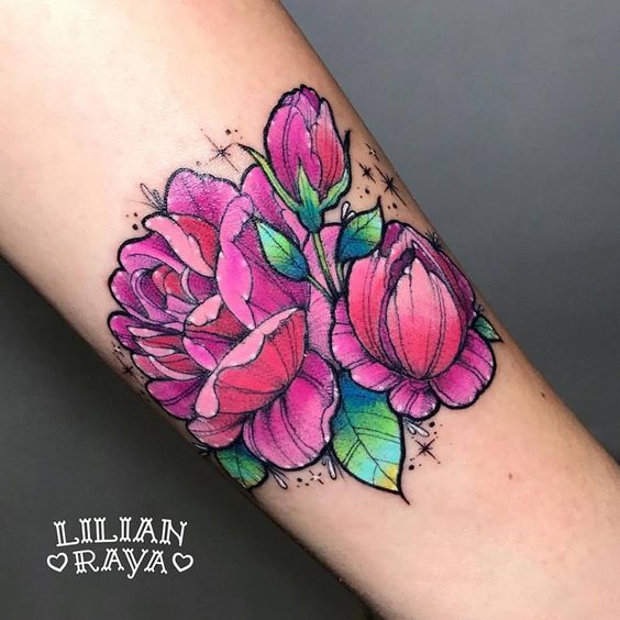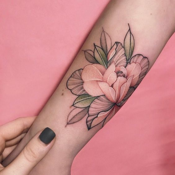 Le tatouage d'une fleur de pivoine sur son bras est superbe. Mais ici, l'image devrait être petite. Cela peut être une seule fleur ou une mini image d'un bouquet. Quel sera le motif dépend de la signification que vous donnez à votre tatouage? Les tatouages de pivoines sur l'épaule sont très populaires et se déplacent doucement jusqu'au cou. Un tel tatouage peut être plus volumineux. Une autre version de la grande image est un tatouage en forme de manchon avec des pivoines. Il part du poignet, traverse tout le bras, atteint la base du cou ou plus haut en passant à la clavicule. Si vous décidez de faire un dessin miniature d'une pivoine, qui aura une signification purement personnelle, la partie sur laquelle elle sera exécutée importera peu. Mais le plus souvent, un tel motif est appliqué au poignet. Le tatouage de pivoine sur le bras a une solution universelle pour les femmes et les hommes.