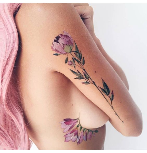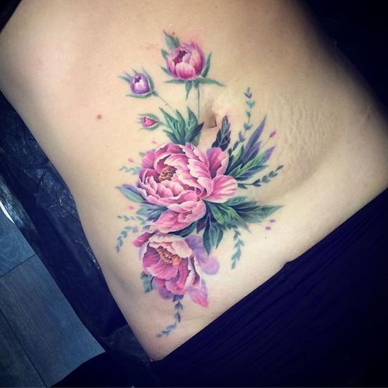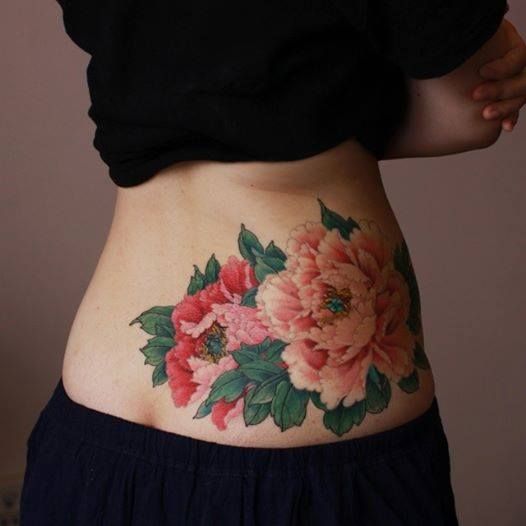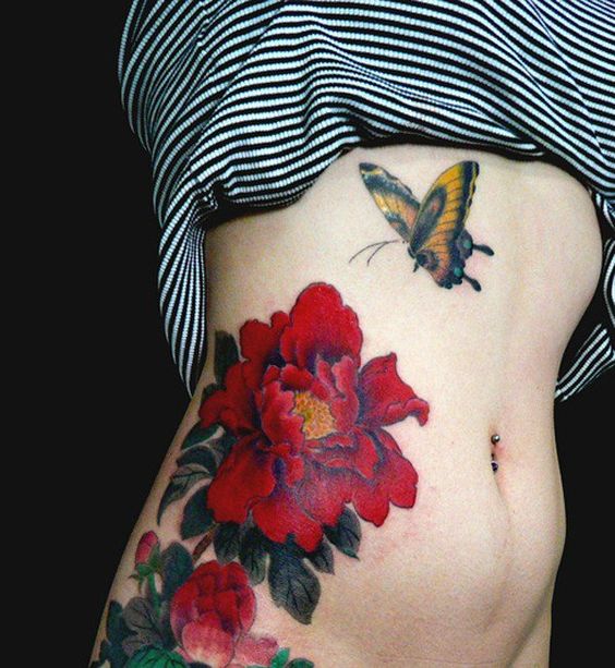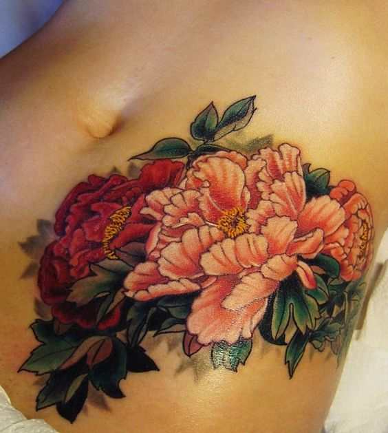 Le tatouage de pivoine sous la forme d'un décor lumineux sur le ventre est original et attrayant. Un tel tatouage est considéré comme purement féminin. Lors du choix d'une grande image de plusieurs couleurs pour l'abdomen, il convient de rappeler que cette version du tatouage ne convient que pour les femmes minces avec un ventre plat. L’image attire particulièrement l’attention sur les parties de votre corps et ne doit donc comporter aucun défaut. C’est génial de se faire tatouer une pivoine sous la poitrine ou sur les côtes. Si vous souhaitez obtenir un tatouage dans ces endroits, vous devez vous préparer au fait qu'il s'agit d'une procédure douloureuse. Décidez si vous êtes prêt à supporter l'inconfort pendant le tatouage et le processus de guérison.
