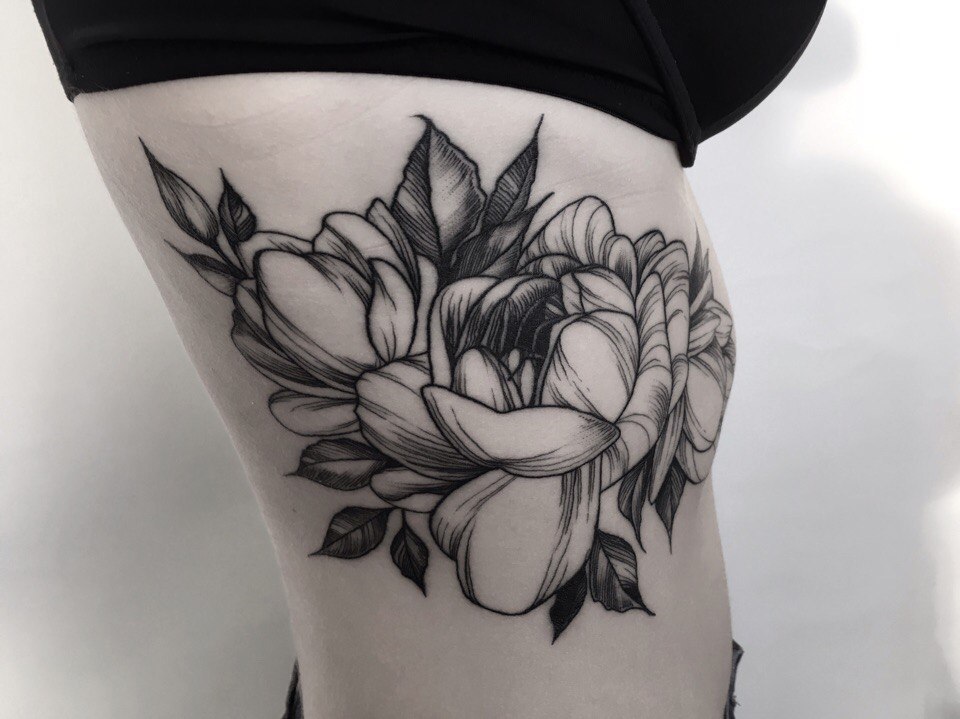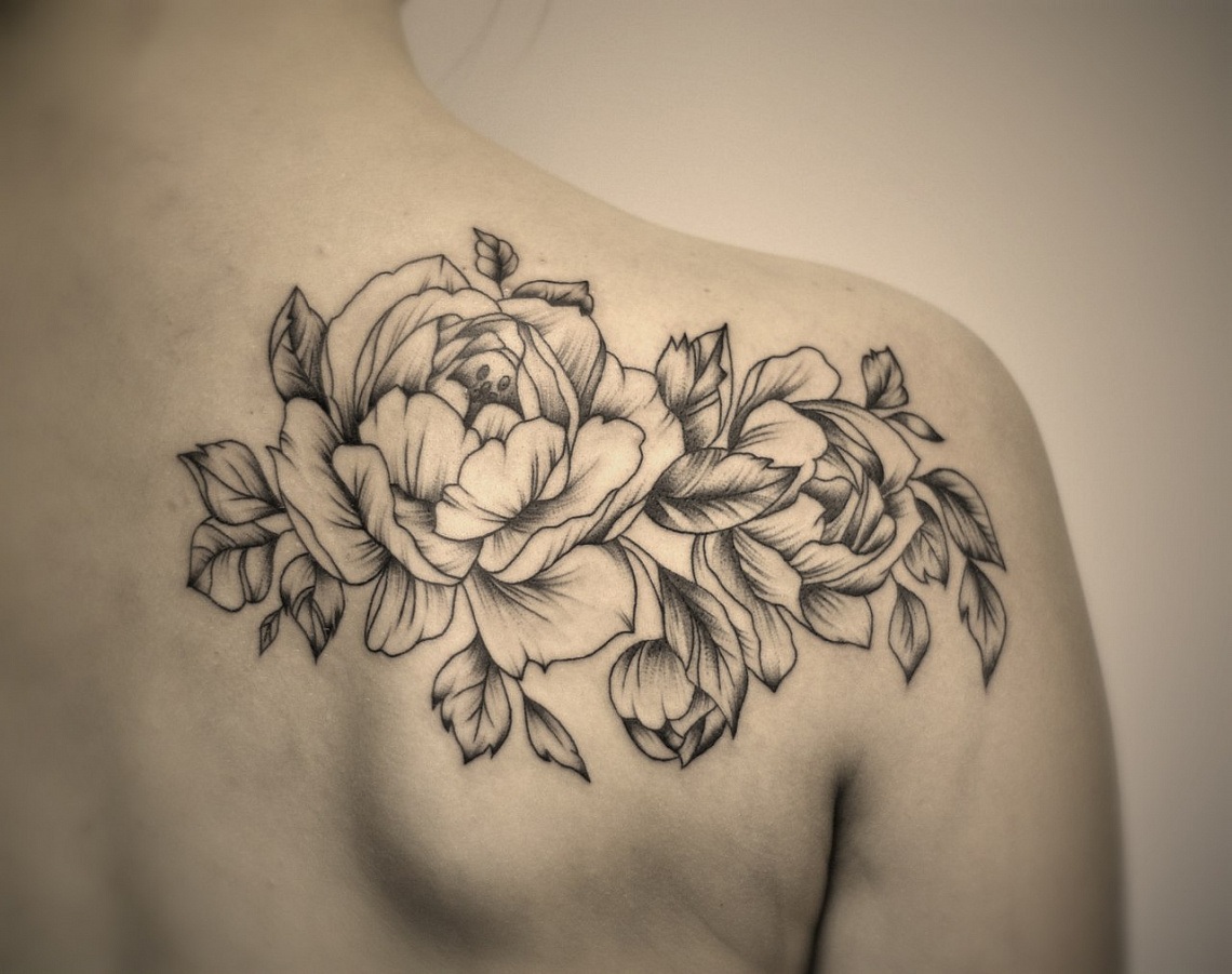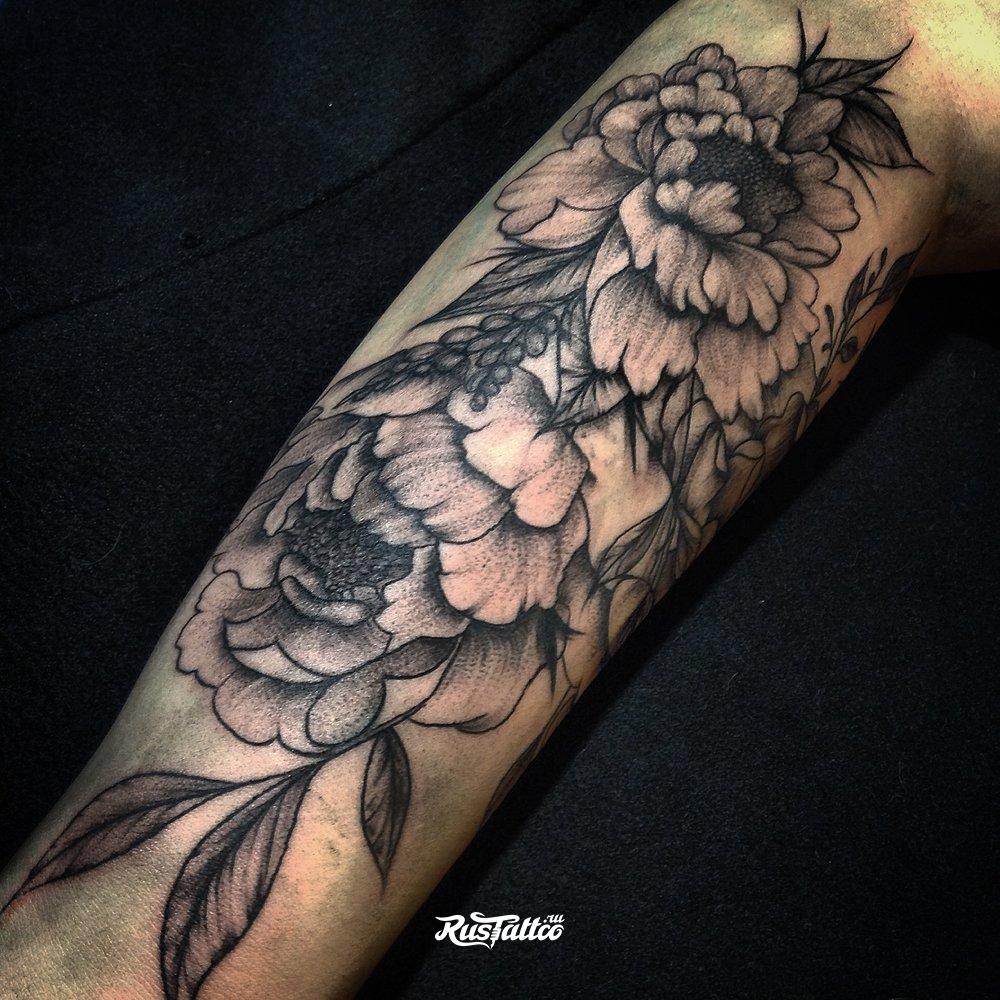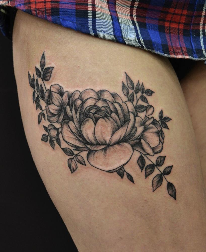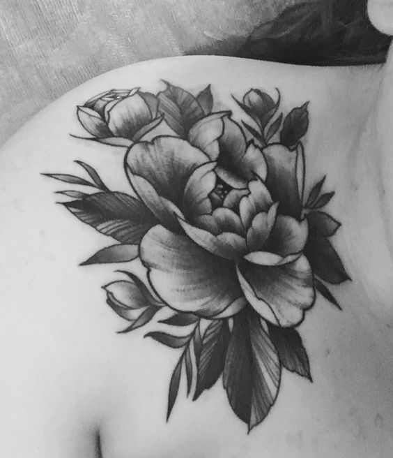 Mais tout le monde n’aime pas les tatouages colorés et vibrants. Les amateurs de classiques trouveront un tatouage de style asiatique - une pivoine noire.En noir et blanc, un tel tatouage est beaucoup plus simple que la couleur, mais son look est unique et original.