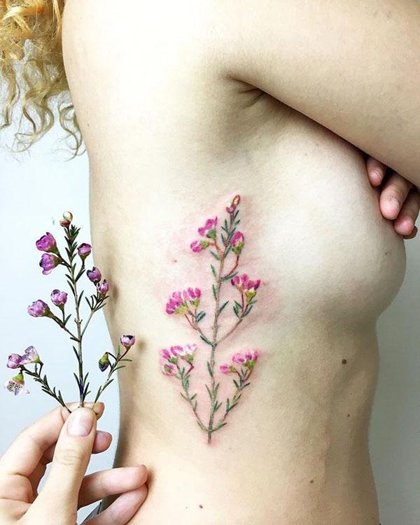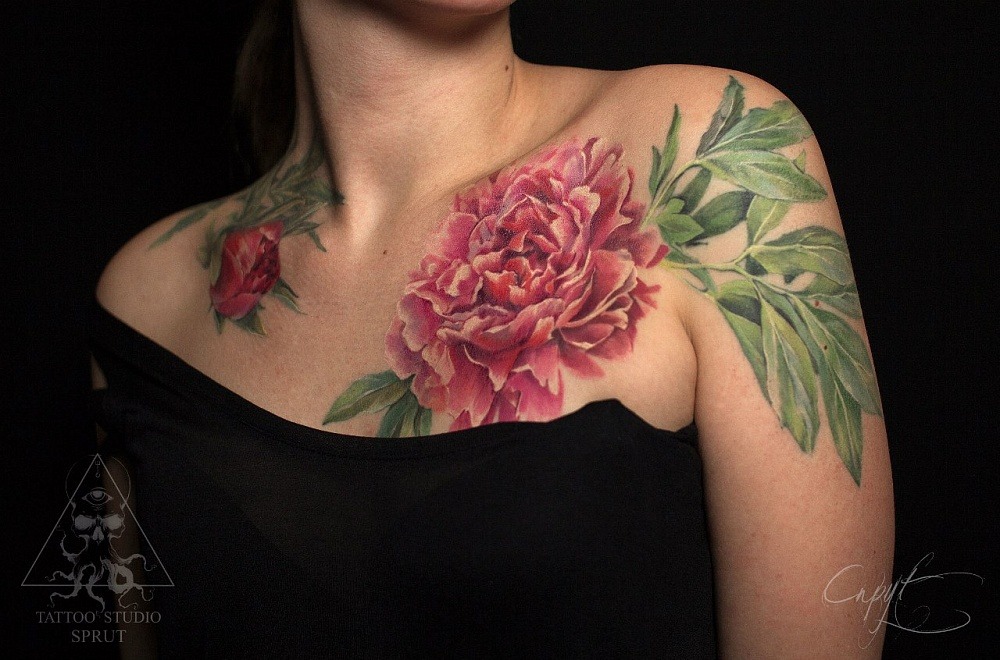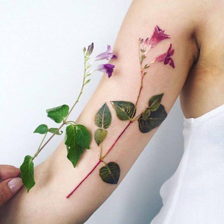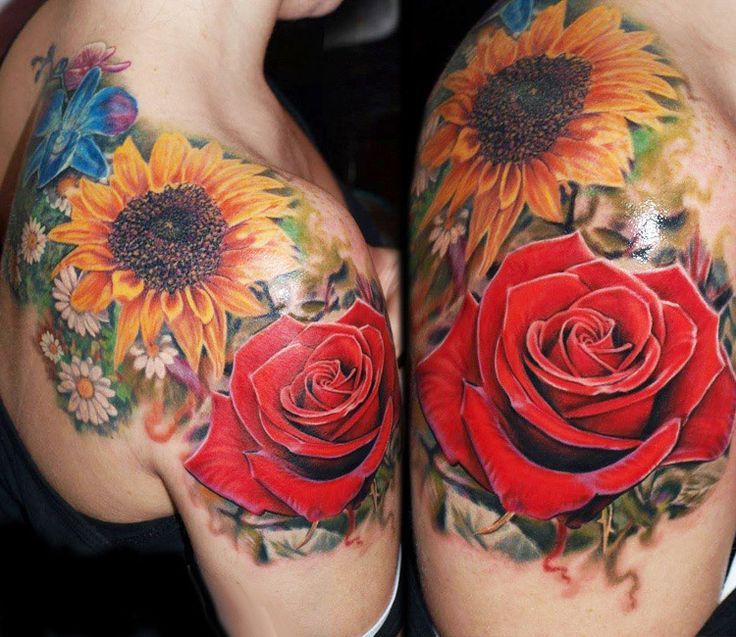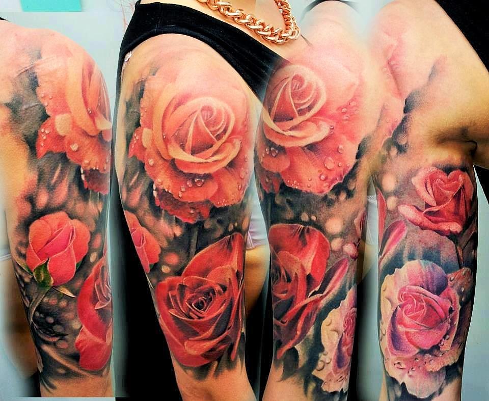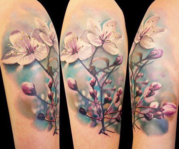 Un tatouage avec une variété de couleurs s’incarne dans tous les styles, y compris le réalisme. Le tatouage en couleur est l'un des motifs les plus populaires chez les filles. Ces tatouages incluent une belle image extérieure avec une signification profonde. L'avantage principal du réalisme dans l'exécution des fleurs est que vous pouvez demander au maître d'appliquer non seulement une fleur, mais un beau bouton avec de petites gouttelettes de rosée du matin ou de pluie. Ces détails insignifiants ajoutent une signification et une couleur supplémentaires au dessin, le rendant unique.