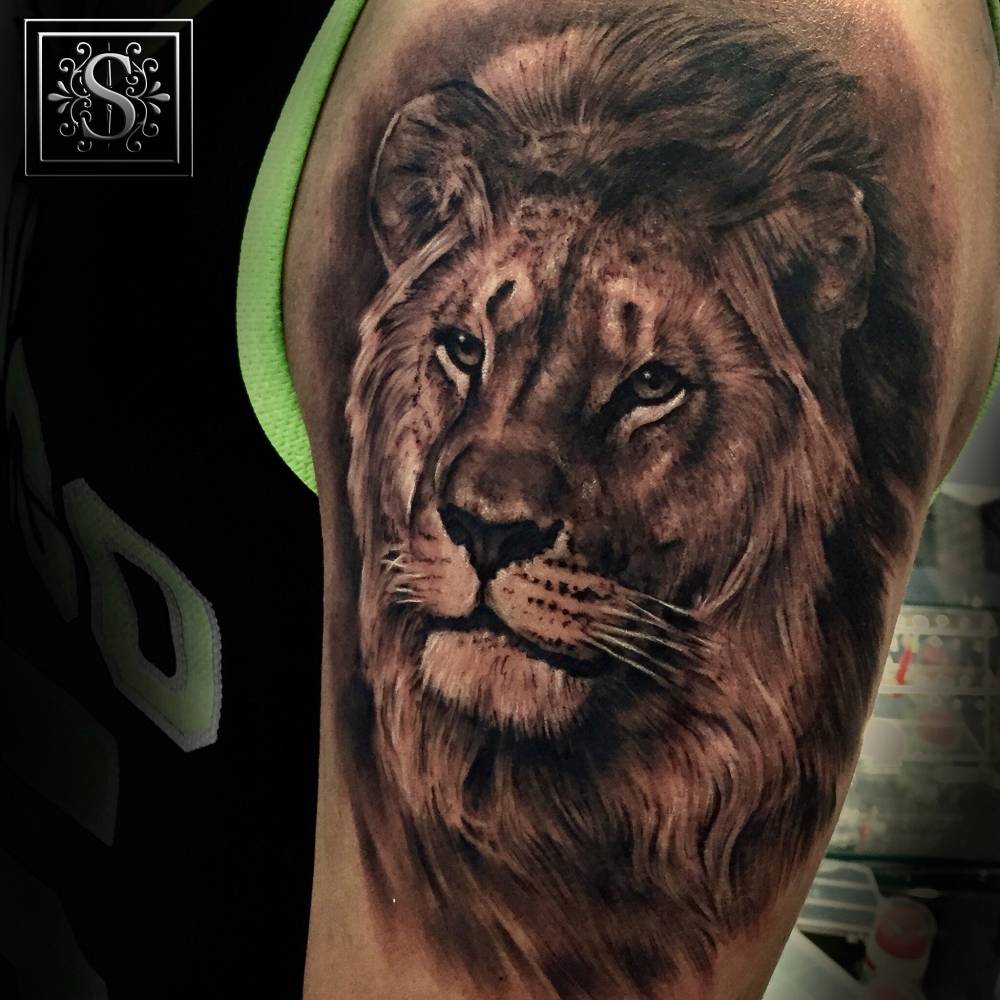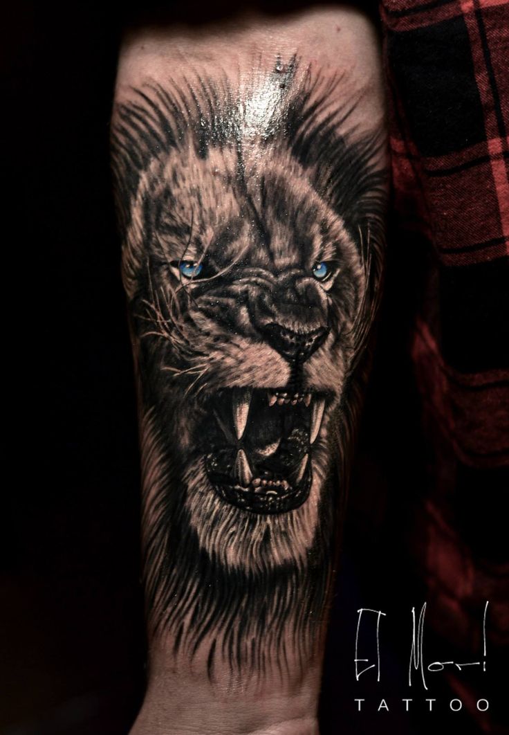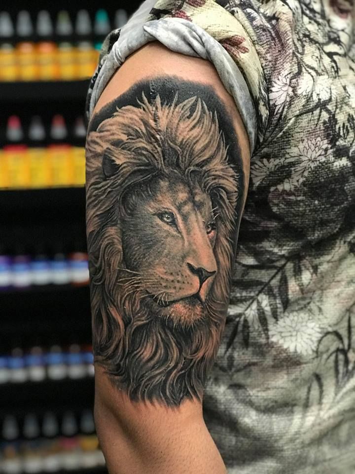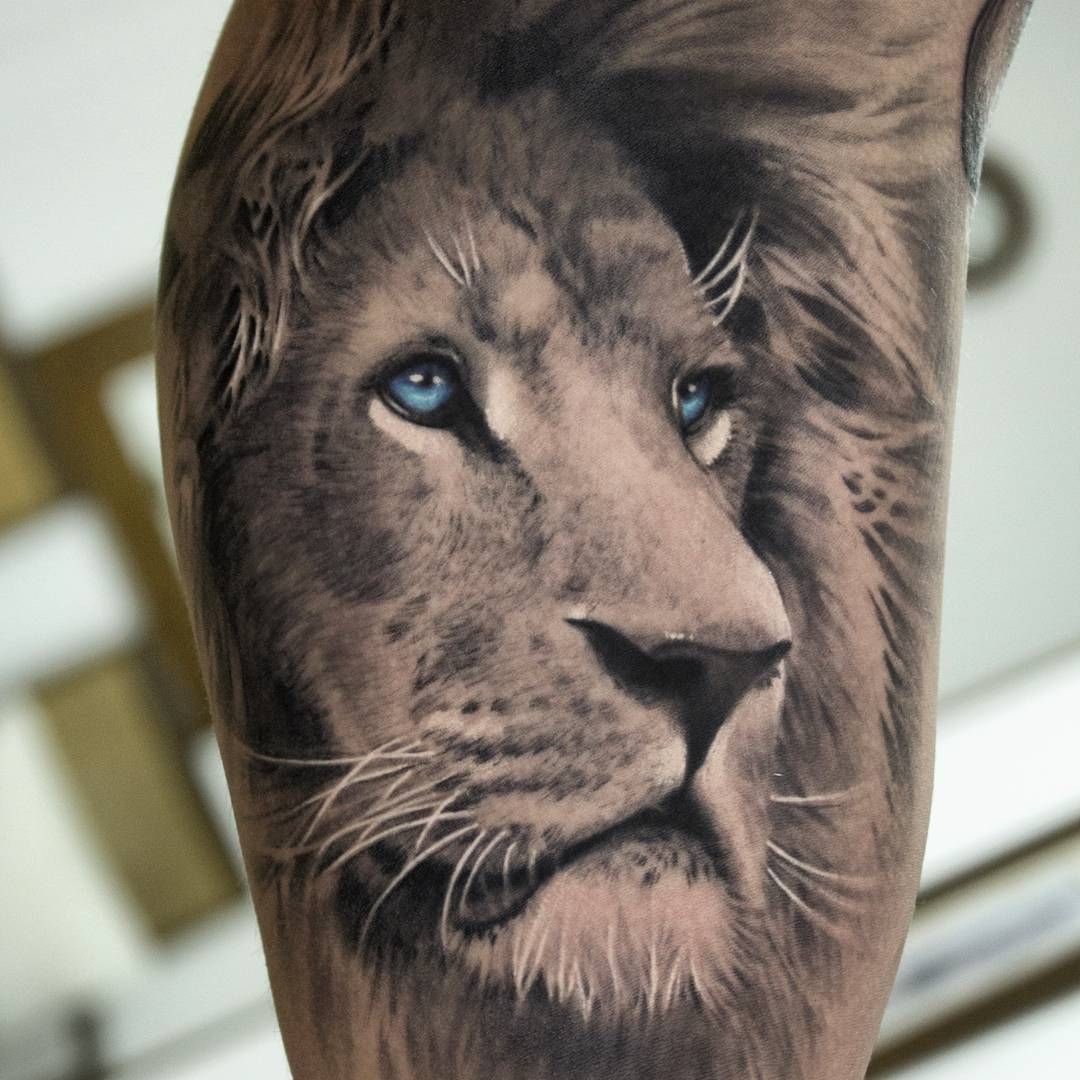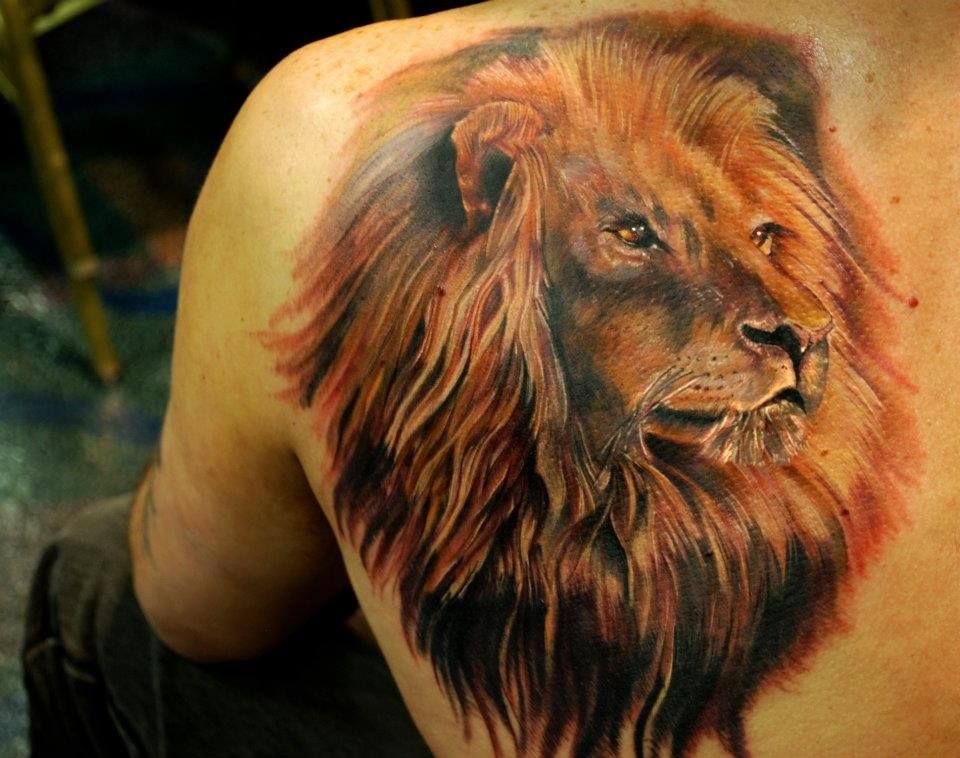 Une image de lion dans le style du réalisme aura l'air très précis et crédible. Cet animal porte un symbole de courage, de courage, de fierté et de courage. Les tatouages dans une variation multicolore sont plus efficaces.