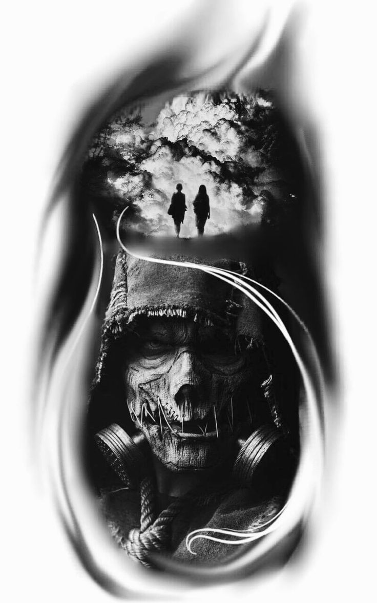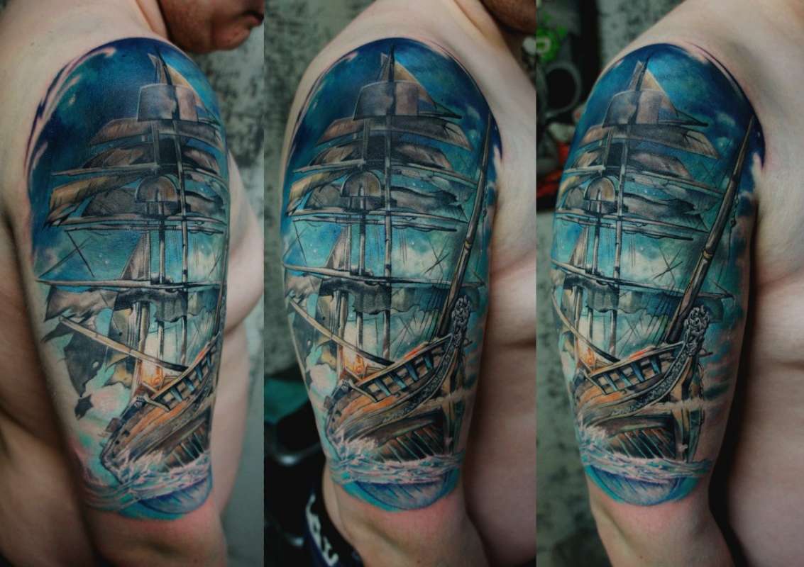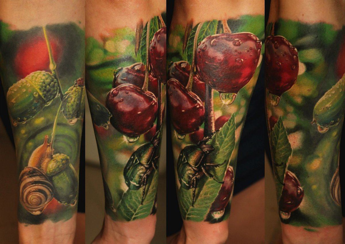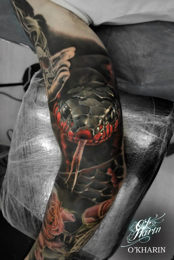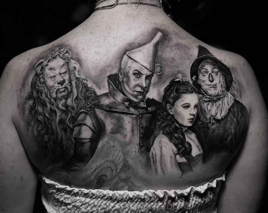 Manchon de tatouage dans ce style implique une image de l'intrigue à grande échelle. Le plus souvent, une combinaison de portraits, d'éléments d'architecture ou de nature est représentée sur la manche. Il y a souvent des images spéciales de leur monde imaginaire.