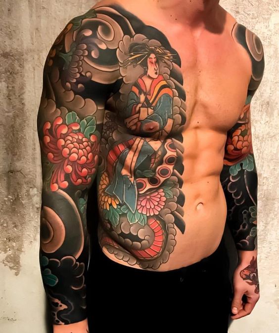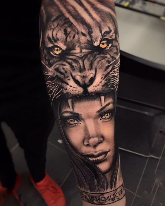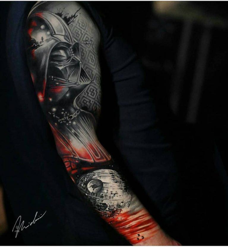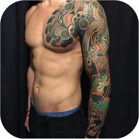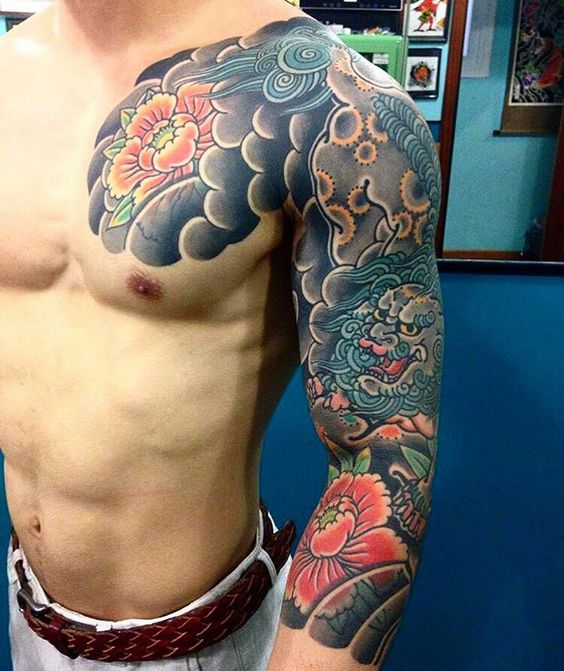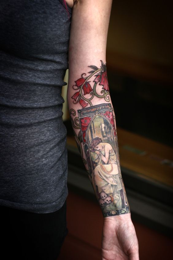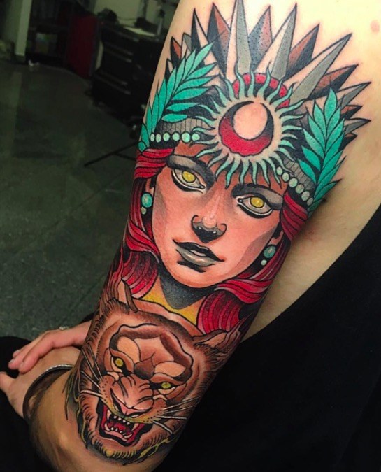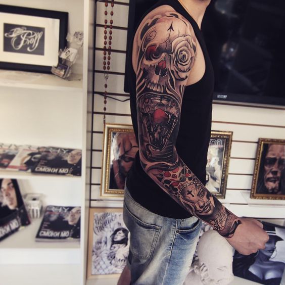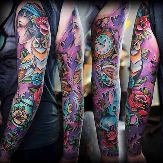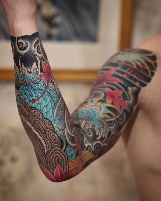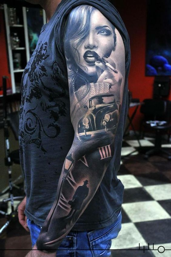 L'esthétique de la manche dépend du style du tatouage. Il existe des dizaines de genres de beaux tatouages en couleurs pour les hommes et les femmes à travers le bras. La provocation est le truc principal du tatouage polka couleur trash polka. Sur des images de ce genre, vous verrez le plus souvent de l'ironie, du sarcasme et même un langage obscène. Tresh Polka combine le look magnifique du dessin et le regard douloureux de la mort et de l'horreur. Un grand dessin semble plus intéressant, car vous pouvez y exprimer votre sens unique du tatouage. Le style de réalisme est considéré comme le plus difficile à réaliser dans un tatouage coloré sous la forme d’une manche, mais très demandé et à la mode. L'image sur la main de ce type implique une exécution à grande échelle du dessin et produit le plus souvent une combinaison de portraits, faisant partie de la nature ou de l'architecture ou un motif du monde de la science-fiction. Les dessins sur le corps dans le style de la vieille école tirent parti de la luminosité des couleurs et de la précision des lignes, de manière à ce qu'ils soient aussi clairs et volumineux que possible. Il y a souvent des images de visages, de sirènes, de navires, de roses des vents, parfois de papillons et d'animaux à caractère agressif, comme un tigre, un jaguar.