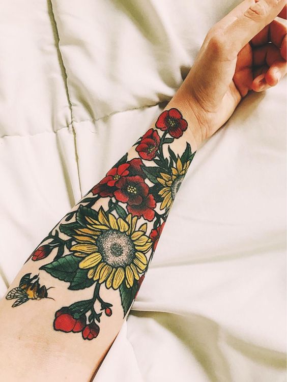 La structure du tatouage peut occuper la moitié, la troisième ou la quatrième du bras. La partie sélectionnée pour le tatouage est entièrement peinte: plusieurs couleurs et des dizaines d’éléments y sont combinés. Dans un tatouage au coude, la représentation du monde animal exprime le dévouement, le courage, le courage. Eh bien, l'image d'un artiste rock vous indiquera votre attitude vis-à-vis de la créativité et un lien possible avec la musique.