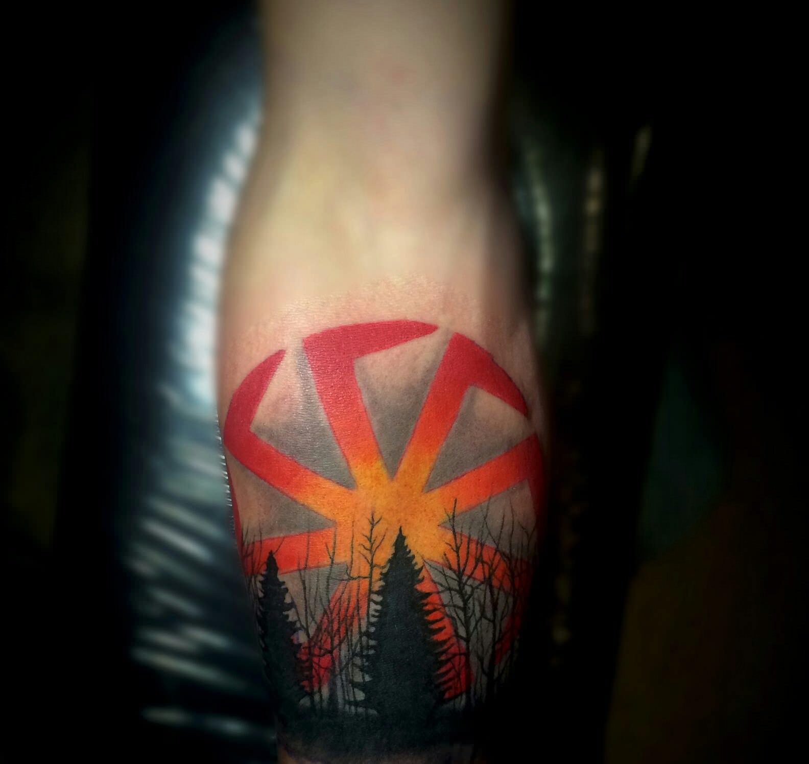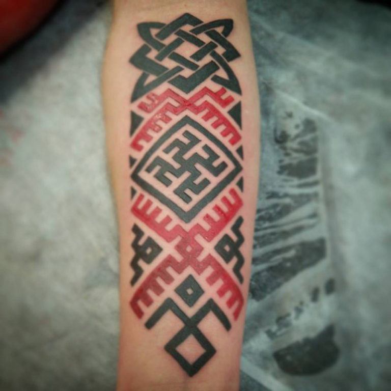Les runes sur un ton rouge sont très courantes chez les filles et les hommes. La couleur rouge en combinaison avec des motifs runiques incarne la valeur, la foi et le désir de leurs objectifs. Le plus souvent, les symboles rouges sur le corps sont interprétés par des hommes confiants qui cherchent à exprimer leur indépendance.