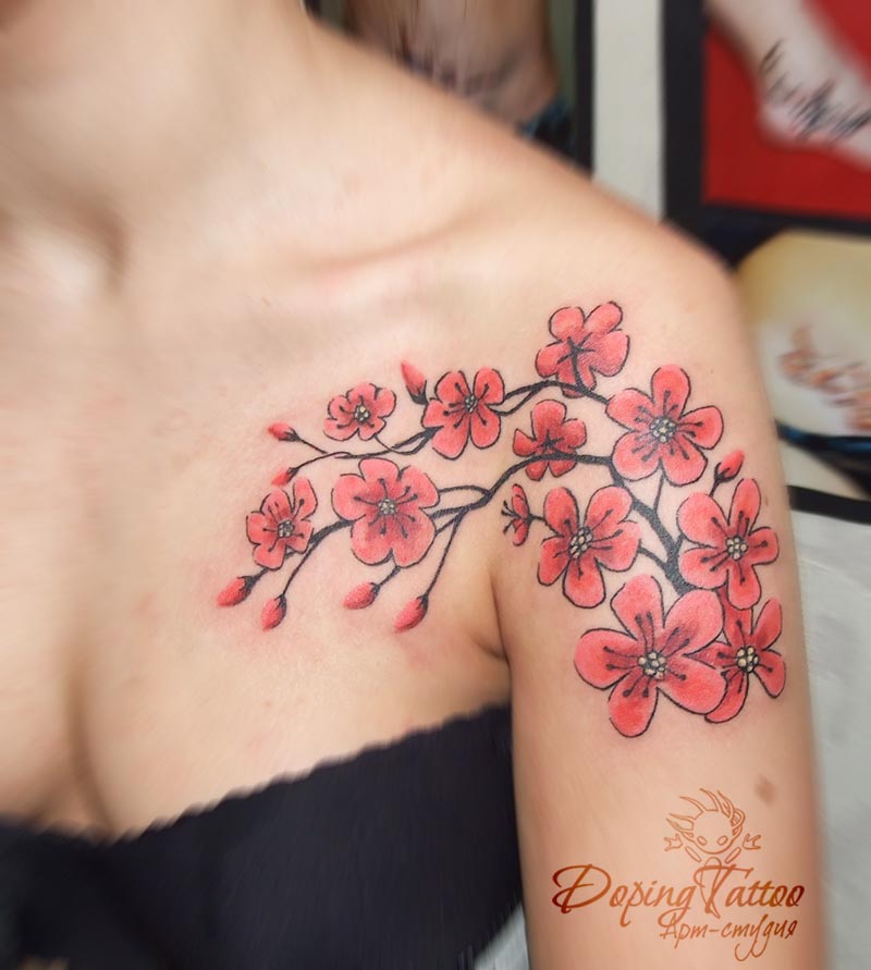 Sakura branch indique que son propriétaire est pressé d'explorer le monde, de faire de bonnes actions, d'apprécier les bonnes actions et de chérir chaque moment de la vie. Sur le corps des filles, la branche sakura témoigne d'un amour sincère, du sacrifice de soi, du dévouement, de la fiabilité par rapport à ses proches.Même en cas de rupture entre les amants, la fille au tatouage de sakura garde tout le souvenir des bonnes minutes passées ensemble. Une branche avec sakura sur le corps aide à croire et à n'espérer que de bons événements dans le futur.