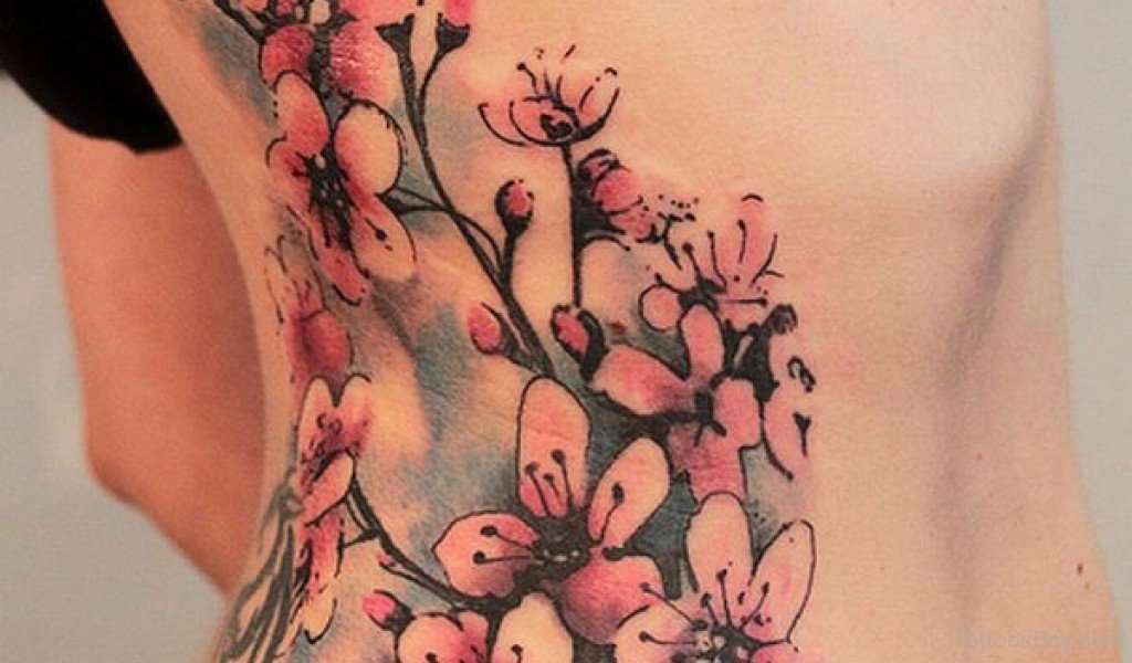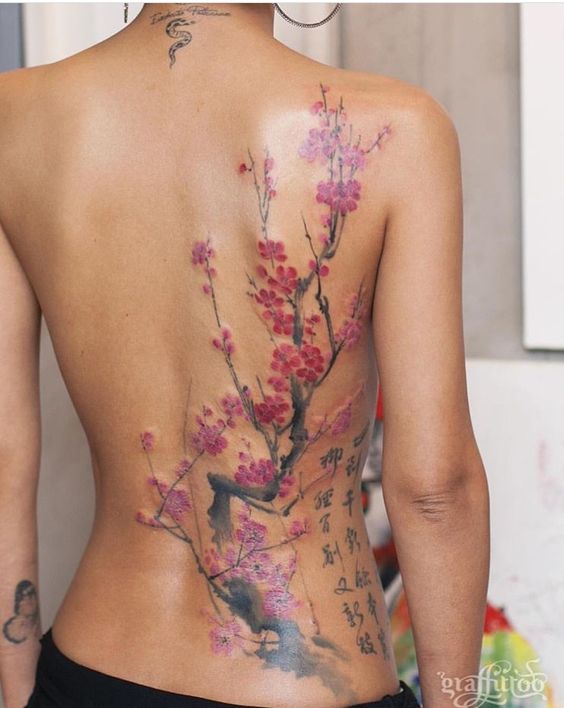 Tatouage du corps féminin avec arbre de sakura décorer. En plus de la beauté et de la sophistication, le tatouage démontre l’éducation du propriétaire. Un arbre aux fleurs épanouies est synonyme d’espoir perdu, de déception et de rêves non réalisés. Et une sakura florissante avec toute sa beauté indique le succès et les espoirs exaucés.