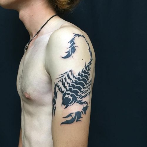 Un tatouage de scorpion minimaliste est un petit motif avec des lignes fines et claires. Un tel tatouage ne porte que l’essence de la photo, alors qu’il n’ya pas de détails inutiles. L'un des styles les plus populaires et les plus impressionnants pour les tatouages de scorpions est le réalisme. Un tel tatouage est principalement réalisé en couleur, mais a fière allure en noir et blanc. Un tatouage de scorpion utilisant des lignes épaisses, une géométrie et des boucles grossières avec des intersections est un style tribal. Cette technique de tatouage à l’image d’un scorpion est très populaire depuis plusieurs décennies. Regarde grand tatouage de scorpion masculin dans le style de poubelle polka. C'est un style audacieux, lumineux et contrasté, qui utilise deux couleurs: le rouge et le noir.