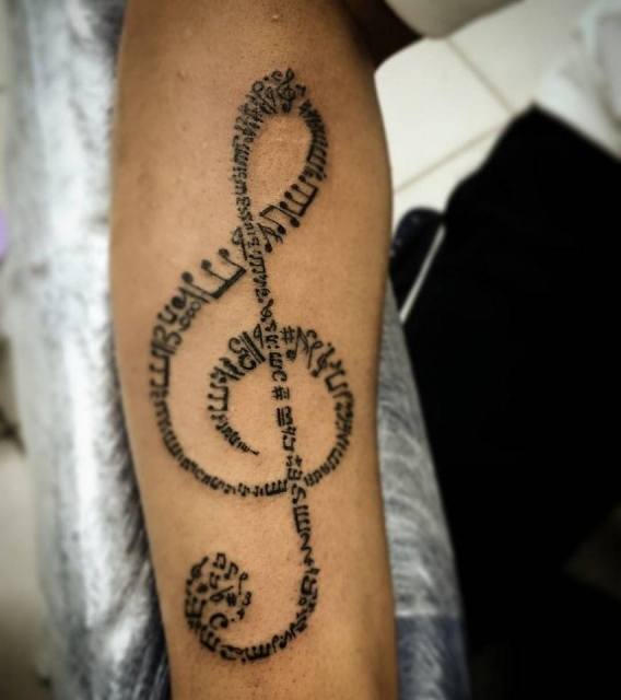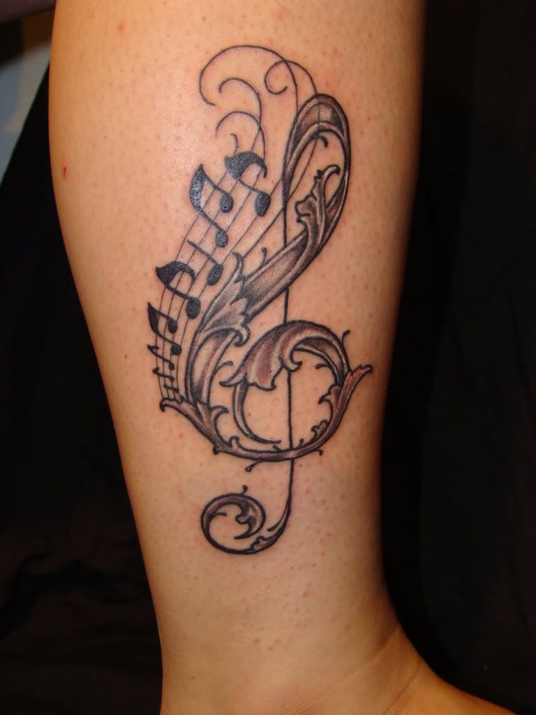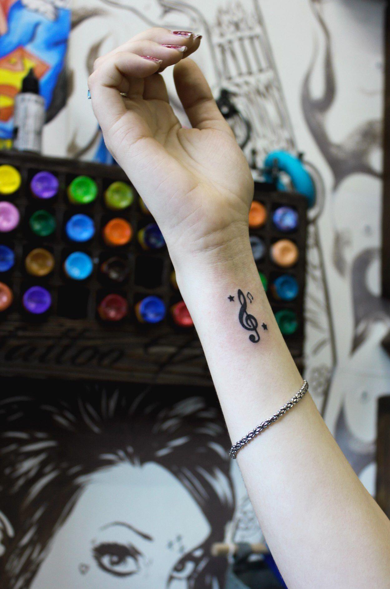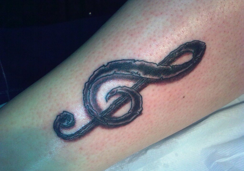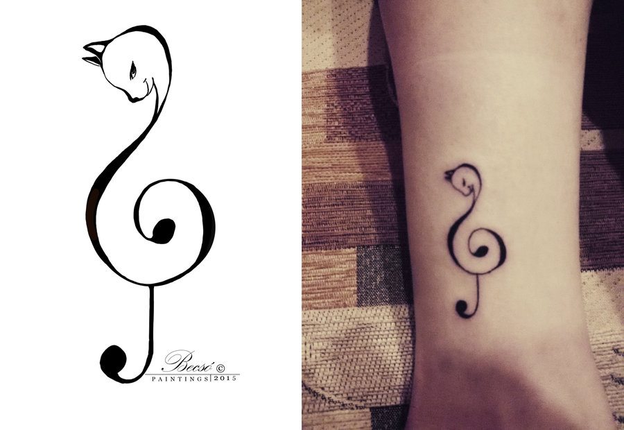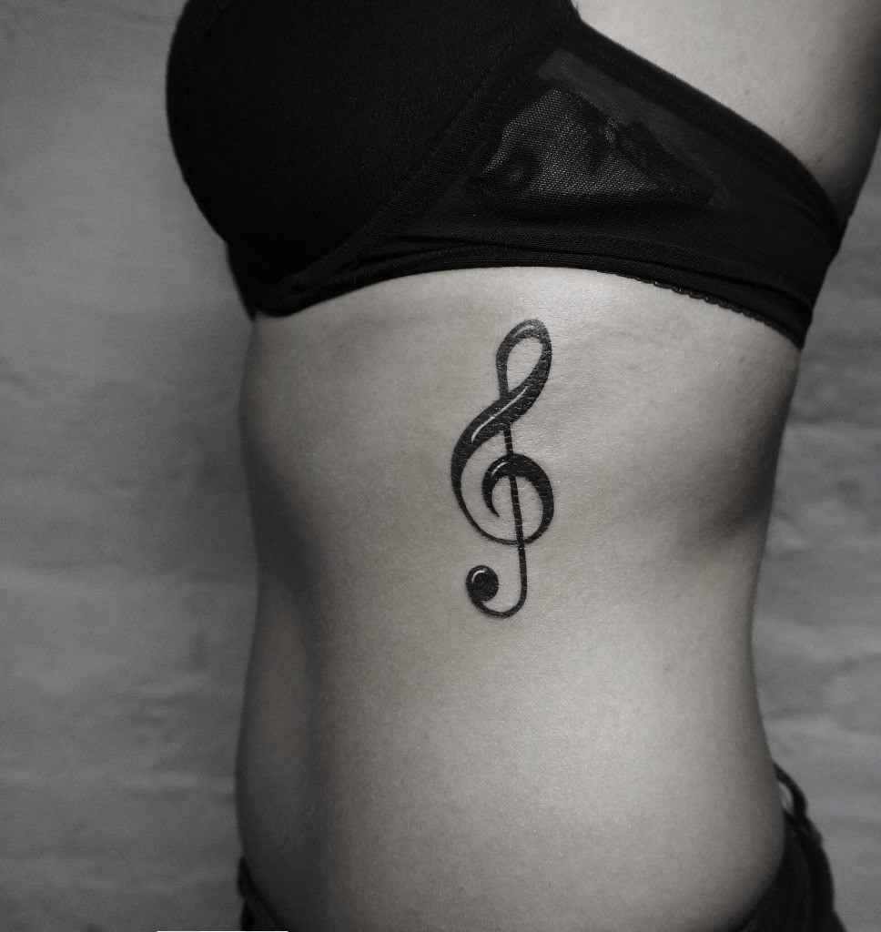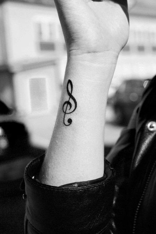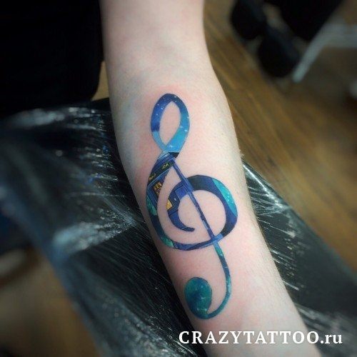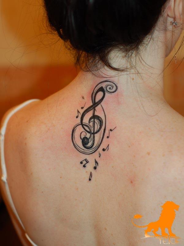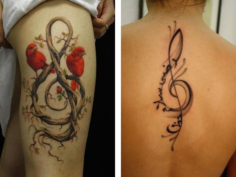 Chacun a sûrement essayé de représenter une note de musique - un signe de clé de sol avec un geste de la main. Et cela dit encore une fois qu'il n'y a rien de compliqué dans l'image de ce signe, mais en même temps ça a l'air très envoûtant. Pas étonnant qu'aujourd'hui ce tatouage soit très populaire. Les filles qui utilisent cette image essaient de souligner leur tendresse et leur sexualité, ainsi que leur sexe plus fort - masculinité et originalité. Dans tous les cas, en choisissant un tatouage, assurez-vous de réfléchir à tous les détails du croquis et ne vous référez qu’aux tatoueurs professionnels.