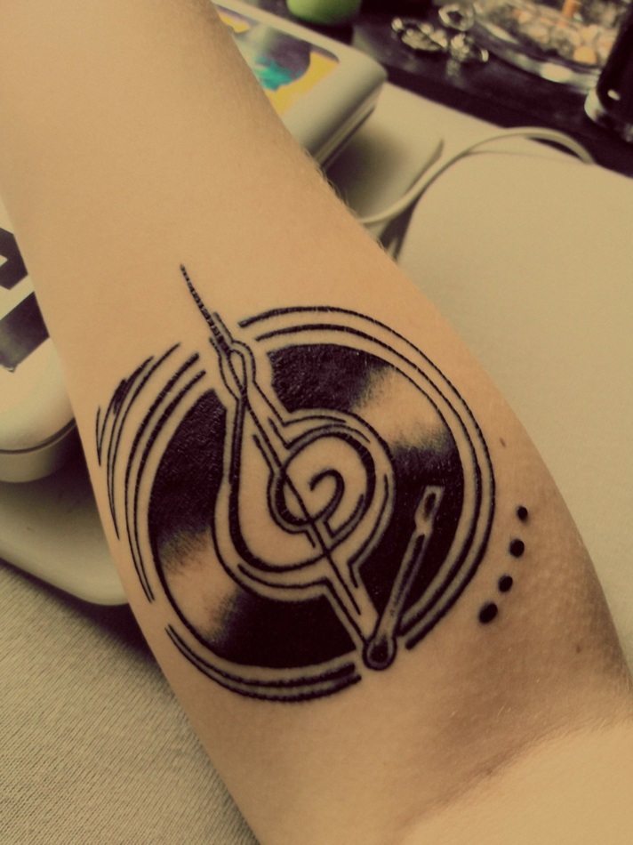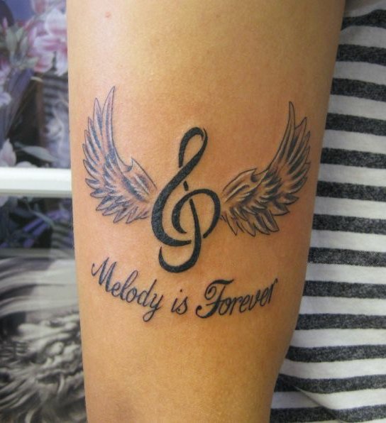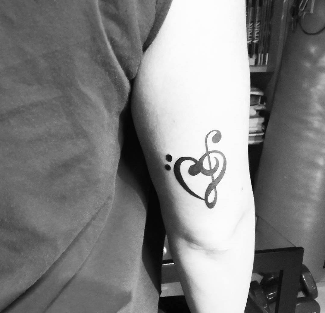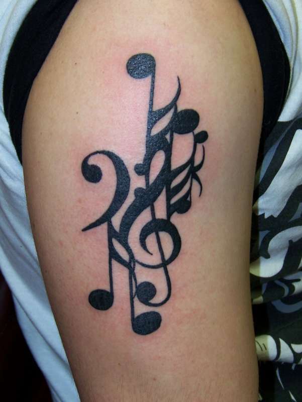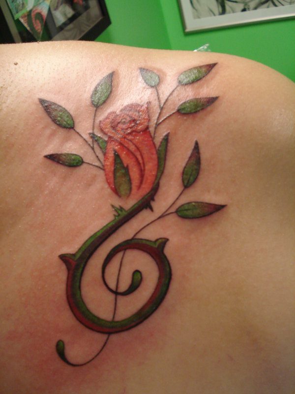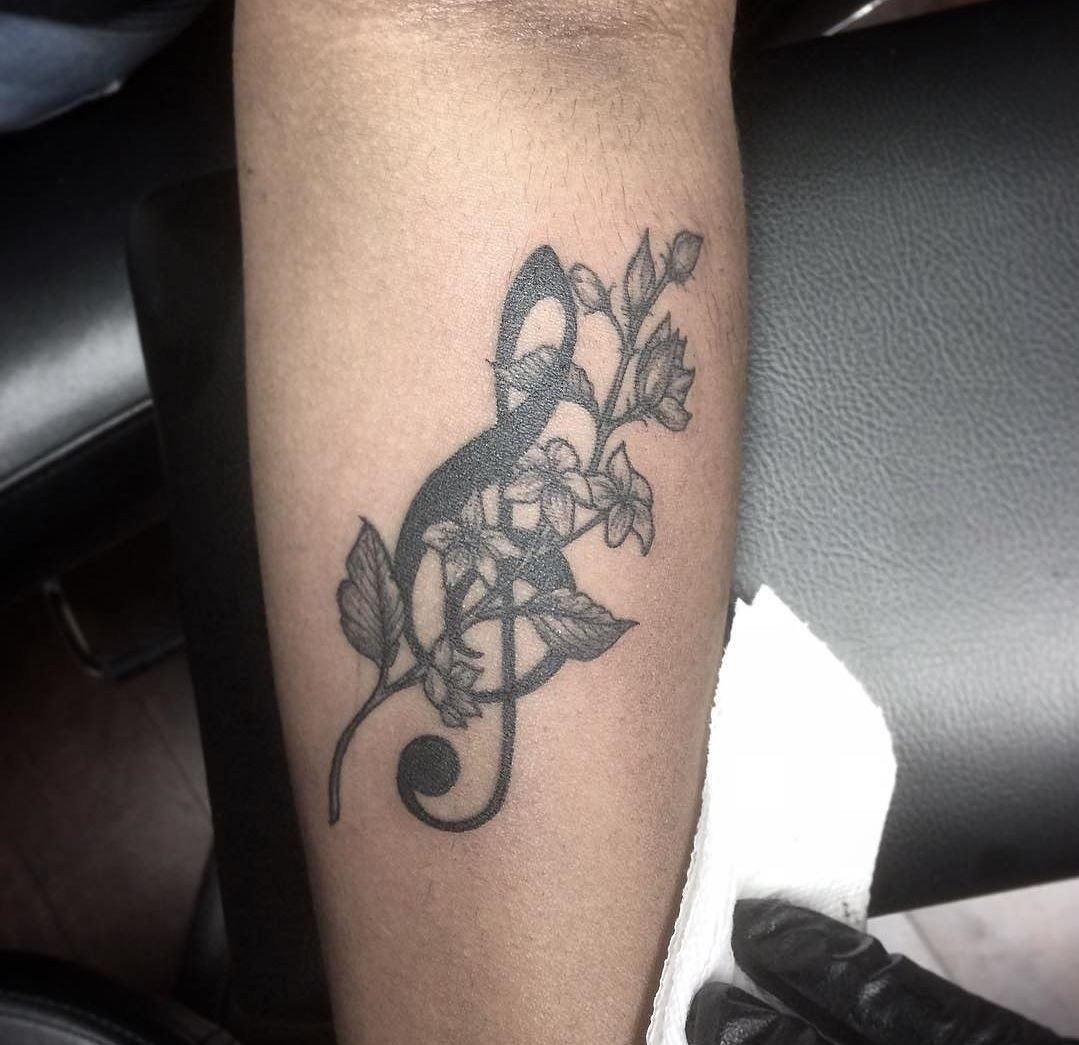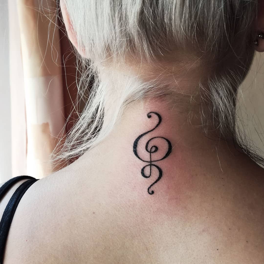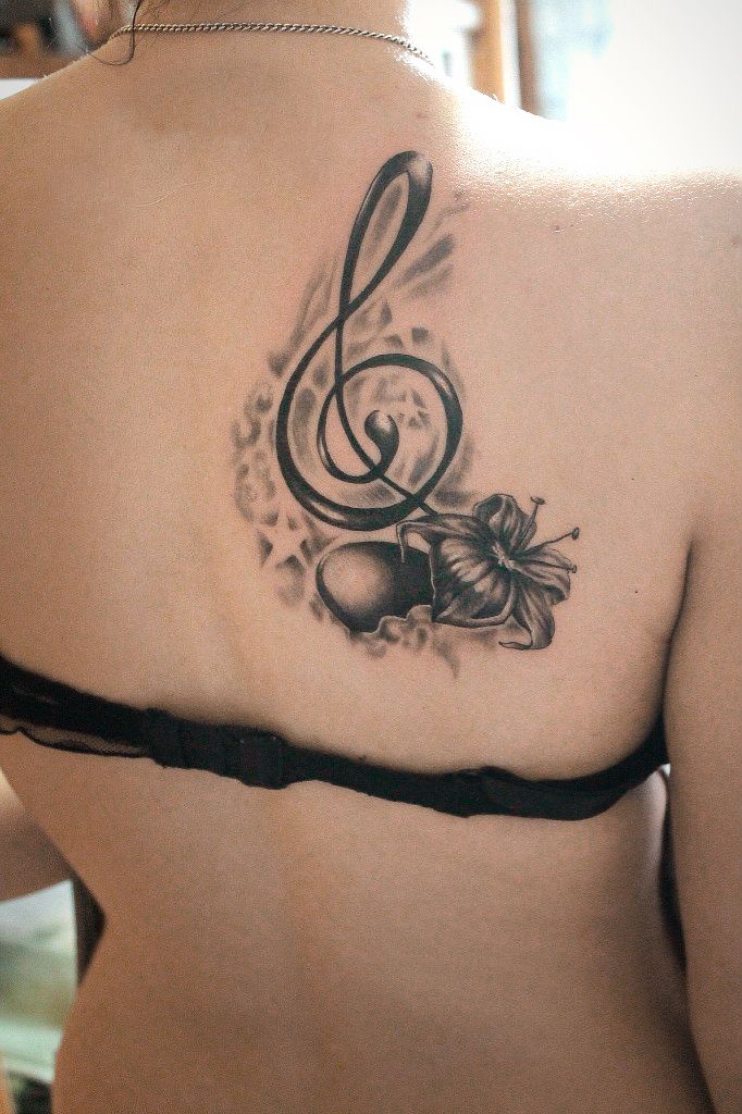 Chacun a sûrement essayé de représenter une note de musique - un signe de clé de sol avec un geste de la main. Et cela dit encore une fois qu'il n'y a rien de compliqué dans l'image de ce signe, mais en même temps ça a l'air très envoûtant. Pas étonnant qu'aujourd'hui ce tatouage soit très populaire. Les filles qui utilisent cette image essaient de souligner leur tendresse et leur sexualité, ainsi que leur sexe plus fort - masculinité et originalité. Dans tous les cas, en choisissant un tatouage, assurez-vous de réfléchir à tous les détails du croquis et ne vous référez qu’aux tatoueurs professionnels.
