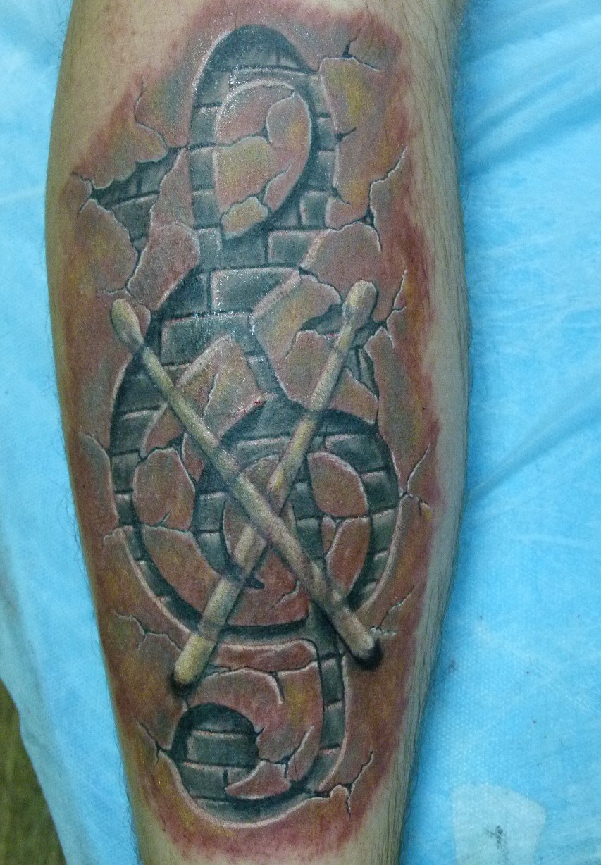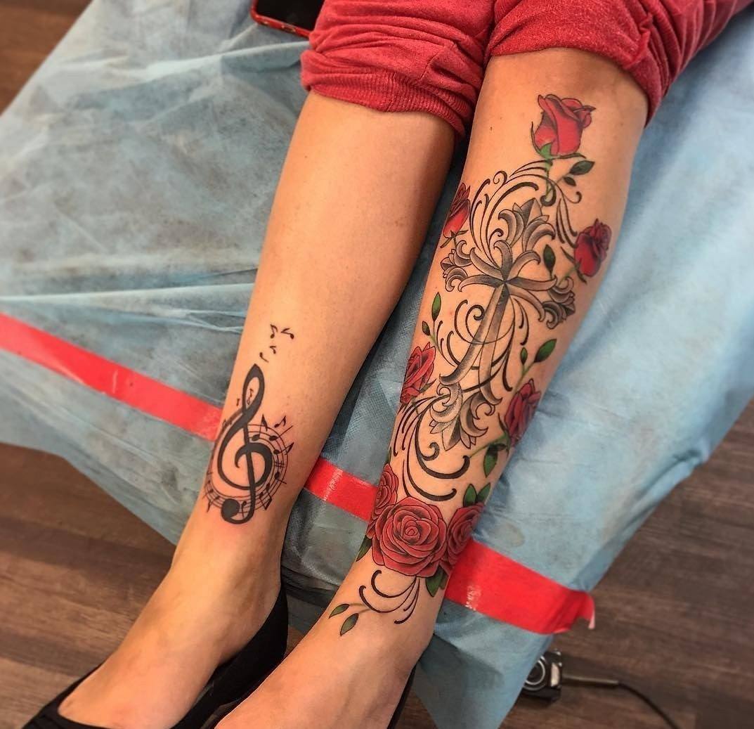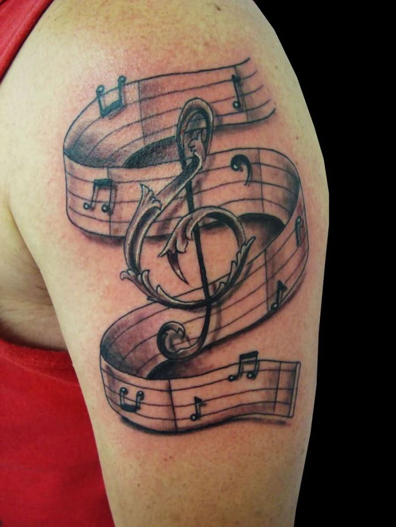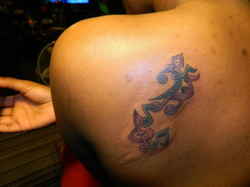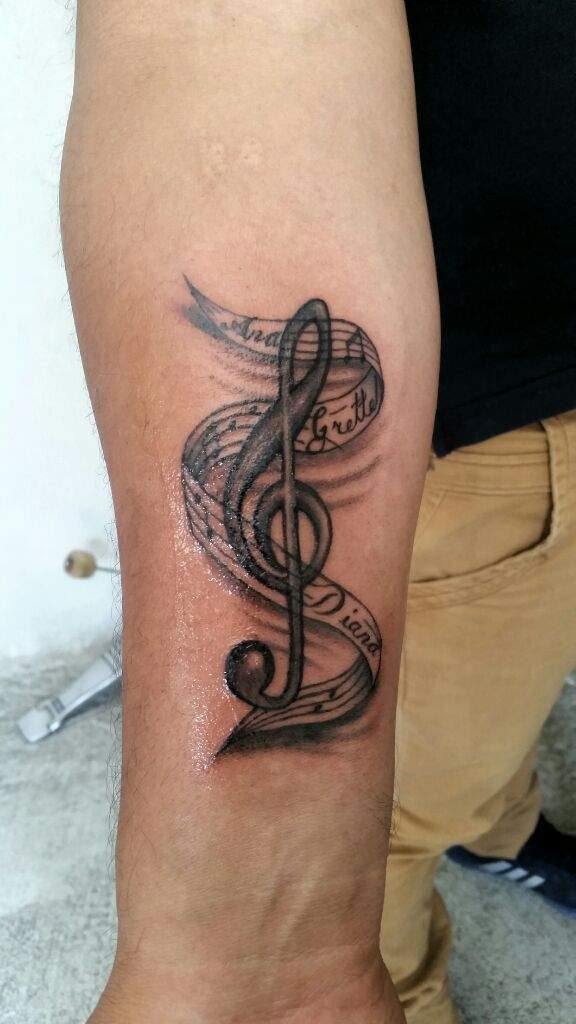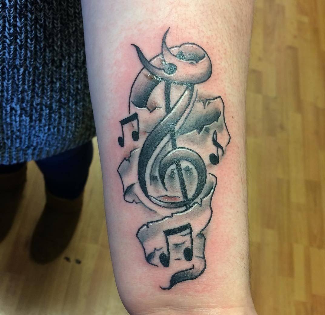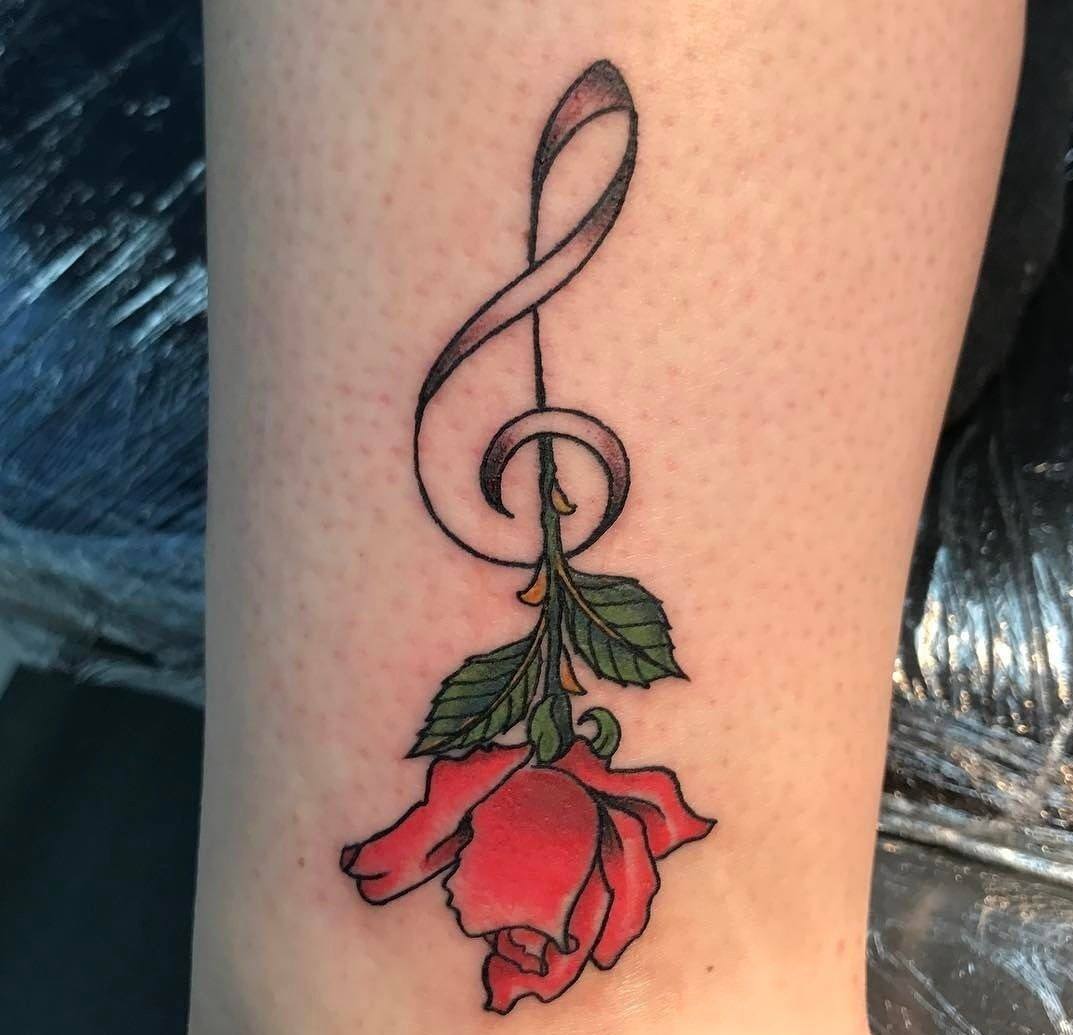 Chacun a sûrement essayé de représenter une note de musique - un signe de clé de sol avec un geste de la main. Et cela dit encore une fois qu'il n'y a rien de compliqué dans l'image de ce signe, mais en même temps ça a l'air très envoûtant. Pas étonnant qu'aujourd'hui ce tatouage soit très populaire. Les filles qui utilisent cette image essaient de souligner leur tendresse et leur sexualité, ainsi que leur sexe plus fort - masculinité et originalité. Dans tous les cas, en choisissant un tatouage, assurez-vous de réfléchir à tous les détails du croquis et ne vous référez qu’aux tatoueurs professionnels.