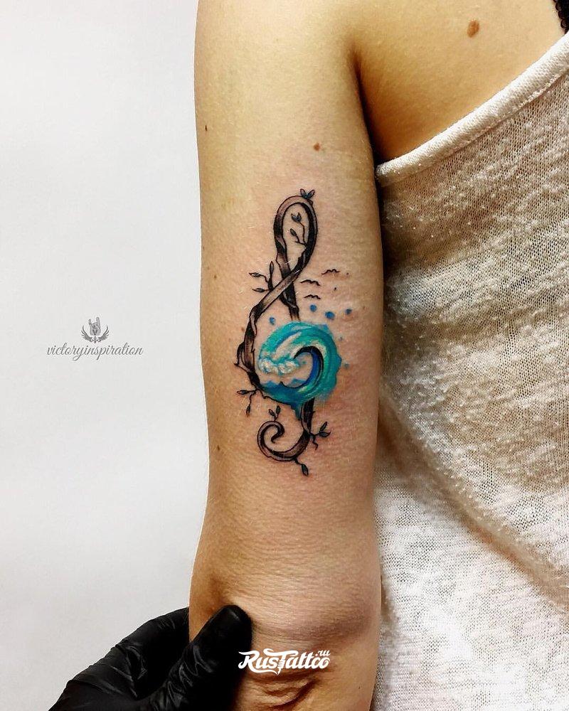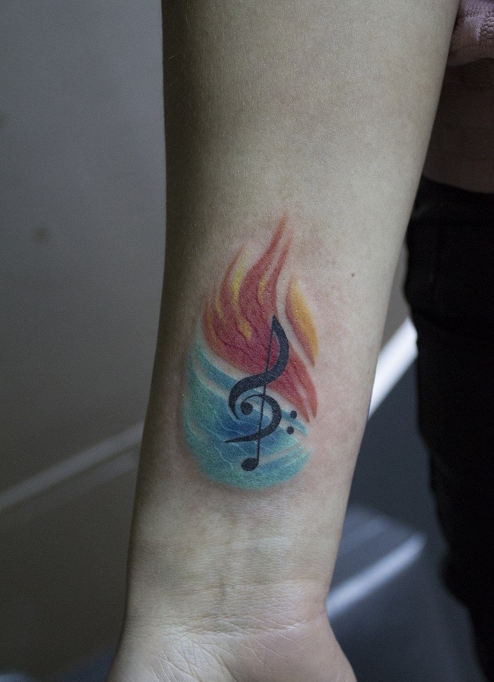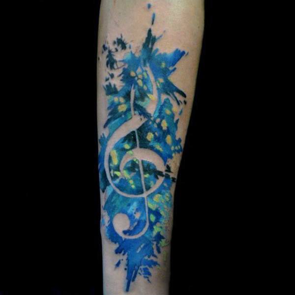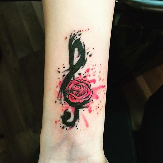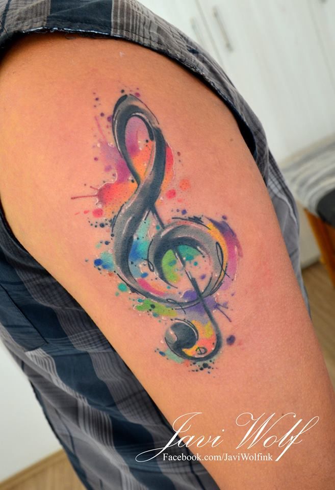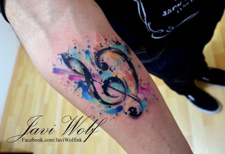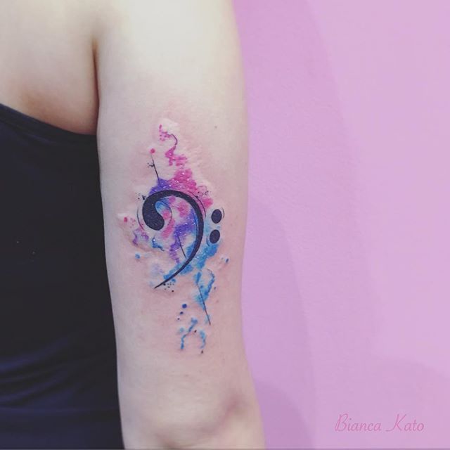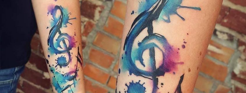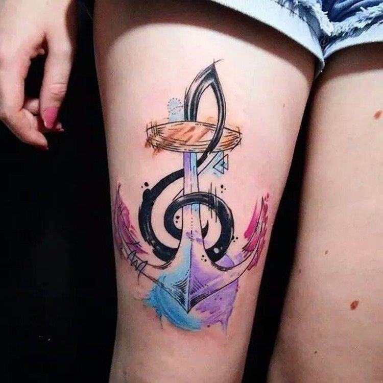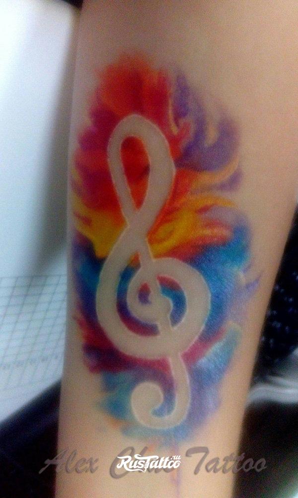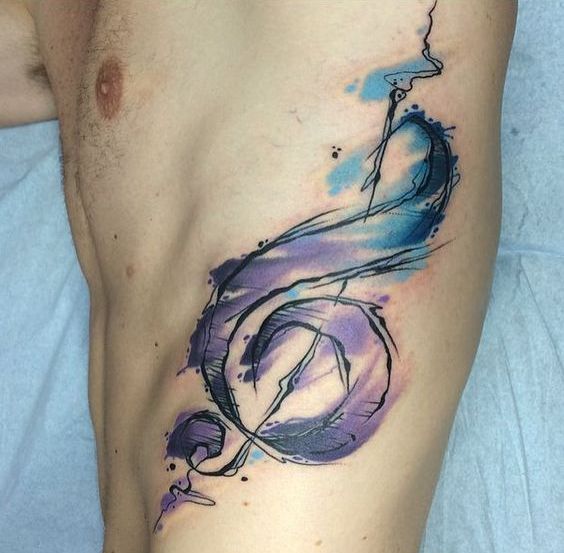 Le tatouage de la clé de sol dans le style de l'aquarelle est le plus souvent utilisé par le beau sexe. Complétant une telle image avec divers ajouts et en la réalisant dans une solution de couleur floue, le tatouage est vraiment attrayant. Le flou du dessin, tel un tatouage, appliqué avec des peintures à l'aquarelle, attirera certainement l'attention. Le plus important est de ne pas en faire trop avec les ajouts. La clé de sol est un motif complexe, complétez-le donc par de petits motifs.